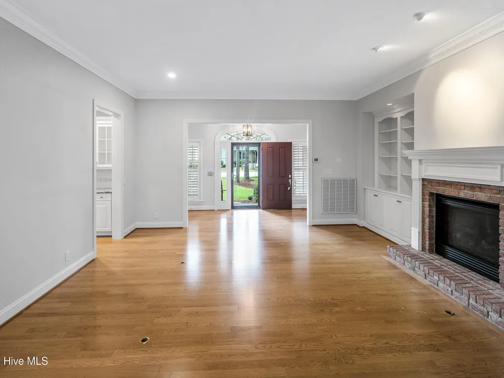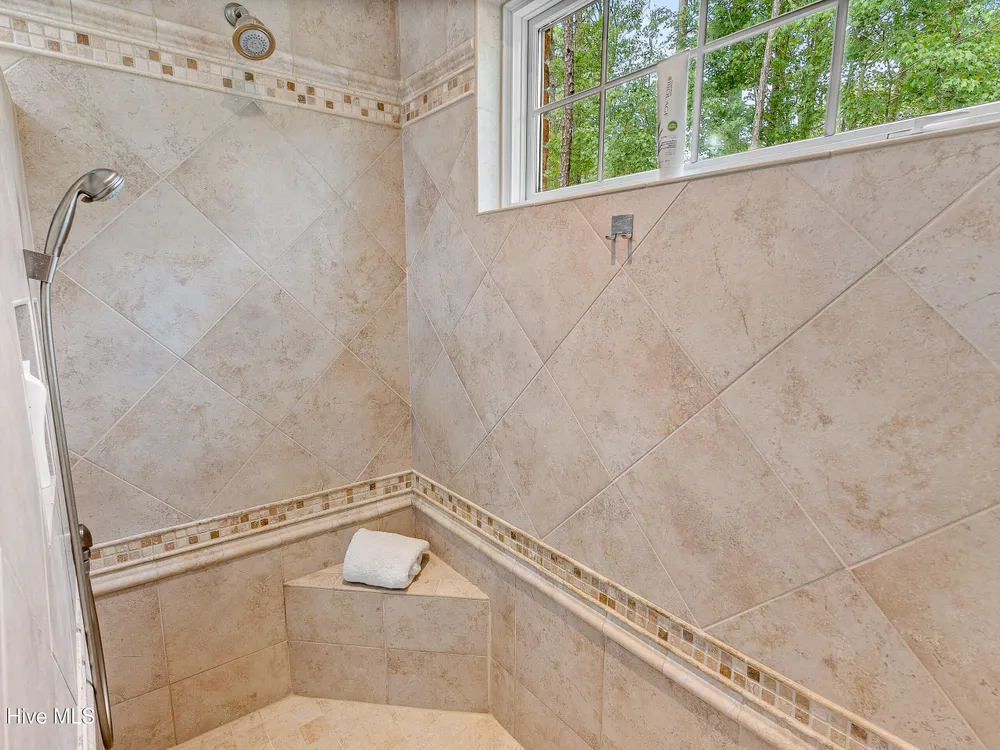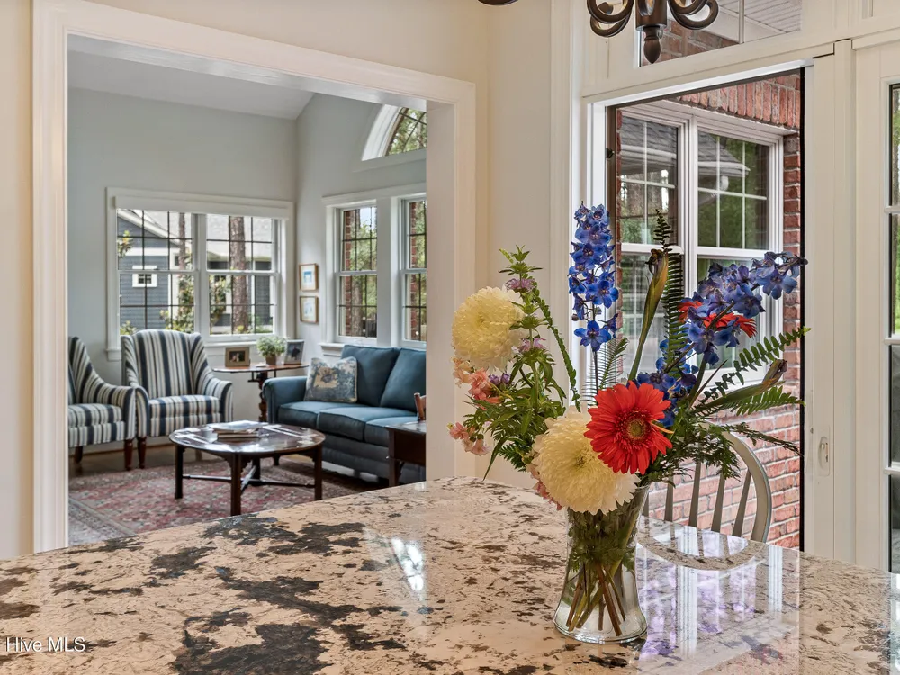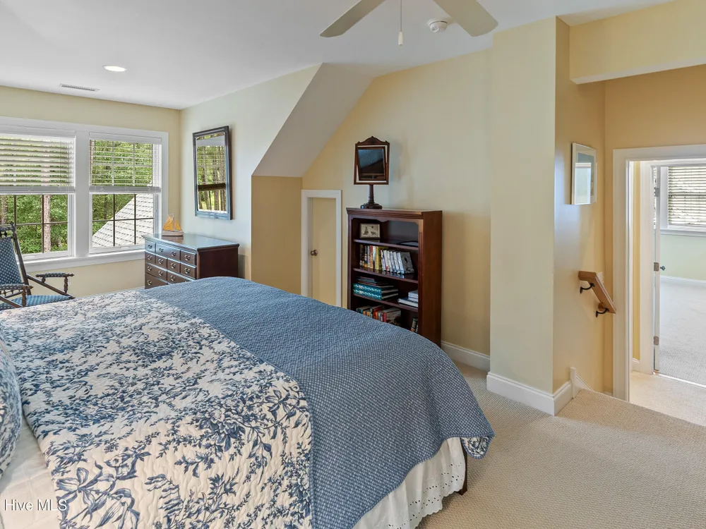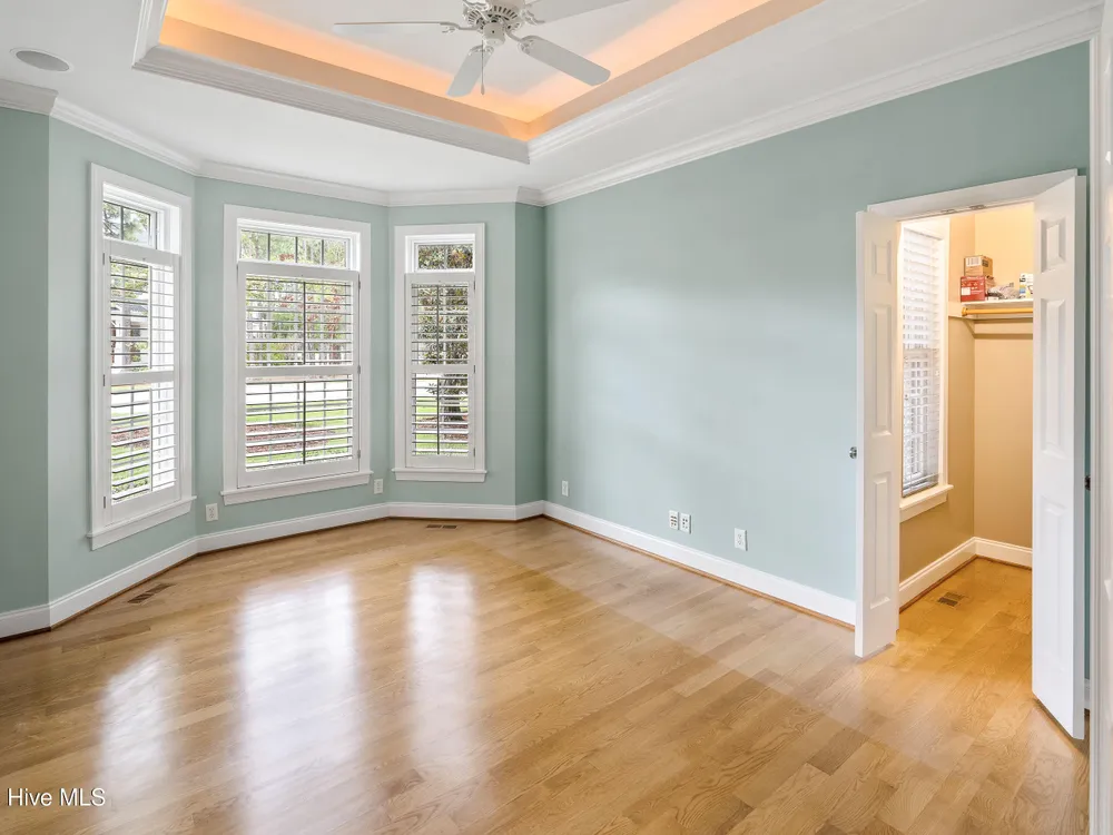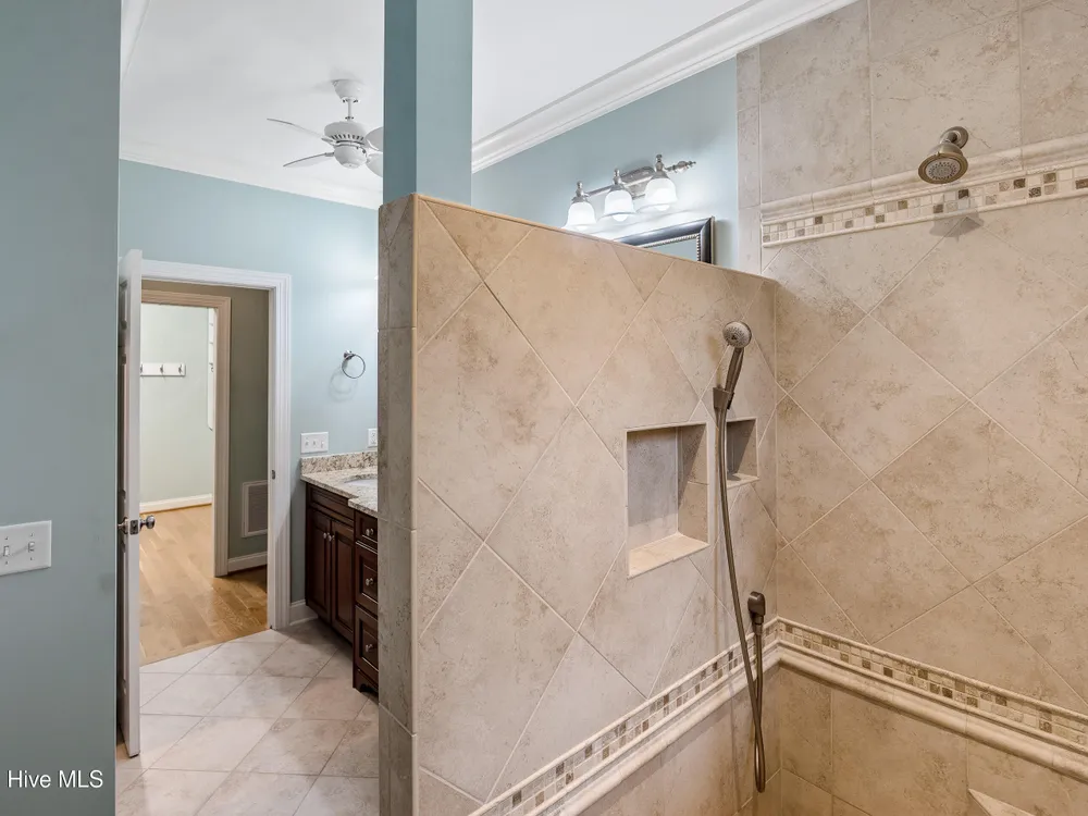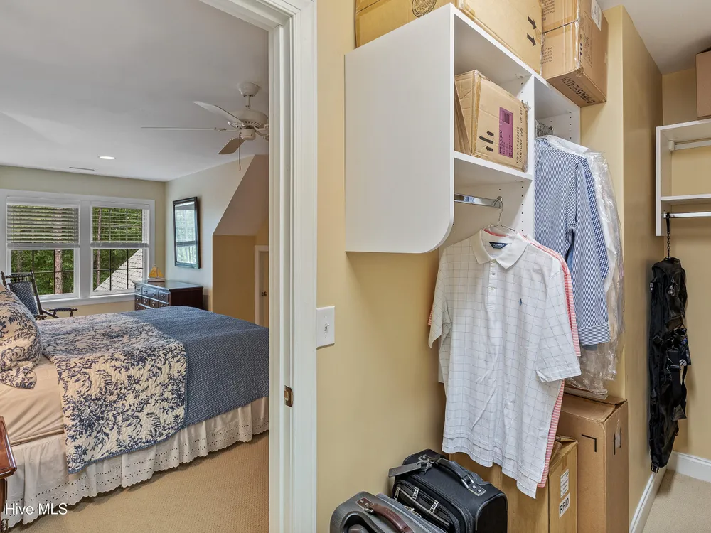 - Blinds/Shades, Solid Surface, Walk-In Closet(s), Walk-in Shower, Tray Ceiling(s), Entrance Foyer, Master Downstairs, Kitchen Island, High Ceilings, Gas Log, Ceiling Fan(s), Bookcases