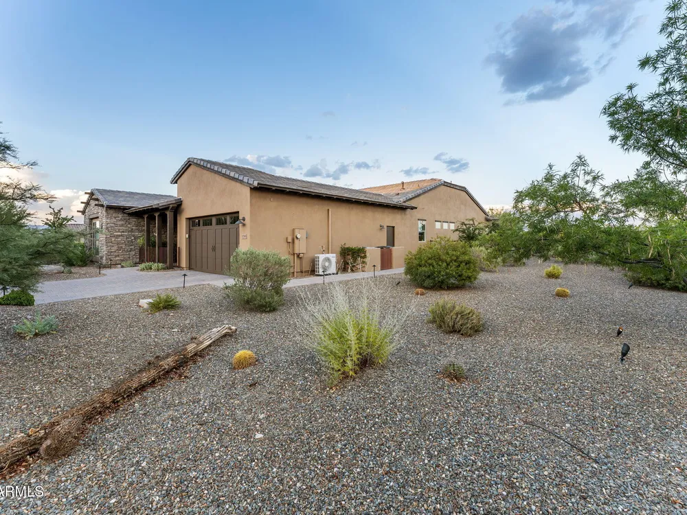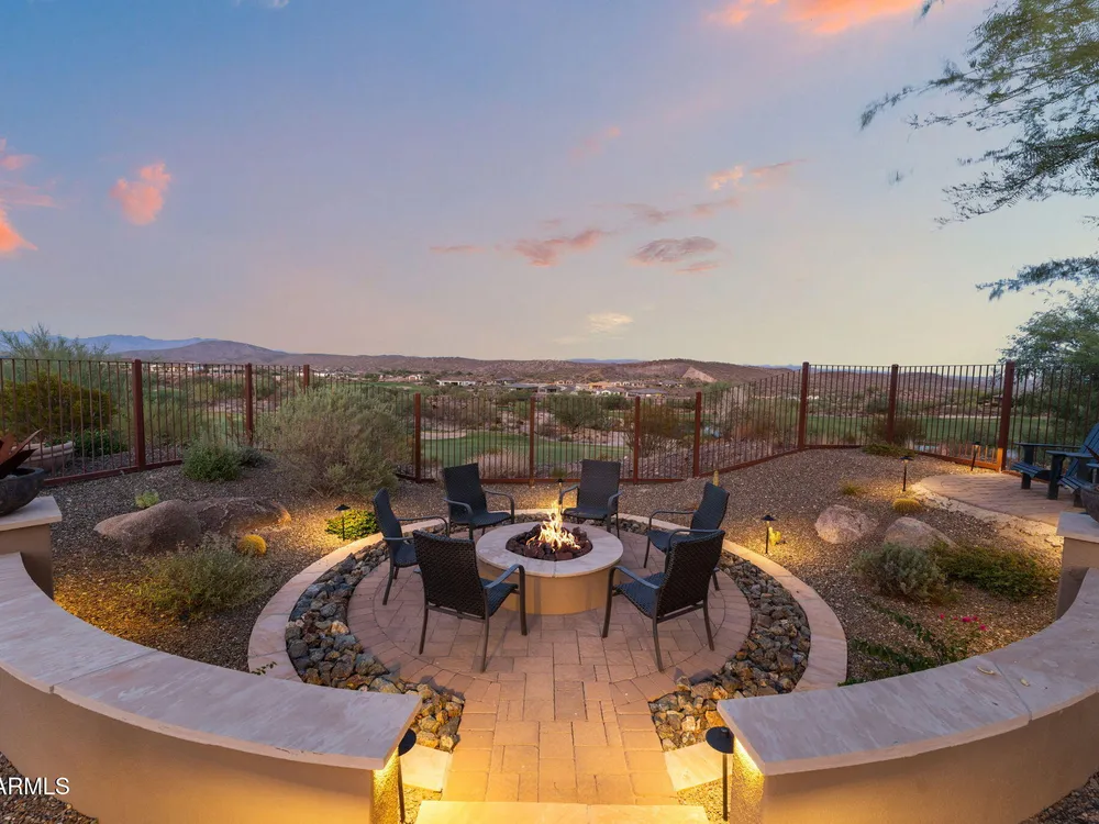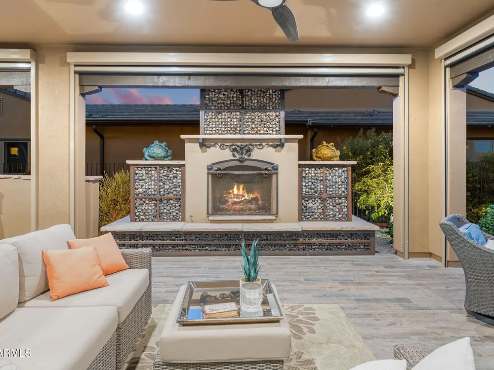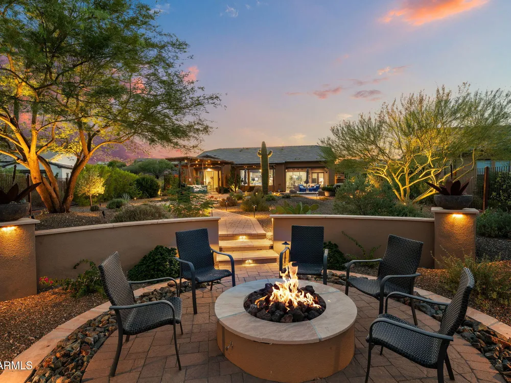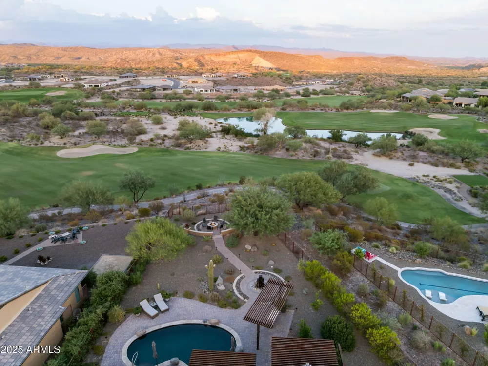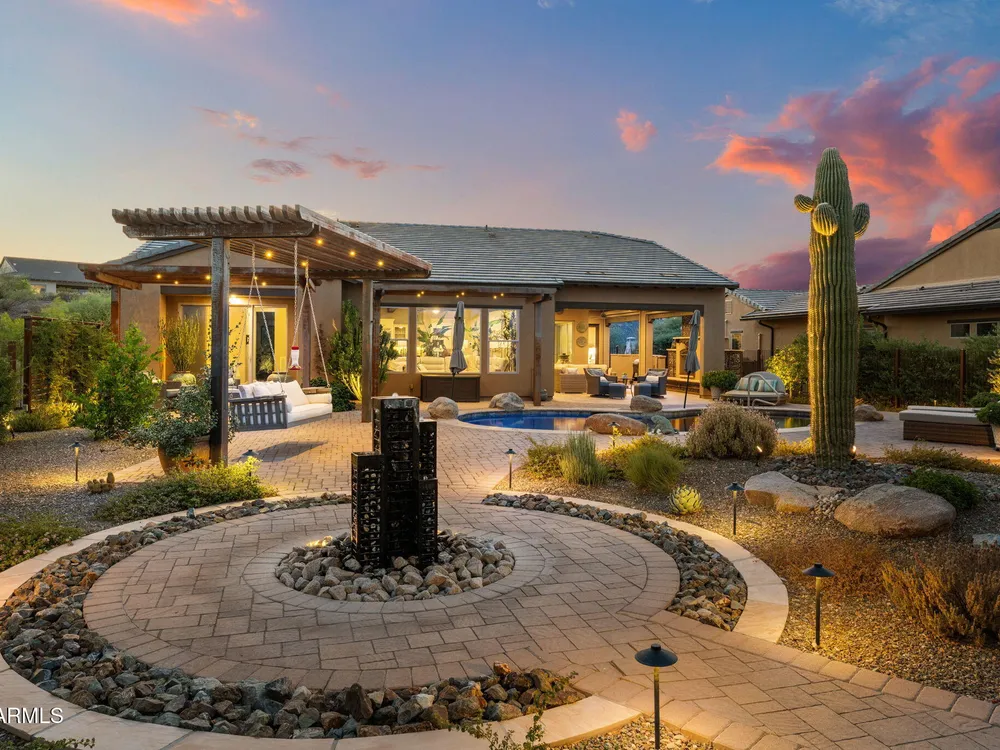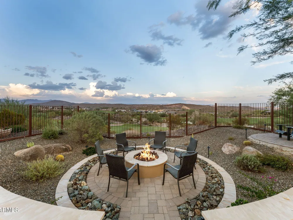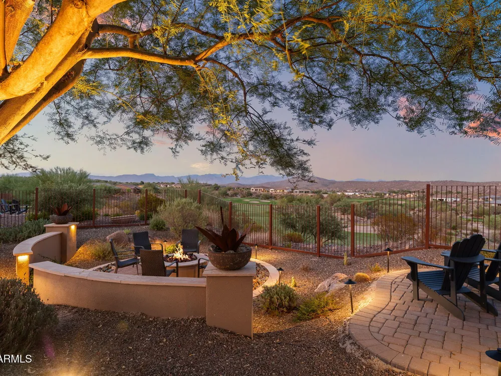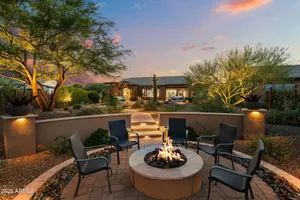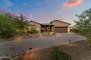 Welcome to luxury desert living in the heart of Wickenburg Ranch. This immaculate 3-bedroom, 3.5 bath home is perfectly positioned on an expansive, nearly half-acre lot overlooking the golf course-offering exceptional privacy, space and panoramic views. Designed for both comfort and elegance, the home features a detached guest casita w/full bath, ideal for hosting friends, extended family, or creating a private workspace. Inside, the open-concept layout has 10' ceilings, boasts a chef's kitchen w/granite counters, SS appliances, double ovens with a warming drawer, and a spacious great room that flows seamlessly to the oversized covered patio. The primary suite is a true retreat, complete w/split vanities, separate tub/shower and 2 closets. A dedicated den/office features custom built-in bookcase and wine fridge, offering a stylish & functional space ideal for working from home or unwinding with your favorite vintage. This rare offering combines custom interior features with a truly exceptional outdoor space making it one of the most desirable homes in all of WR. Step thru any of the multi-slide glass doors that seamlessly blend the indoor with the tranquil resort style backyard. Custom built fireplace, pool, firepit and water feature offers a luxurious and inviting outdoor retreat, perfectly designed for relaxation, entertainment and enjoying the magnificent views of the golf course.
