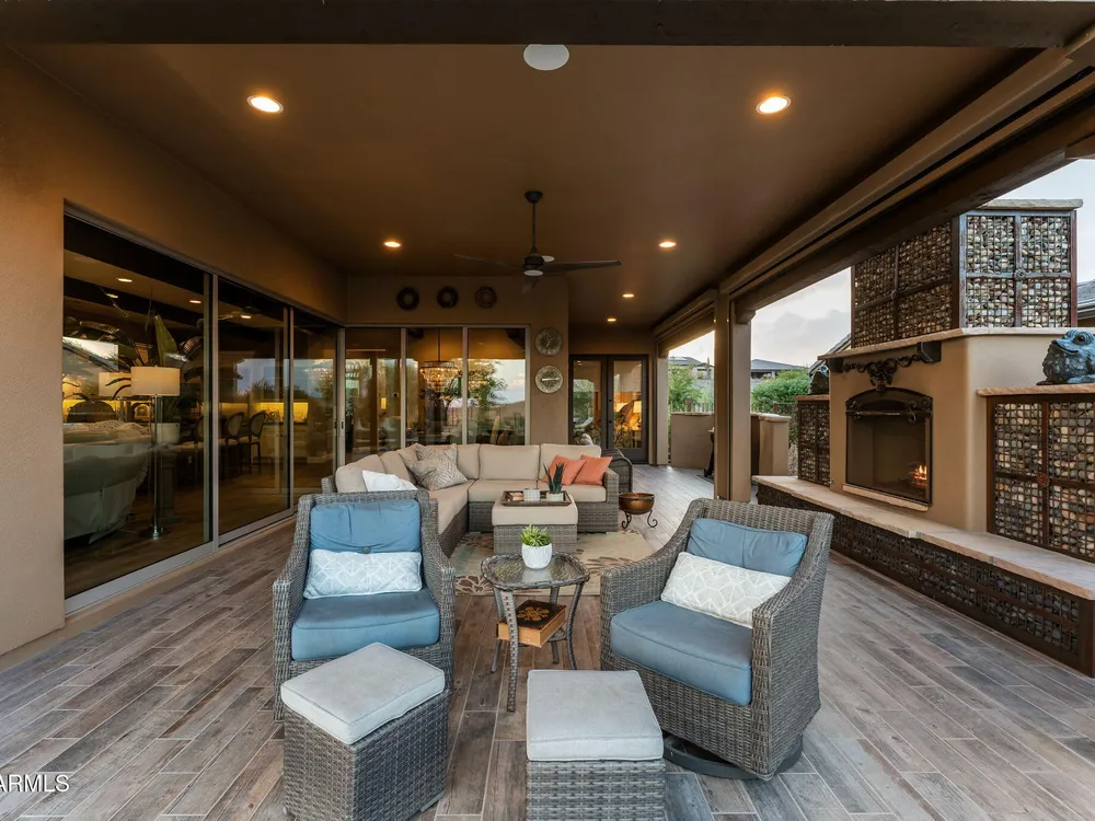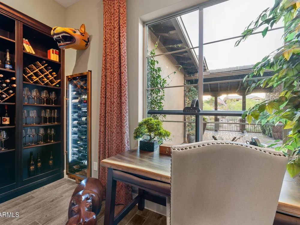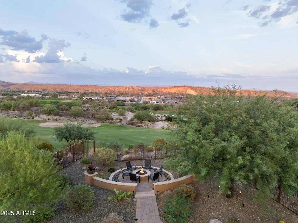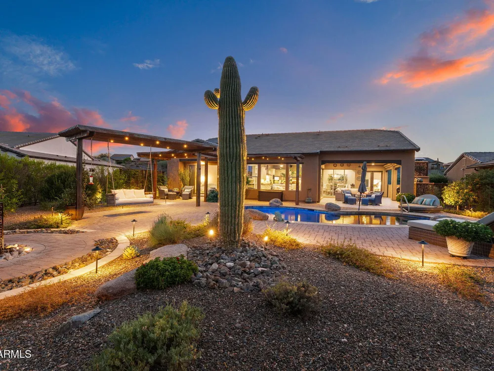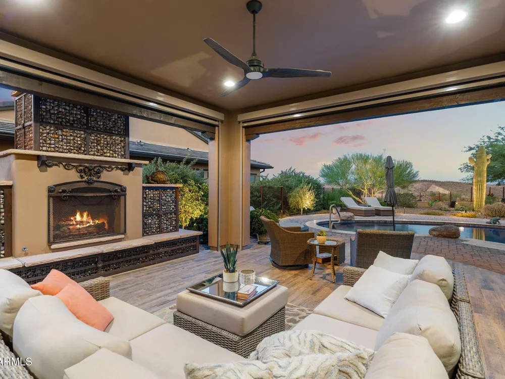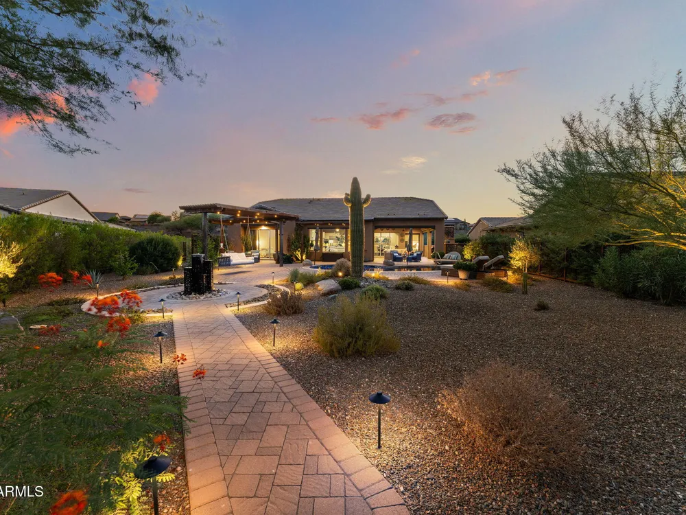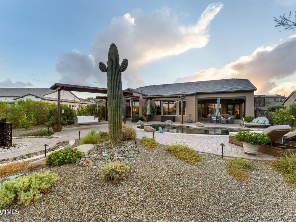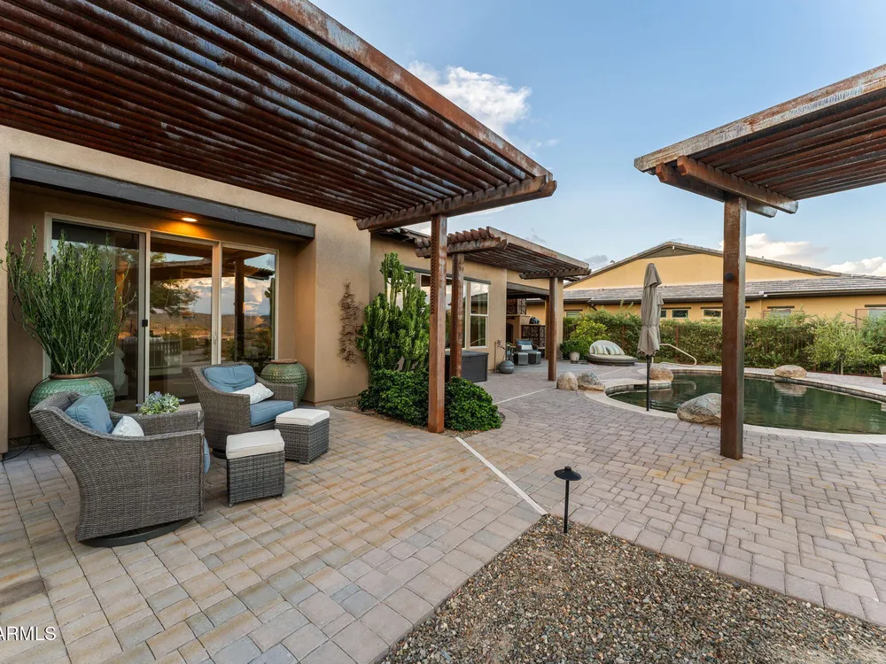 Welcome to luxury desert living in the heart of Wickenburg Ranch. This immaculate 3-bedroom, 3.5 bath home is perfectly positioned on an expansive, nearly half-acre lot overlooking the golf course-offering exceptional privacy, space and panoramic views. Designed for both comfort and elegance, the home features a detached guest casita w/full bath, ideal for hosting friends, extended family, or creating a private workspace. Inside, the open-concept layout has 10' ceilings, boasts a chef's kitchen w/granite counters, SS appliances, double ovens with a warming drawer, and a spacious great room that flows seamlessly to the oversized covered patio. The primary suite is a true retreat, complete w/split vanities, separate tub/shower and 2 closets. A dedicated den/office features custom built-in bookcase and wine fridge, offering a stylish & functional space ideal for working from home or unwinding with your favorite vintage. This rare offering combines custom interior features with a truly exceptional outdoor space making it one of the most desirable homes in all of WR. Step thru any of the multi-slide glass doors that seamlessly blend the indoor with the tranquil resort style backyard. Custom built fireplace, pool, firepit and water feature offers a luxurious and inviting outdoor retreat, perfectly designed for relaxation, entertainment and enjoying the magnificent views of the golf course.