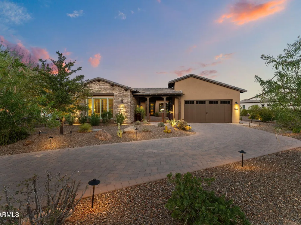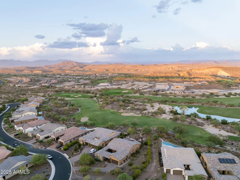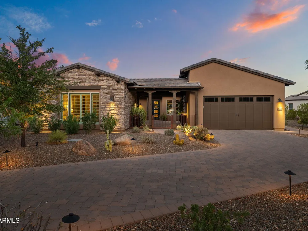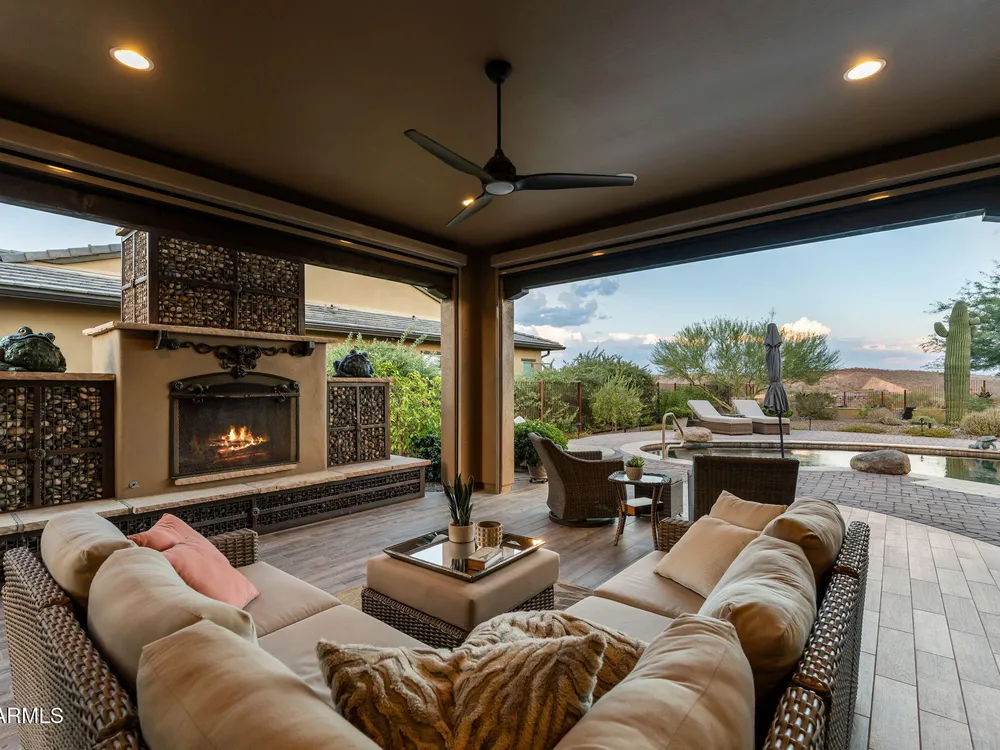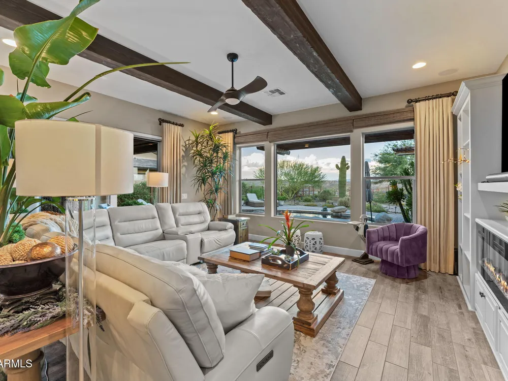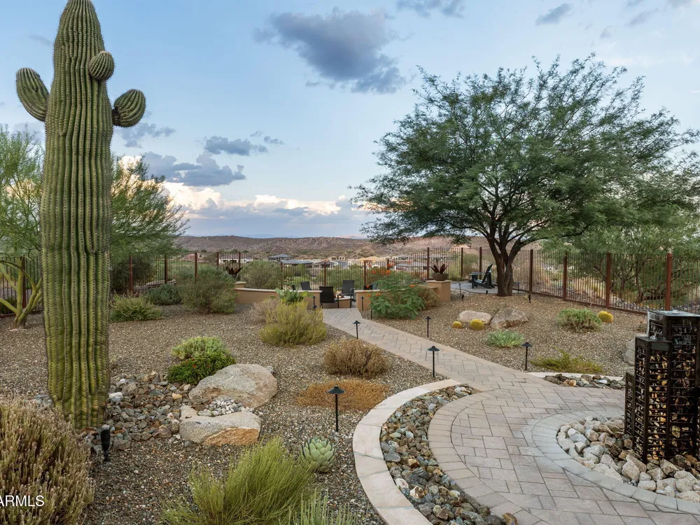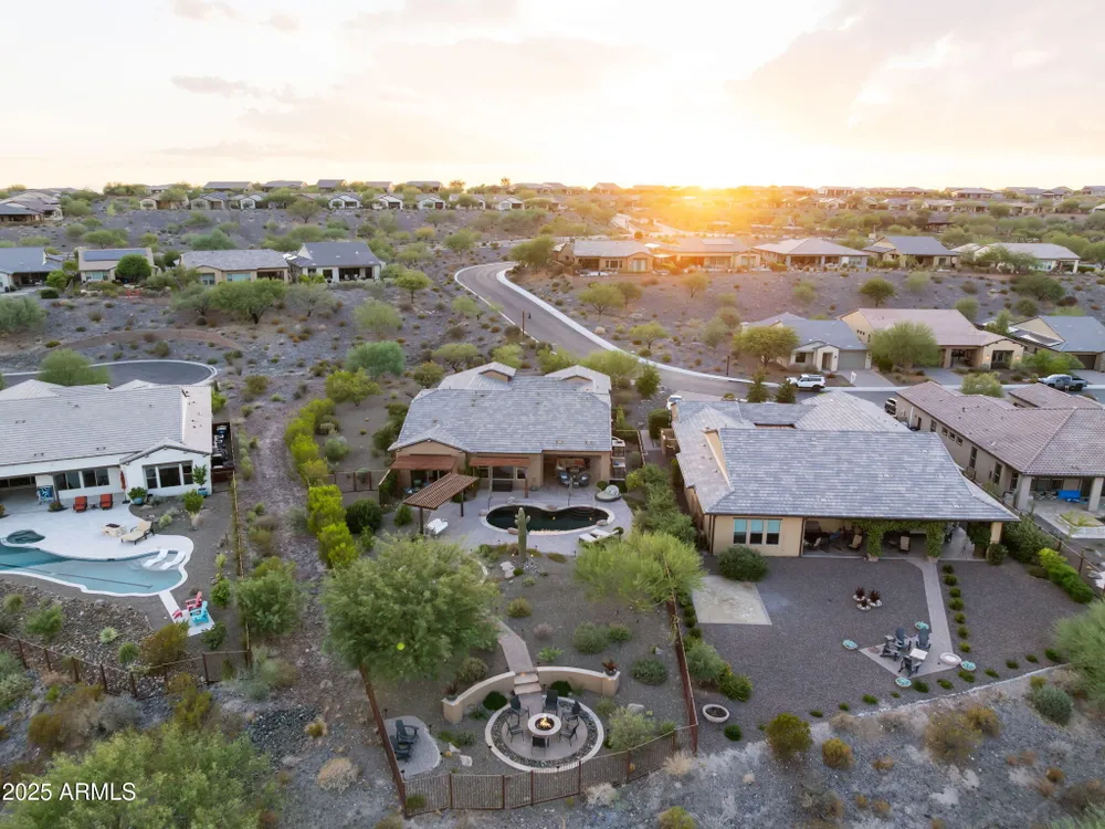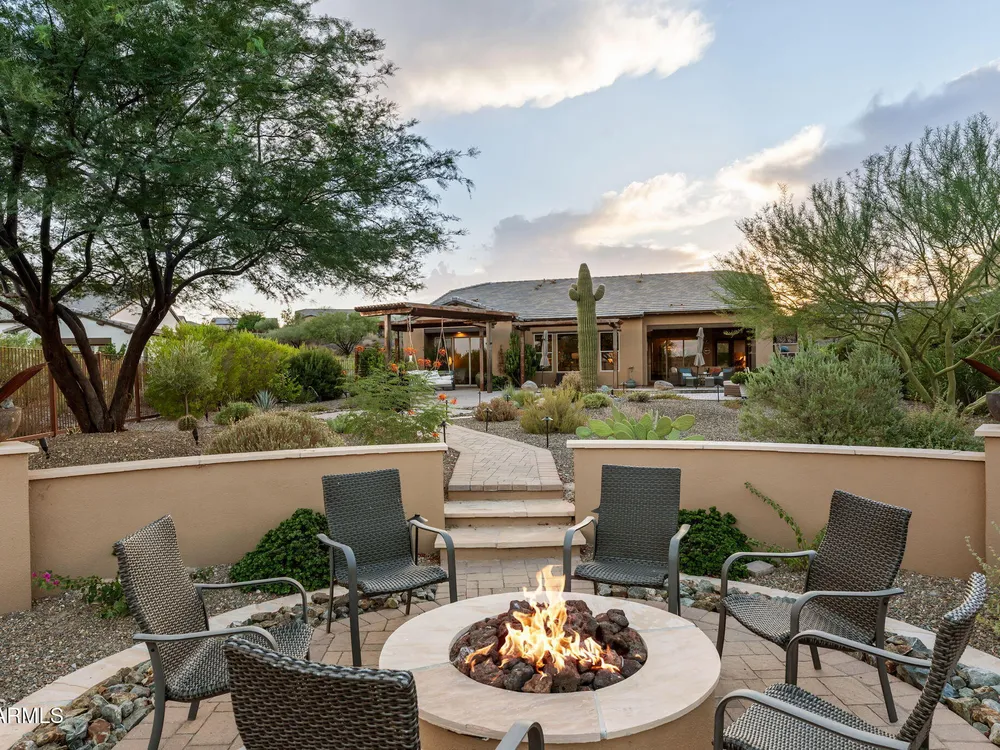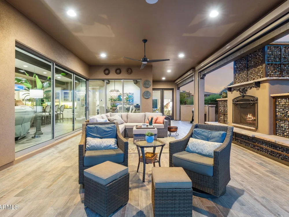 Welcome to luxury desert living in the heart of Wickenburg Ranch. This immaculate 3-bedroom, 3.5 bath home is perfectly positioned on an expansive, nearly half-acre lot overlooking the golf course-offering exceptional privacy, space and panoramic views. Designed for both comfort and elegance, the home features a detached guest casita w/full bath, ideal for hosting friends, extended family, or creating a private workspace. Inside, the open-concept layout has 10' ceilings, boasts a chef's kitchen w/granite counters, SS appliances, double ovens with a warming drawer, and a spacious great room that flows seamlessly to the oversized covered patio. The primary suite is a true retreat, complete w/split vanities, separate tub/shower and 2 closets. A dedicated den/office features custom built-in bookcase and wine fridge, offering a stylish & functional space ideal for working from home or unwinding with your favorite vintage. This rare offering combines custom interior features with a truly exceptional outdoor space making it one of the most desirable homes in all of WR. Step thru any of the multi-slide glass doors that seamlessly blend the indoor with the tranquil resort style backyard. Custom built fireplace, pool, firepit and water feature offers a luxurious and inviting outdoor retreat, perfectly designed for relaxation, entertainment and enjoying the magnificent views of the golf course.
