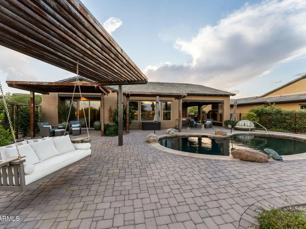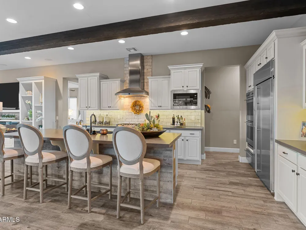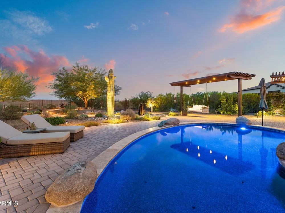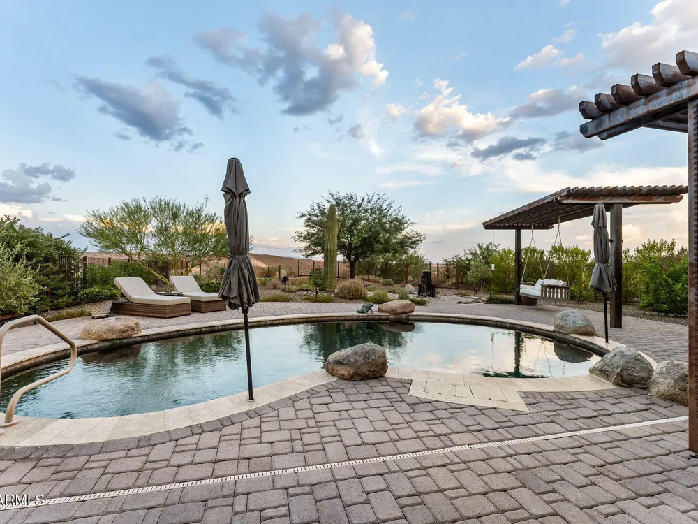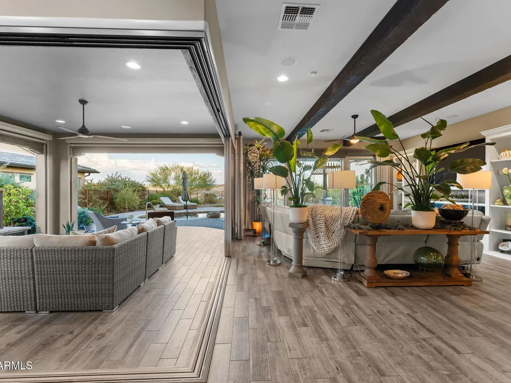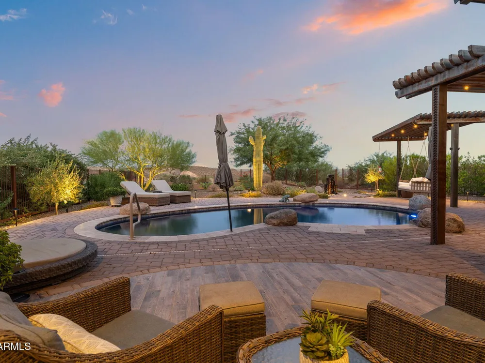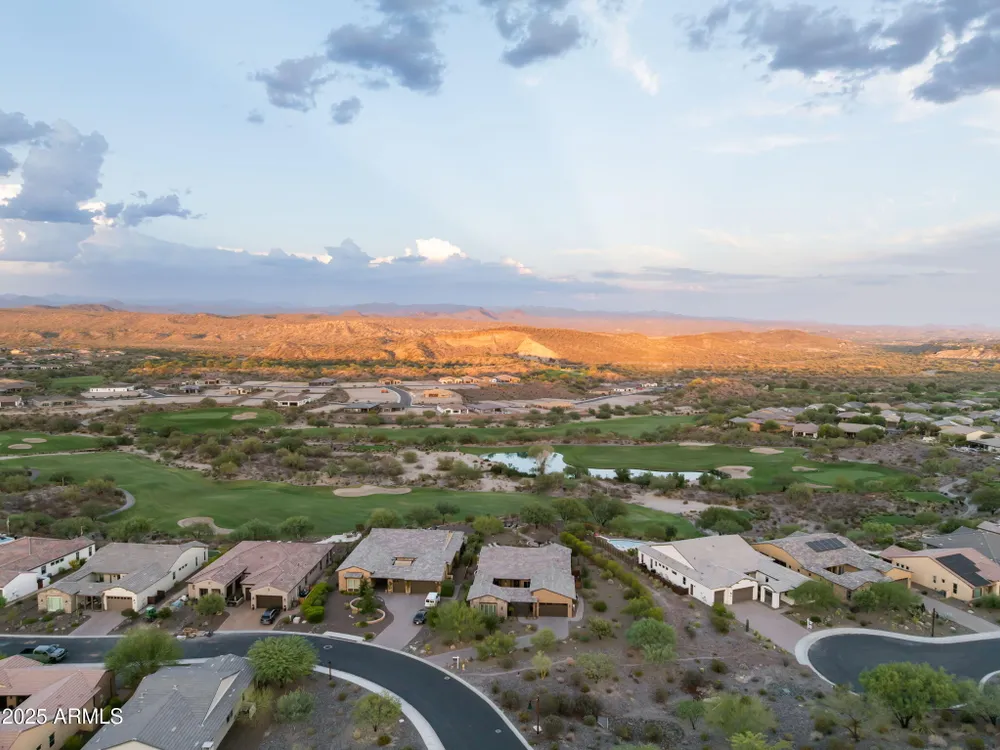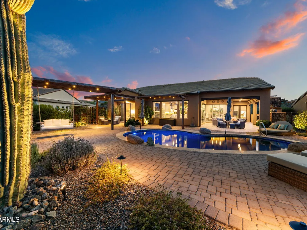 Welcome to luxury desert living in the heart of Wickenburg Ranch. This immaculate 3-bedroom, 3.5 bath home is perfectly positioned on an expansive, nearly half-acre lot overlooking the golf course-offering exceptional privacy, space and panoramic views. Designed for both comfort and elegance, the home features a detached guest casita w/full bath, ideal for hosting friends, extended family, or creating a private workspace. Inside, the open-concept layout has 10' ceilings, boasts a chef's kitchen w/granite counters, SS appliances, double ovens with a warming drawer, and a spacious great room that flows seamlessly to the oversized covered patio. The primary suite is a true retreat, complete w/split vanities, separate tub/shower and 2 closets. A dedicated den/office features custom built-in bookcase and wine fridge, offering a stylish & functional space ideal for working from home or unwinding with your favorite vintage. This rare offering combines custom interior features with a truly exceptional outdoor space making it one of the most desirable homes in all of WR. Step thru any of the multi-slide glass doors that seamlessly blend the indoor with the tranquil resort style backyard. Custom built fireplace, pool, firepit and water feature offers a luxurious and inviting outdoor retreat, perfectly designed for relaxation, entertainment and enjoying the magnificent views of the golf course.