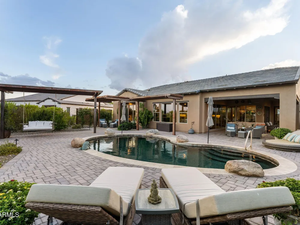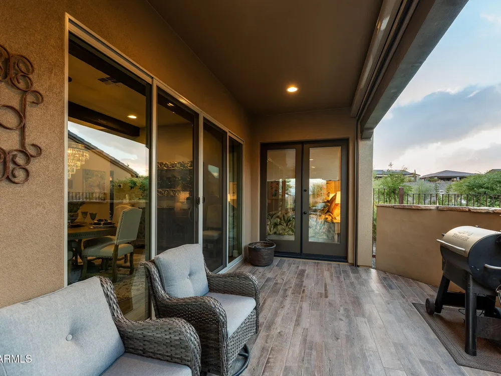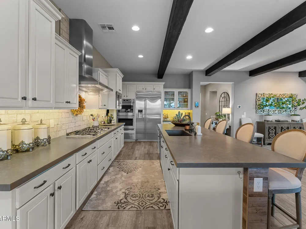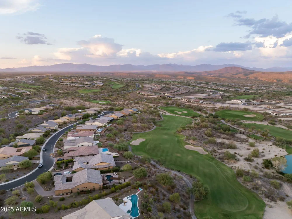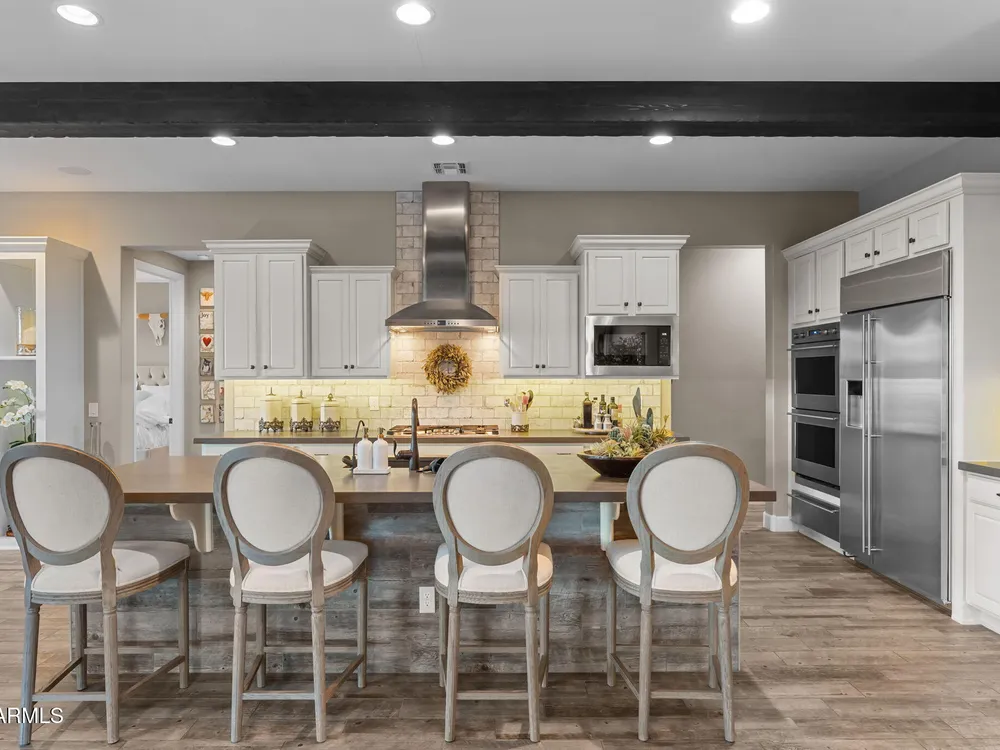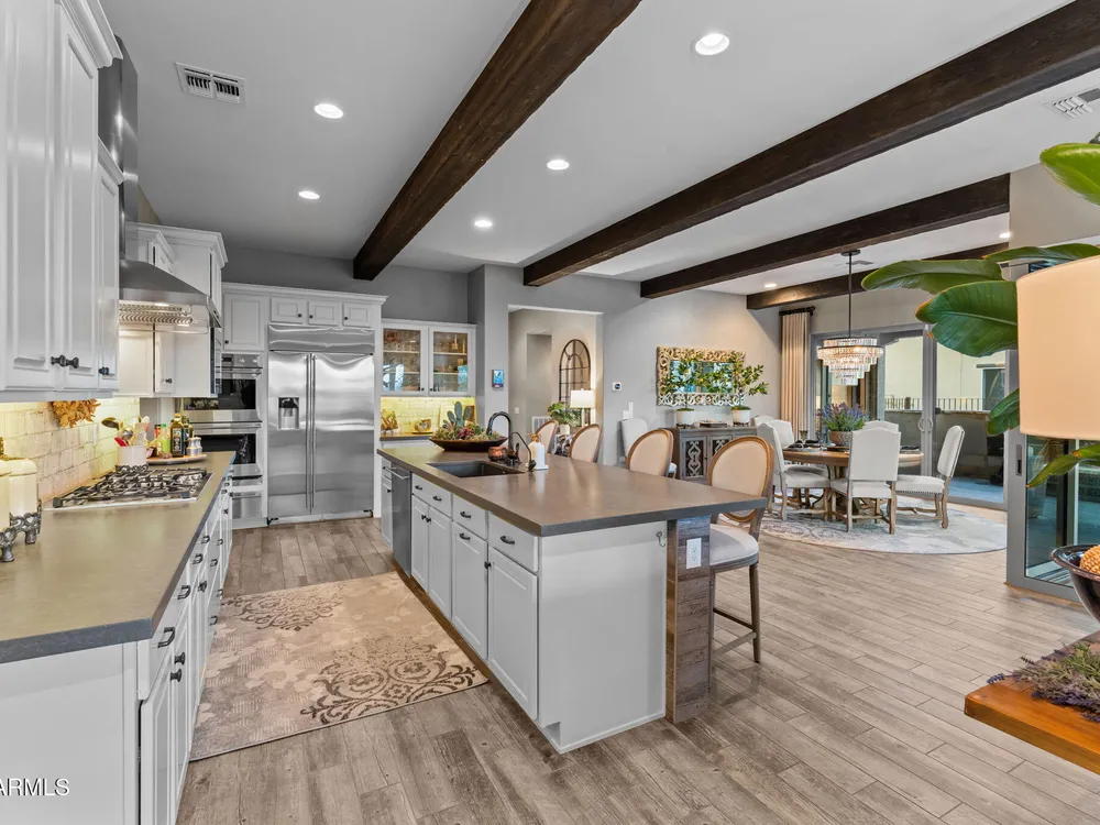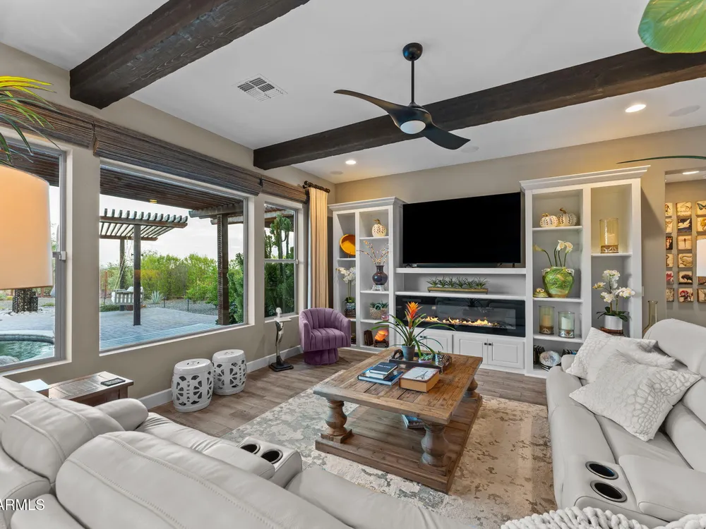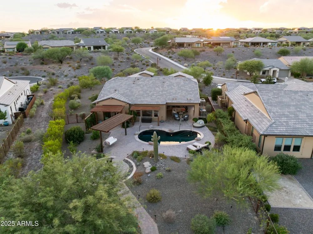 Welcome to luxury desert living in the heart of Wickenburg Ranch. This immaculate 3-bedroom, 3.5 bath home is perfectly positioned on an expansive, nearly half-acre lot overlooking the golf course-offering exceptional privacy, space and panoramic views. Designed for both comfort and elegance, the home features a detached guest casita w/full bath, ideal for hosting friends, extended family, or creating a private workspace. Inside, the open-concept layout has 10' ceilings, boasts a chef's kitchen w/granite counters, SS appliances, double ovens with a warming drawer, and a spacious great room that flows seamlessly to the oversized covered patio. The primary suite is a true retreat, complete w/split vanities, separate tub/shower and 2 closets. A dedicated den/office features custom built-in bookcase and wine fridge, offering a stylish & functional space ideal for working from home or unwinding with your favorite vintage. This rare offering combines custom interior features with a truly exceptional outdoor space making it one of the most desirable homes in all of WR. Step thru any of the multi-slide glass doors that seamlessly blend the indoor with the tranquil resort style backyard. Custom built fireplace, pool, firepit and water feature offers a luxurious and inviting outdoor retreat, perfectly designed for relaxation, entertainment and enjoying the magnificent views of the golf course.