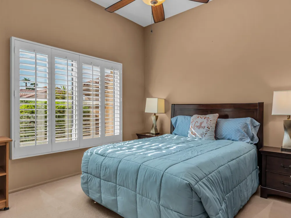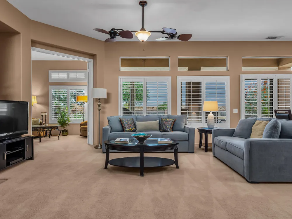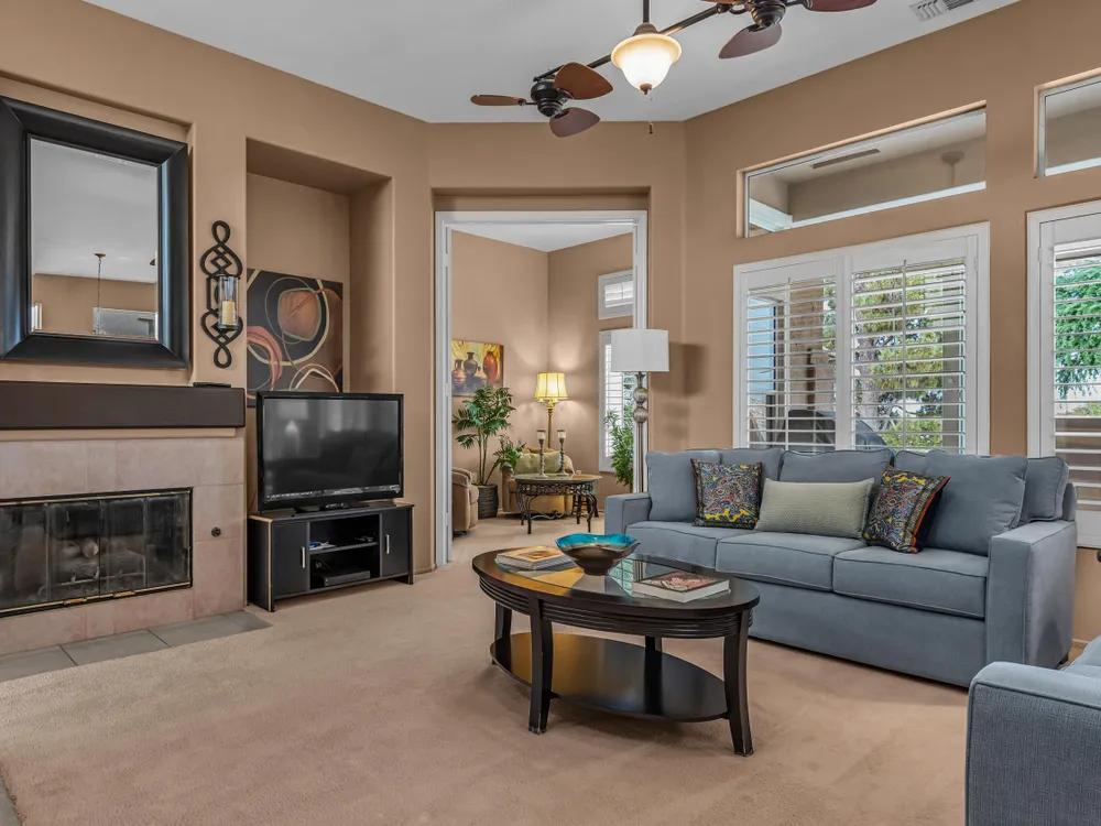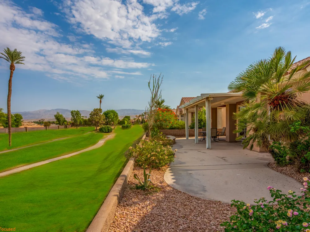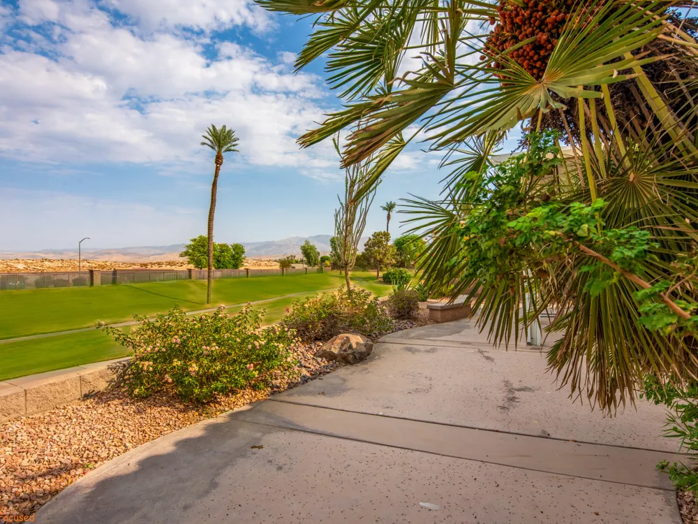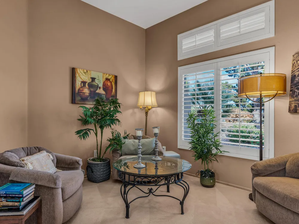Discover Sun City Palm Desert, Southern California's premier 55+ community with this fabulous Fostoria floor plan. Offered fully furnished (at no value) or unfurnished, this bright and airy residence boasts a seamless blend of functionality and comfort. This can be a great investment for seasonal or long term rental or as primary or second home. Enjoy the mesmerizing views from the spacious great room, which flows effortlessly into the den. Country-style kitchen with stainless steel appliances with newer stove and microwave, overlooks the dining area, perfect for casual meals and entertaining. Good separation of bedrooms with the Primary bedroom providing a bay window with greenbelt views, a walk-in closet, dual sinks, a separate tub, and a shower. The guest bedroom overlooks the charming courtyard and is conveniently close to the guest bathroom. Private courtyard offers your own serene outdoor space, as well as an extensive back yard patio with aluma-wood cover offering picturesque views of the lush greenbelt and the stunning San Jacinto Mountains. Plantation shutters on most windows adding to the home's look and enhancing privacy and light control. Also features utility room off the kitchen, a double car garage with storage cabinets, in-garage laundry area , and a newer AC unit (2022). Community offers 2 golf courses, 3 club houses, pools/spas, restaurants, pickle ball, bocce ball and so much more!