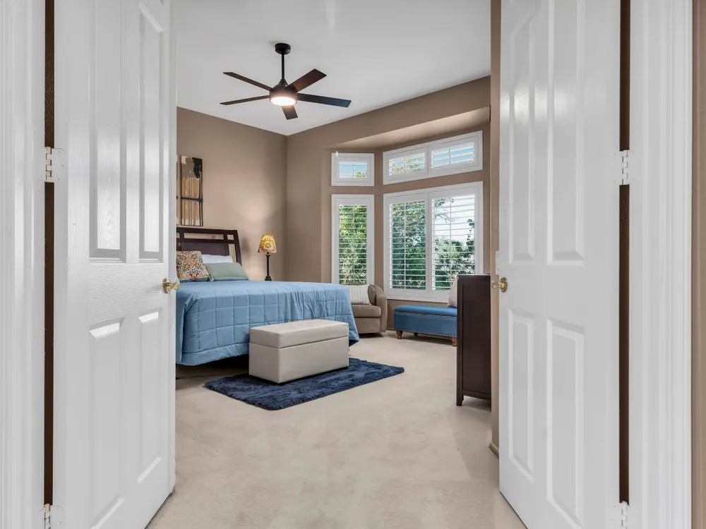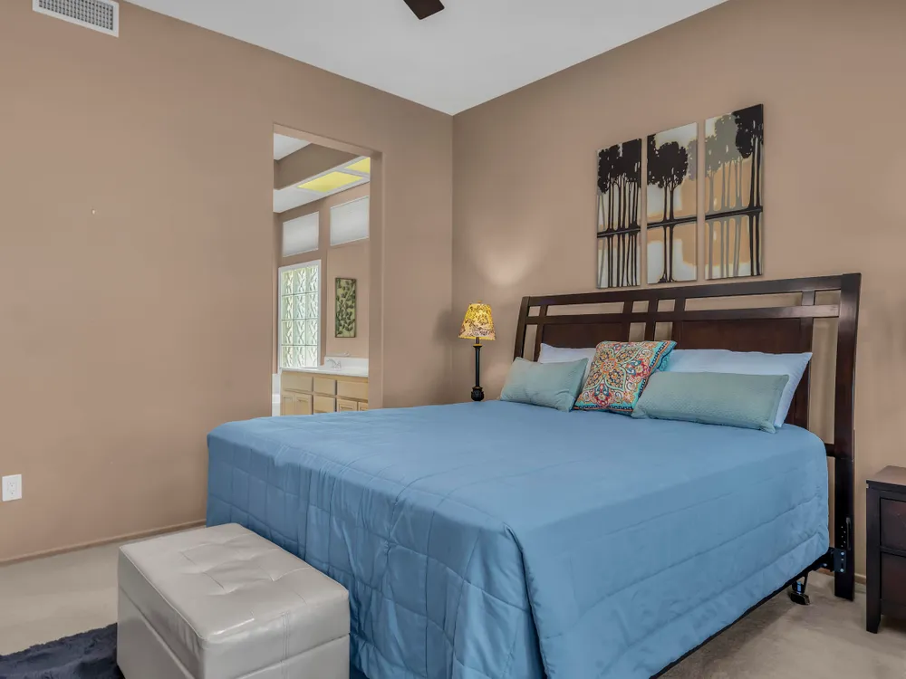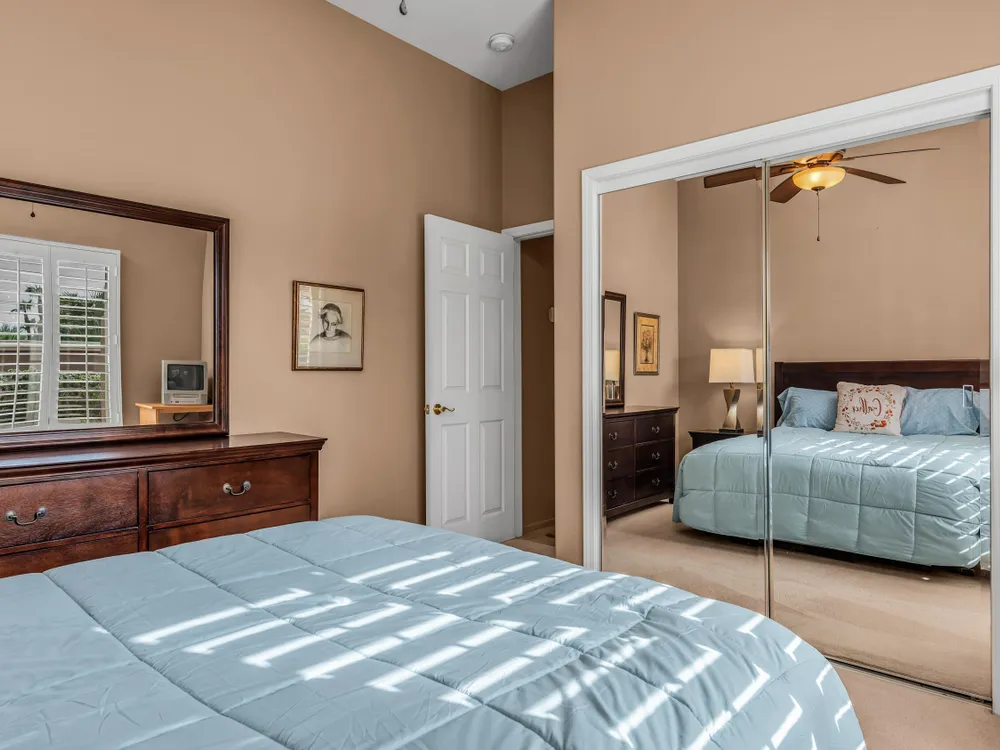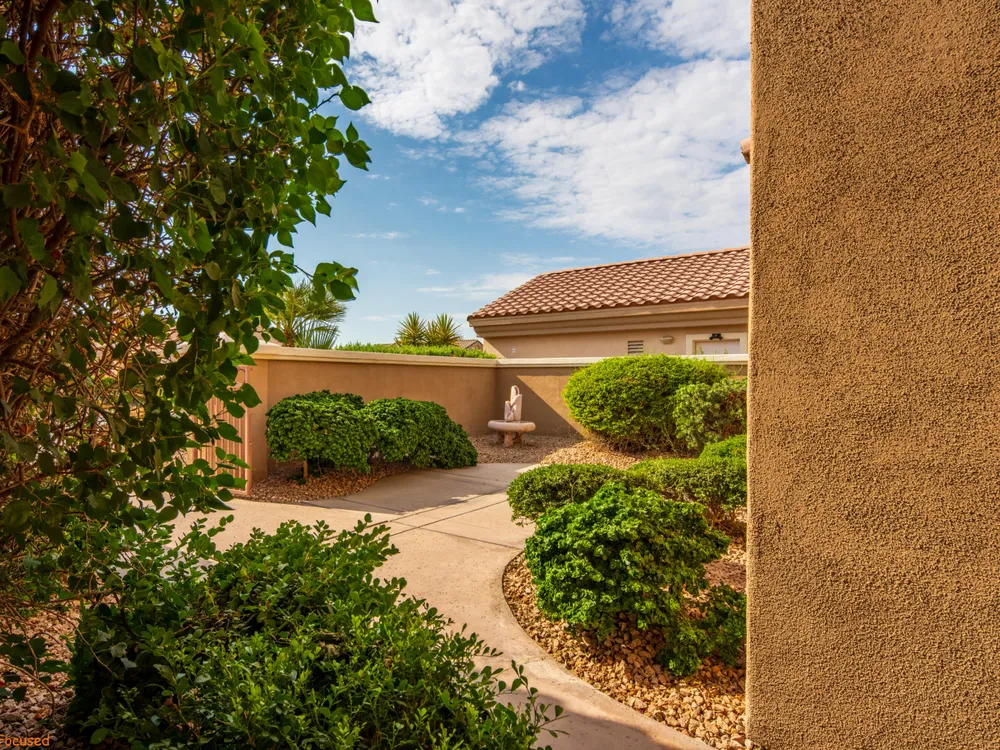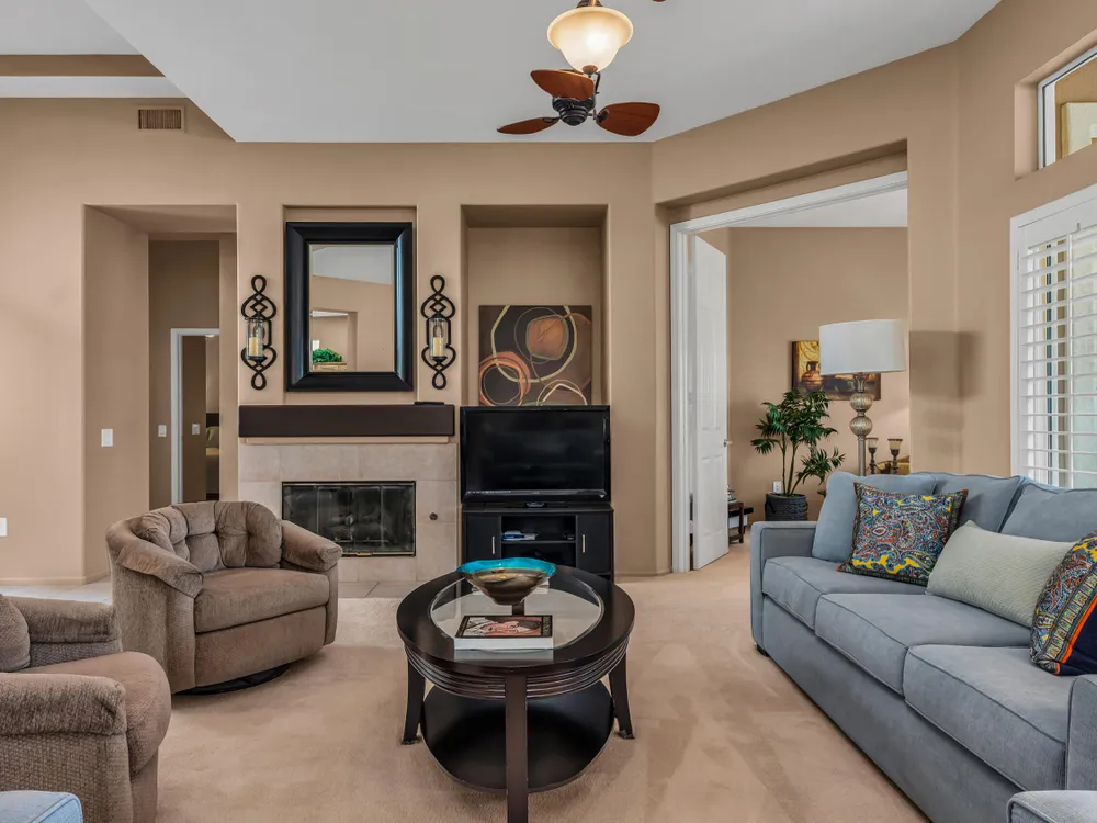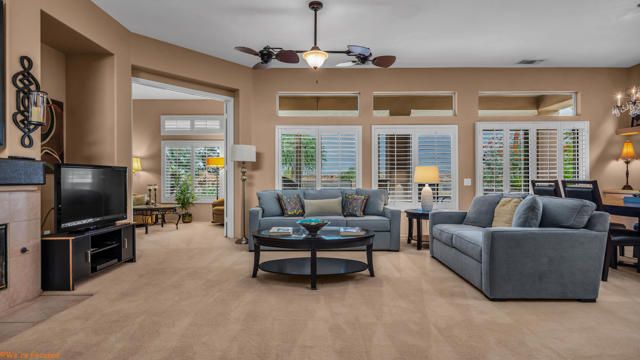 Discover Sun City Palm Desert, Southern California's premier 55+ community with this fabulous Fostoria floor plan. Offered fully furnished (at no value) or unfurnished, this bright and airy residence boasts a seamless blend of functionality and comfort. This can be a great investment for seasonal or long term rental or as primary or second home. Enjoy the mesmerizing views from the spacious great room, which flows effortlessly into the den. Country-style kitchen with stainless steel appliances with newer stove and microwave, overlooks the dining area, perfect for casual meals and entertaining. Good separation of bedrooms with the Primary bedroom providing a bay window with greenbelt views, a walk-in closet, dual sinks, a separate tub, and a shower. The guest bedroom overlooks the charming courtyard and is conveniently close to the guest bathroom. Private courtyard offers your own serene outdoor space, as well as an extensive back yard patio with aluma-wood cover offering picturesque views of the lush greenbelt and the stunning San Jacinto Mountains. Plantation shutters on most windows adding to the home's look and enhancing privacy and light control. Also features utility room off the kitchen, a double car garage with storage cabinets, in-garage laundry area , and a newer AC unit (2022). Community offers 2 golf courses, 3 club houses, pools/spas, restaurants, pickle ball, bocce ball and so much more!
