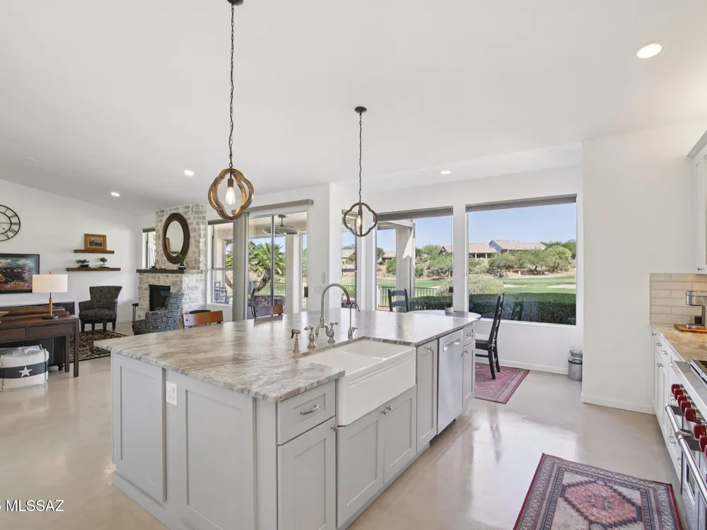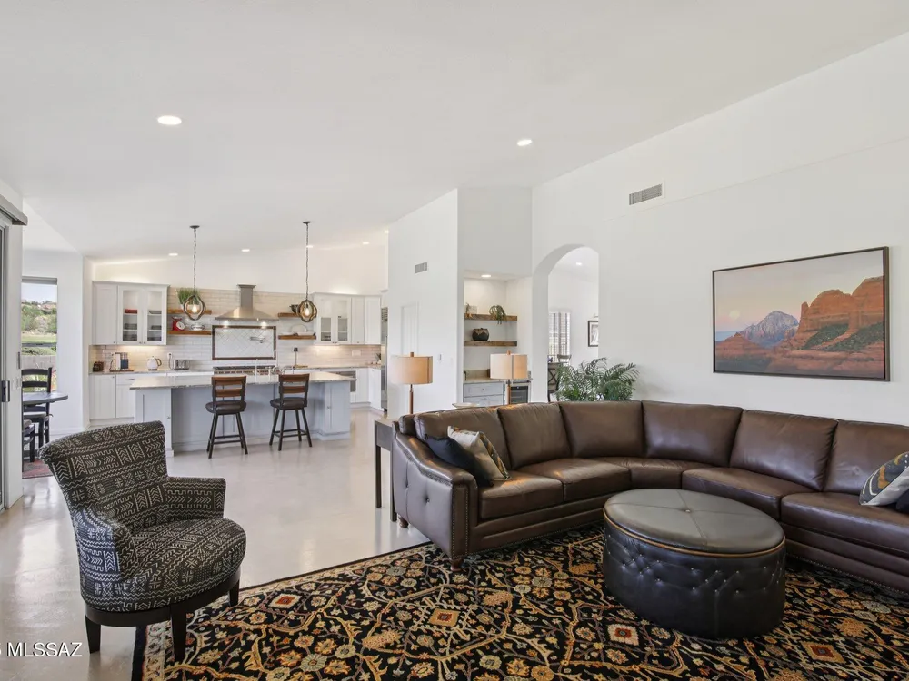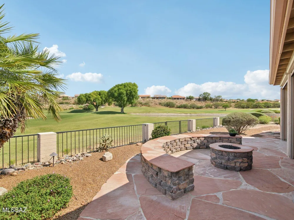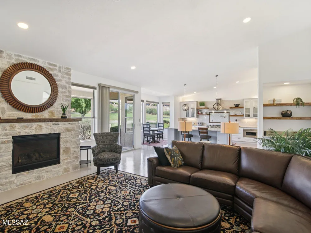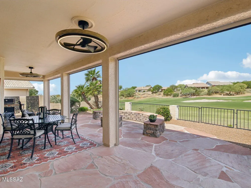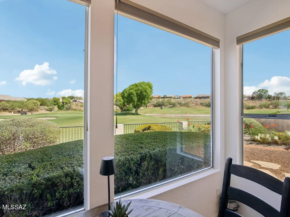 Are you looking for the ultimate Saddlebrooke home that offers views, privacy and contemporary style...then don't miss this home. Absolutely stunning Galleria has been completely remodeled from top to bottom. Situated on the 3rd green of the Tucson nine of the 27-hole Saddlebrooke Golf Course, this home is a rare find. Watch the wildlife go by as you take advantage of golf course and lake views, multiple outdoor living areas, large covered patio, new electric sunshades and outdoor firepit with flagstone patio. Home is safely distanced from the large green so you can relax and enjoy golfers line up and drain their putts. As you step inside you are greeted by a bright airy interior with vaulted ceilings, concrete floors throughout, and large pictures windows that flood the home with light.