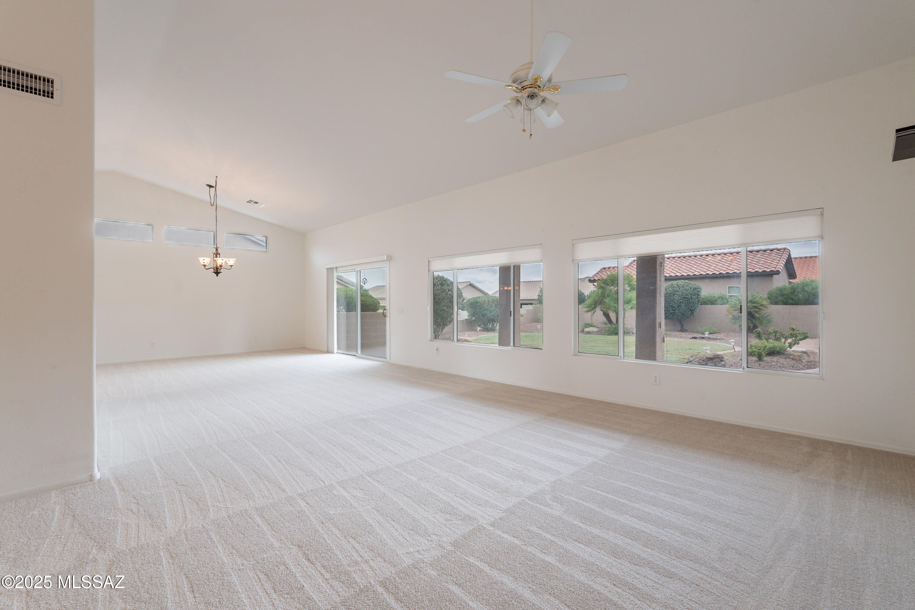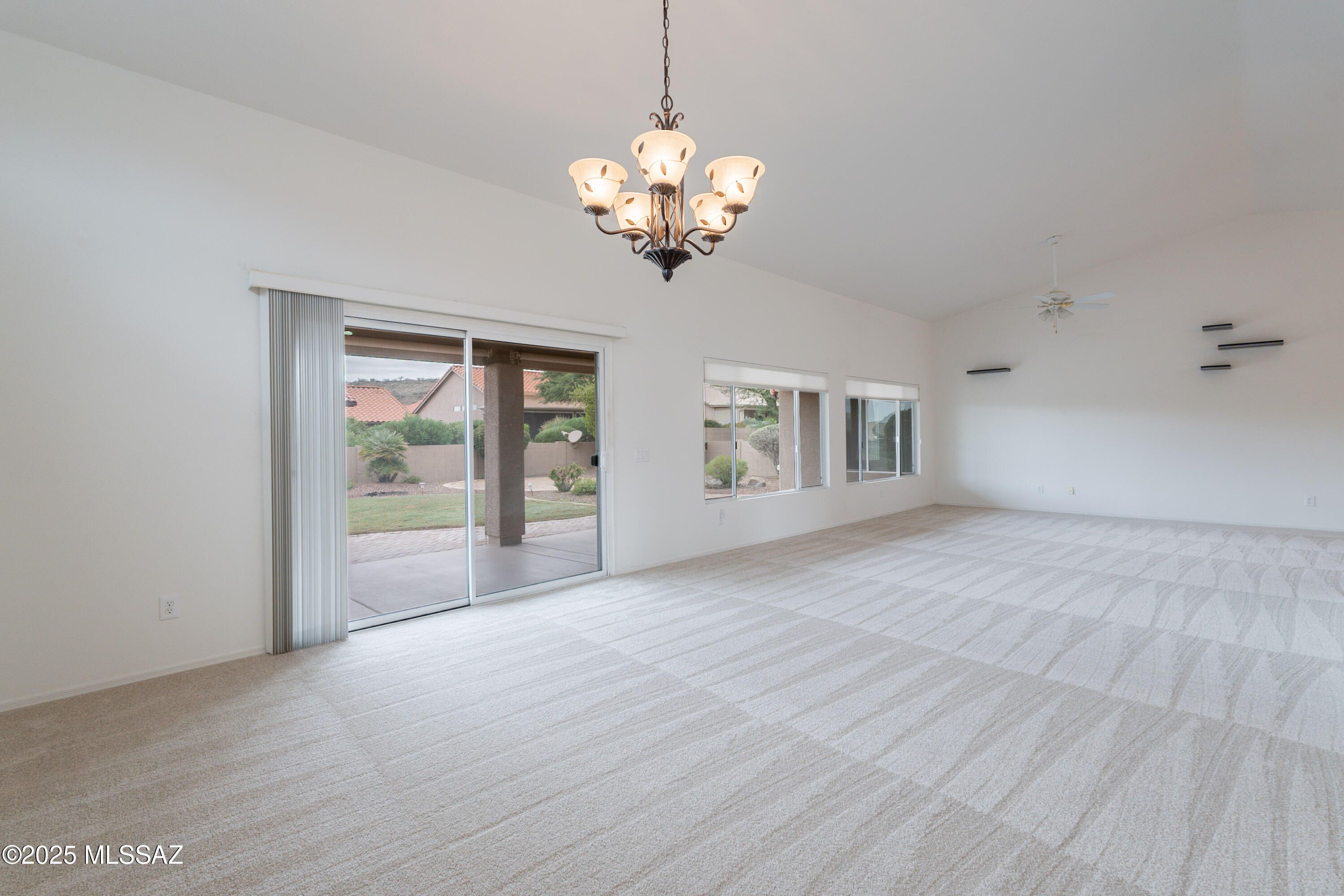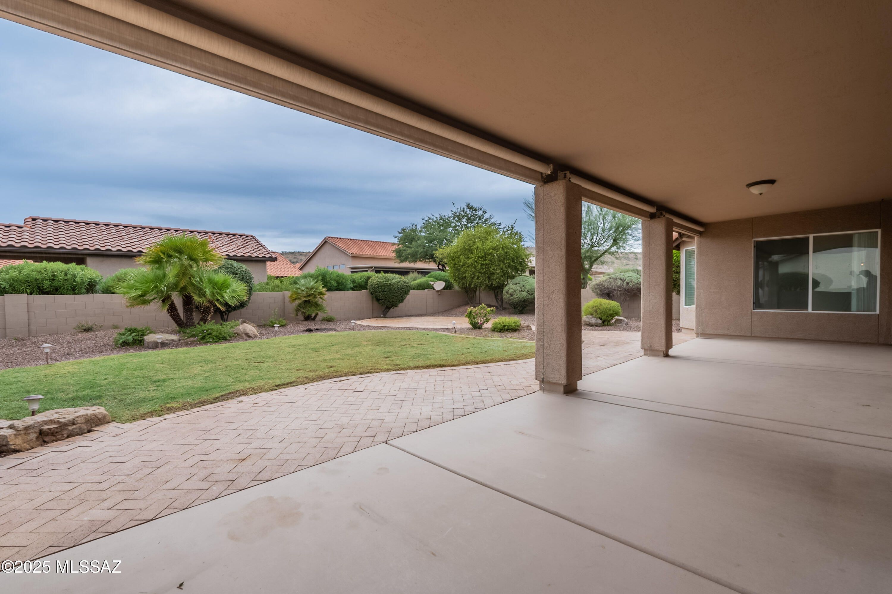 Charming 2 bedroom + den Montana model with vaulted ceilings and a bright, open layout. Primary suite offers comfort and privacy, large walk-in closet, and a beautifully, updated master bathroom and brand-new luxury vinyl flooring. Welcoming entry leads to a versatile den, perfect for an office or study. Kitchen features gray counter tops, large two door pantry, breakfast bar and sunny breakfast nook with plenty of natural light. Neutral finishes throughout, including all new light beige carpeting. 2.5 car extended garage with 5 large storage cabinets. Extended brick patio with easy care desert landscaping ensures a peaceful outdoor retreat-ideal for relaxing or entertaining. Conveniently located close to the SaddleBrooke HOA#2 Clubhouse and all the amenities!