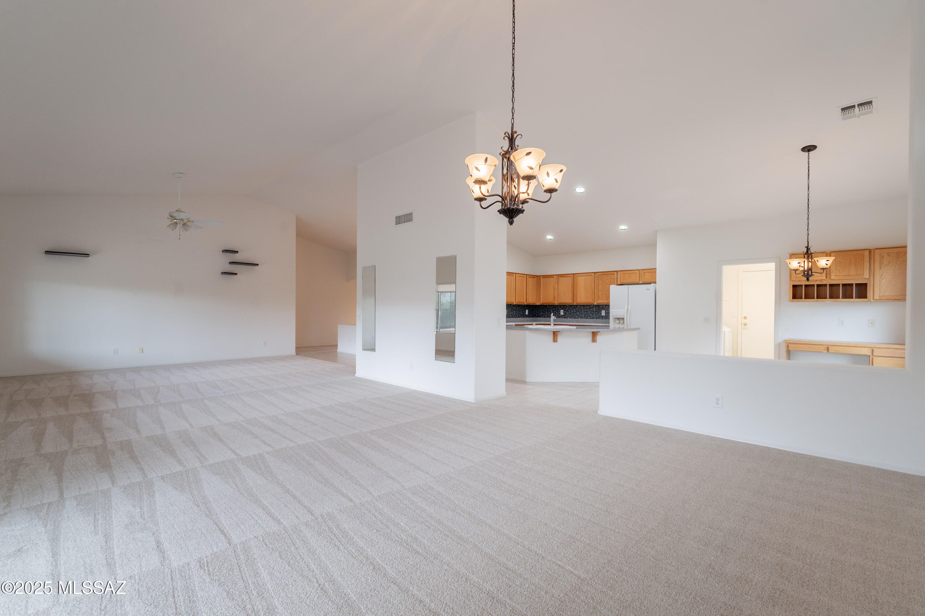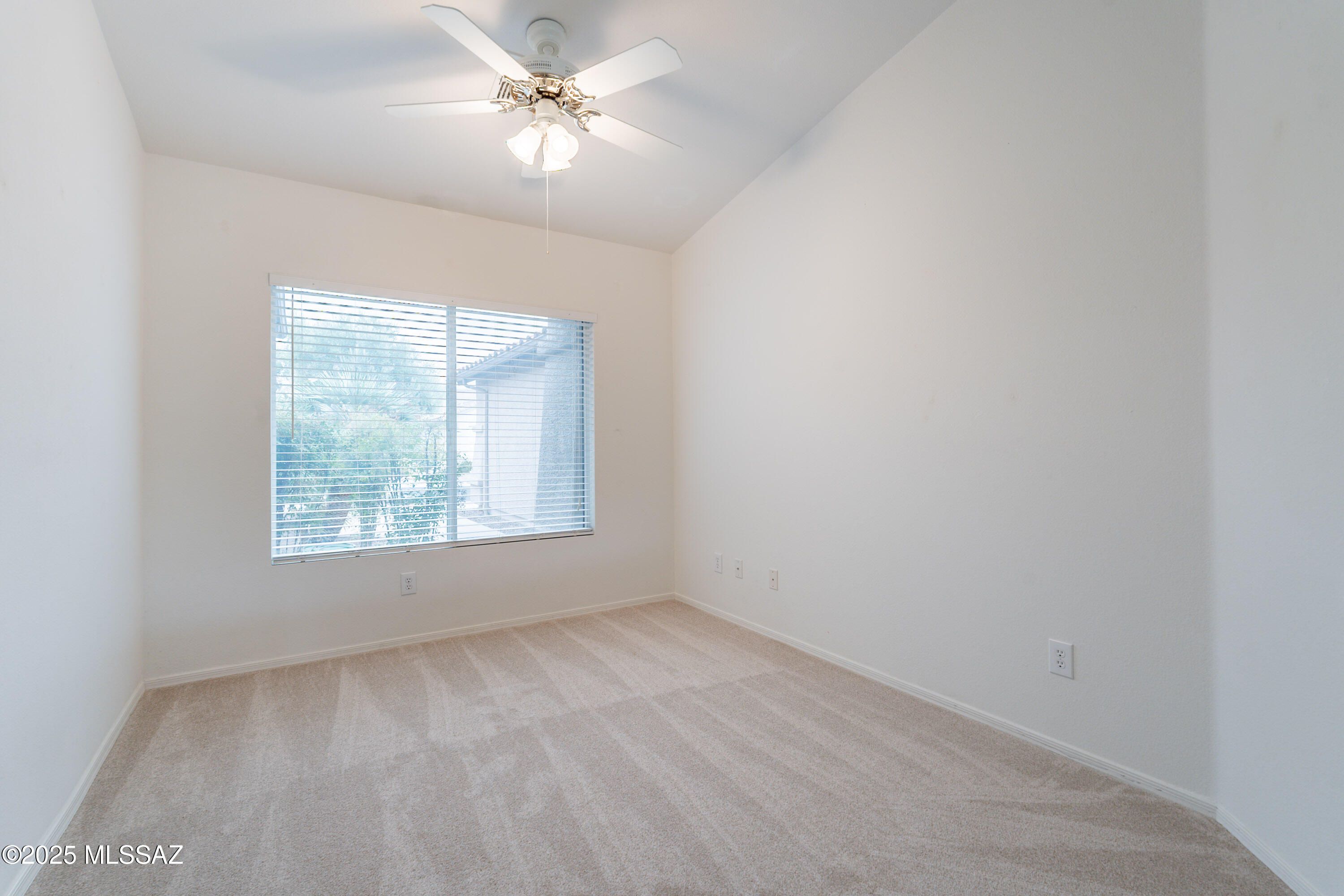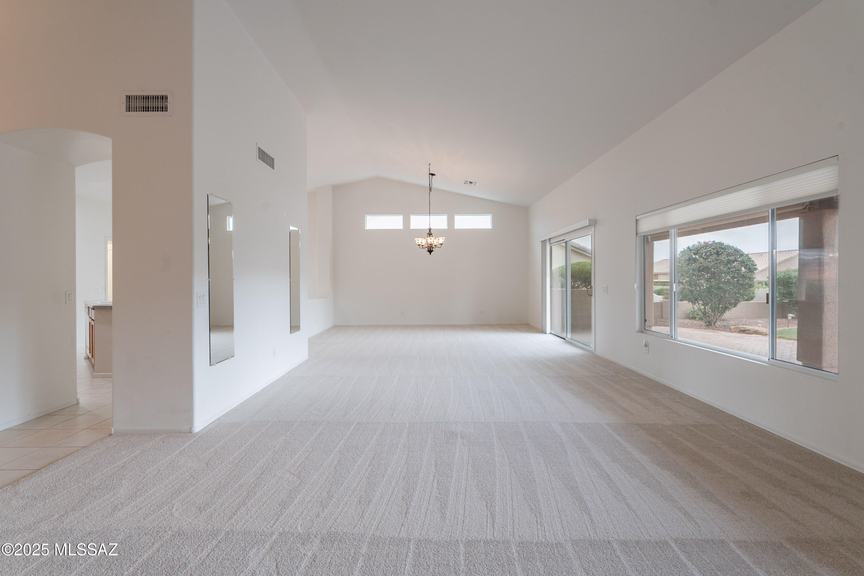 Charming 2 bedroom + den Montana model with vaulted ceilings and a bright, open layout. Primary suite offers comfort and privacy, large walk-in closet, and a beautifully, updated master bathroom and brand-new luxury vinyl flooring. Welcoming entry leads to a versatile den, perfect for an office or study. Kitchen features gray counter tops, large two door pantry, breakfast bar and sunny breakfast nook with plenty of natural light. Neutral finishes throughout, including all new light beige carpeting. 2.5 car extended garage with 5 large storage cabinets. Extended brick patio with easy care desert landscaping ensures a peaceful outdoor retreat-ideal for relaxing or entertaining. Conveniently located close to the SaddleBrooke HOA#2 Clubhouse and all the amenities!