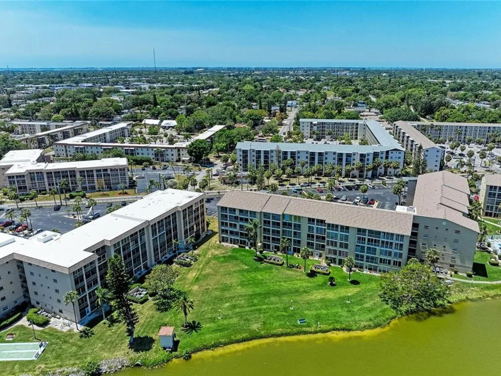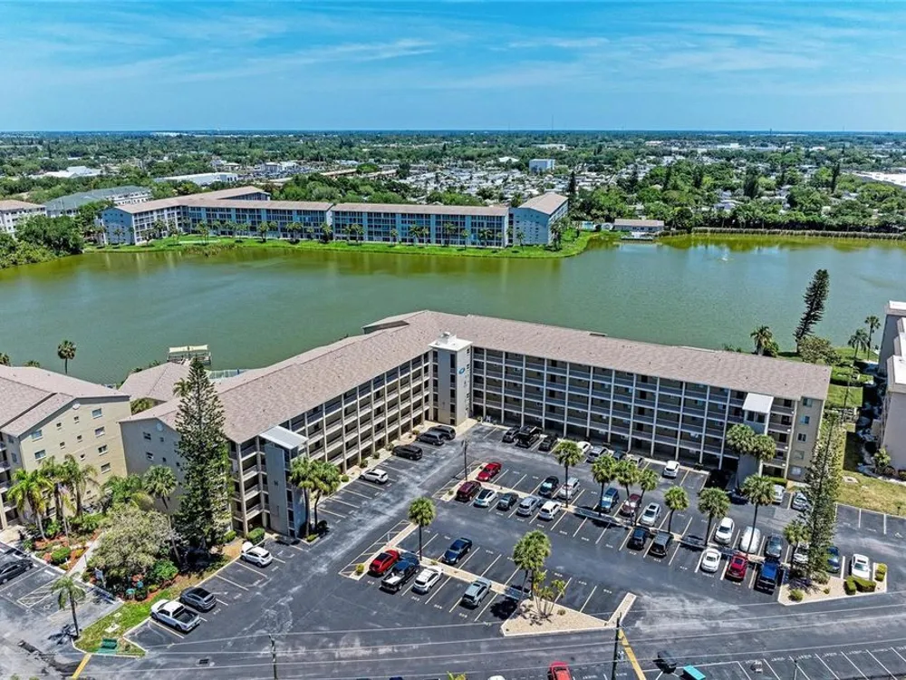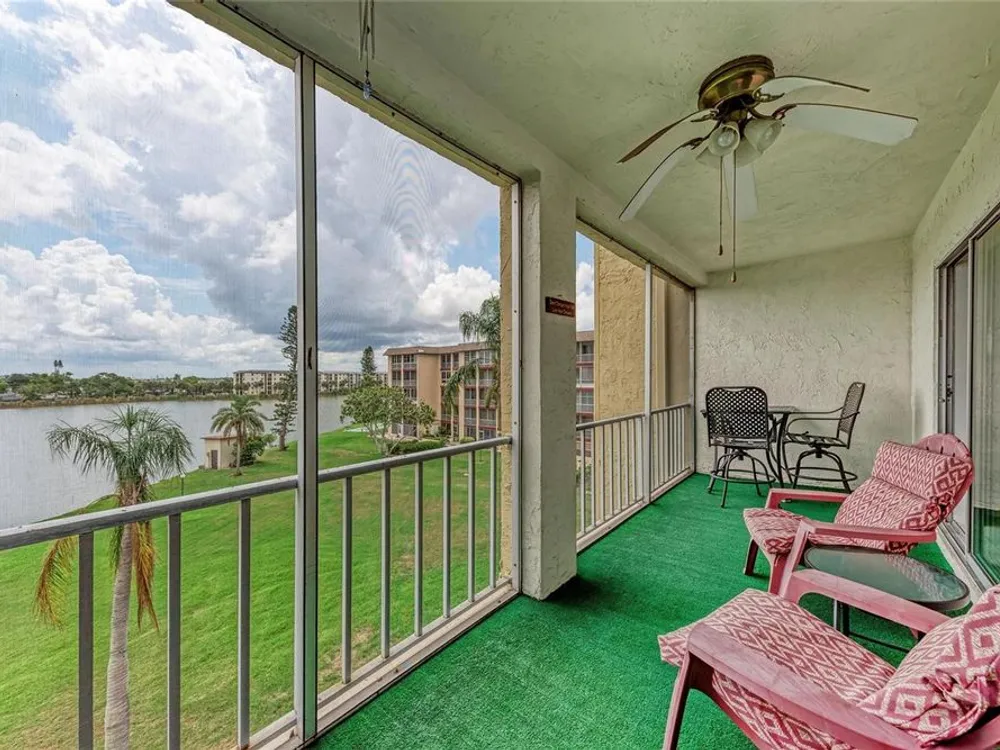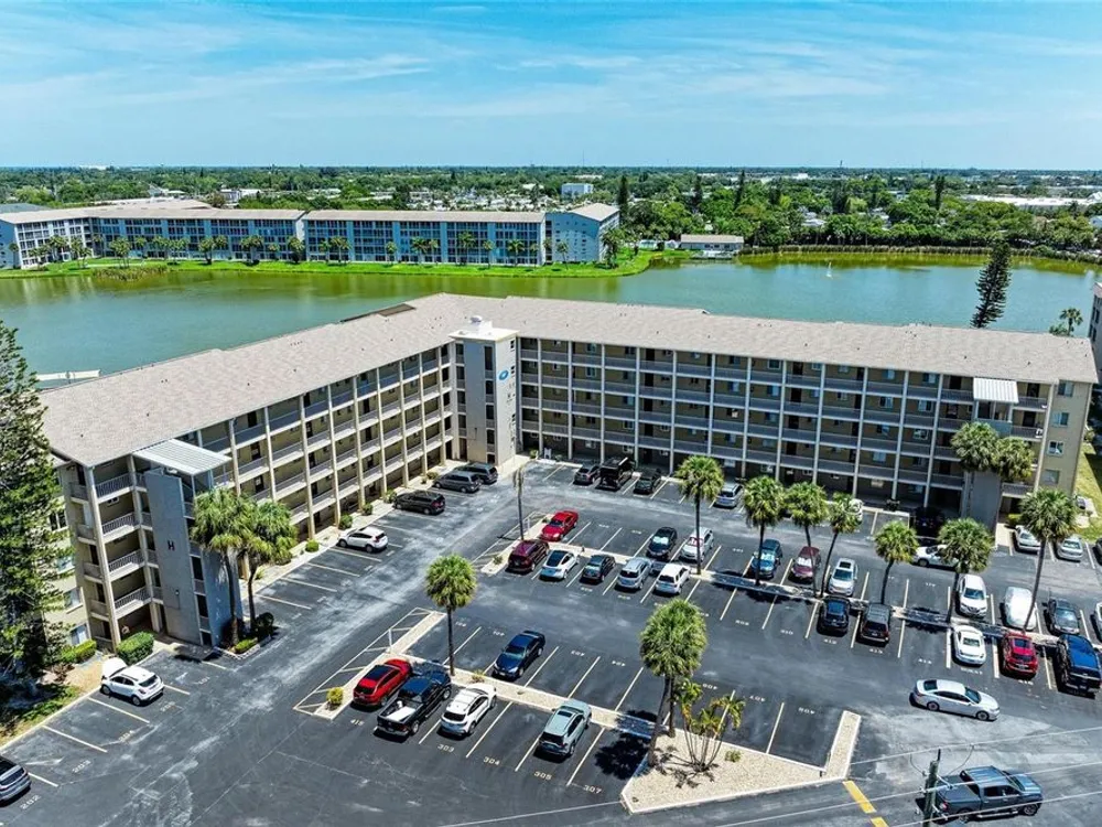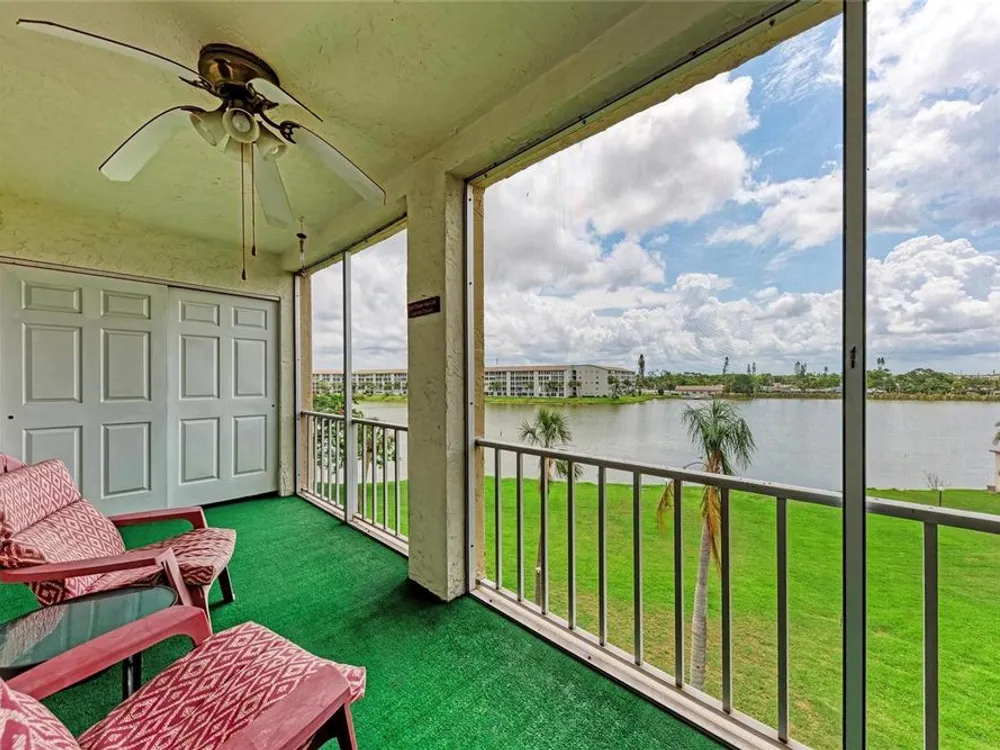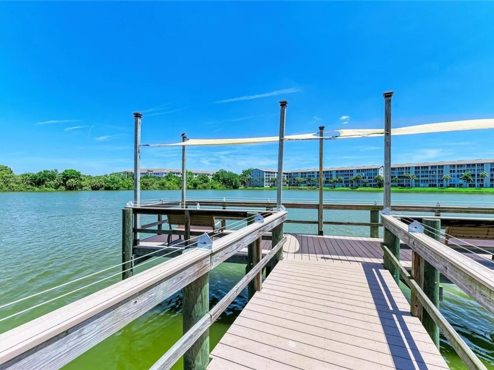 One or more photo(s) has been virtually staged. Welcome to your own turnkey lakeview oasis in this inviting condo nestled within a vibrant 55+ community. Enjoy peaceful water views from the living room, dining area, and primary bedroom, where sliding doors in both the living space and bedroom lead out to a spacious enclosed lanai—the perfect spot to relax, take in the stunning scenery while starting or ending your day. The kitchen offers generous cabinet space, a coffee bar, and a convenient pass-through that keeps the layout feeling open and connected. The bedrooms are well-proportioned, with the primary featuring a walk-in closet and private lanai access. The bathroom includes a tub/shower combo and plenty of storage. Residents of Bayshore on the Lake enjoy a heated pool, elevator access, fishing pier, clubhouse, laundry facilities, assigned parking and walking paths—all just minutes from shopping, dining, and the sandy shores of Anna Maria Island. Whether you're looking for a seasonal getaway or a peaceful full-time retreat, this lakeside home offers the ideal blend of comfort and convenience with a view you’ll never tire of.