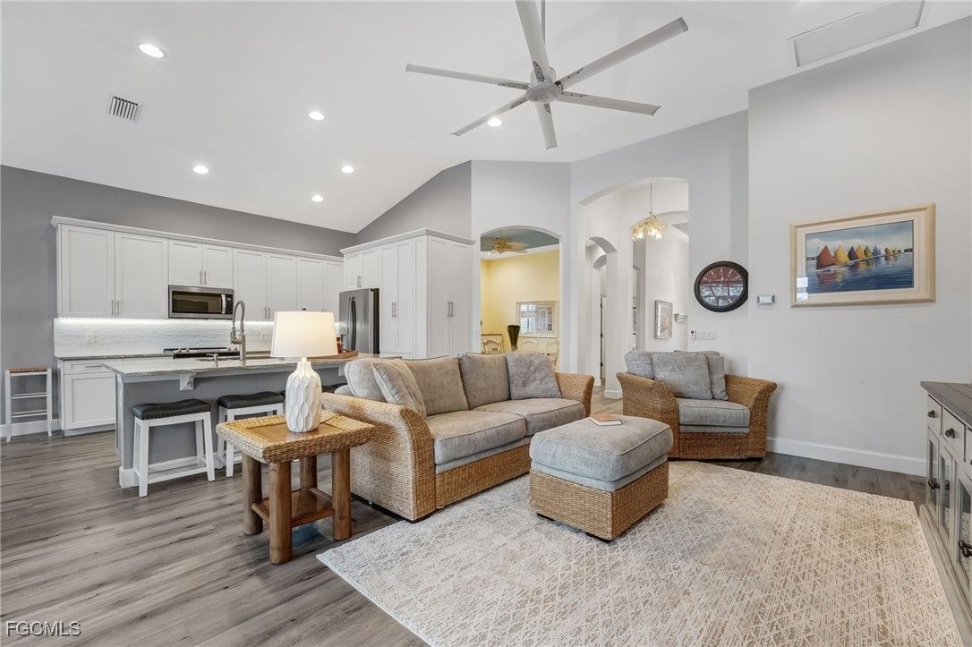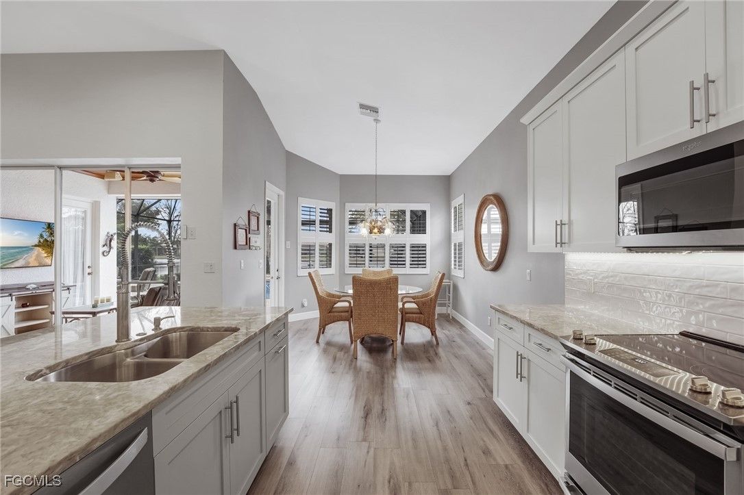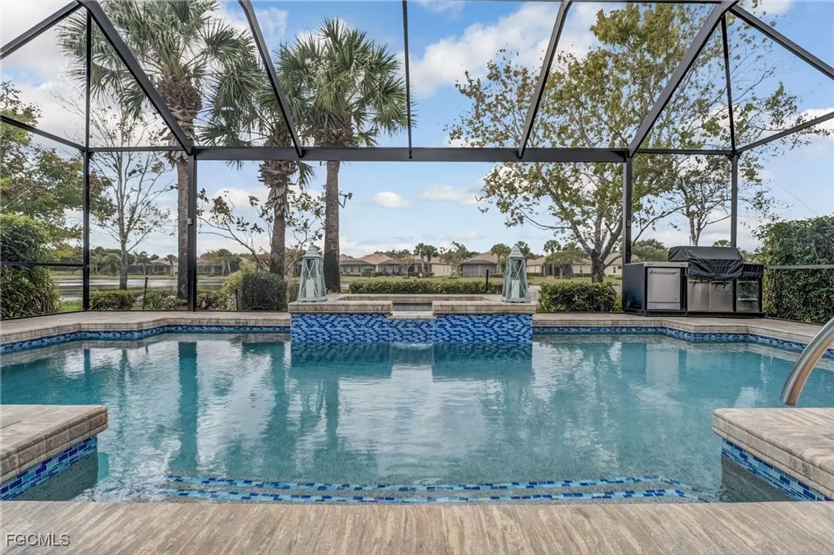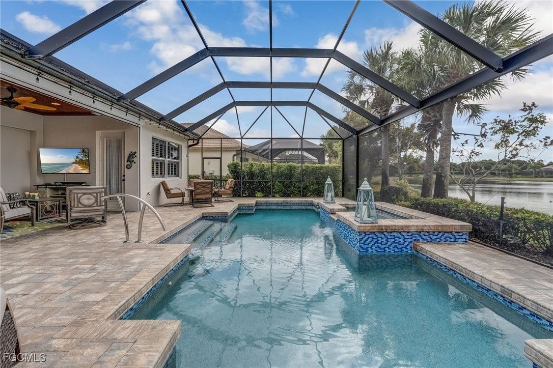 Welcome to Lakeview at Verandah, where resort-style living blends seamlessly with everyday comfort. This beautifully maintained single-family pool home, built by Centex, is perfectly suited for both seasonal retreats and full-time Florida living. Offering 1,994 square feet of thoughtfully designed living space, this one-story ranch-style residence features 3 bedrooms and 3 full bathrooms. High ceilings and elegant 8-foot doors enhance the open, airy feel throughout the home, while a two-car garage provides added convenience and storage. At the heart of the home, the updated kitchen shines with granite countertops, shaker-style cabinetry, stainless steel appliances, and a striking tile backsplash—ideal for entertaining or relaxed daily living. The home is being offered furnished, allowing you to settle in effortlessly and begin enjoying the Florida lifestyle from day one. Additional highlights include a zero-carpet interior, plantation shutters, and an in-house laundry room, combining style with practicality. Major updates such as a new roof (2020) and hot water heater (2022) provide peace of mind. The true showpiece of this home is the outdoor living space. Step onto the western-exposure lanai and take in breathtaking water views and unforgettable sunset skies. The entire pool and spa area has been completely updated and resurfaced, creating a stunning, modern outdoor oasis. A picture-frame lanai screen beautifully frames the water views while keeping sightlines clean and unobstructed. A hurricane storm shade adds both security and comfort, making this outdoor space as functional as it is impressive. This move-in-ready home offers an exceptional opportunity to enjoy the best of Verandah living—where lifestyle, location, and value come together beautifully.