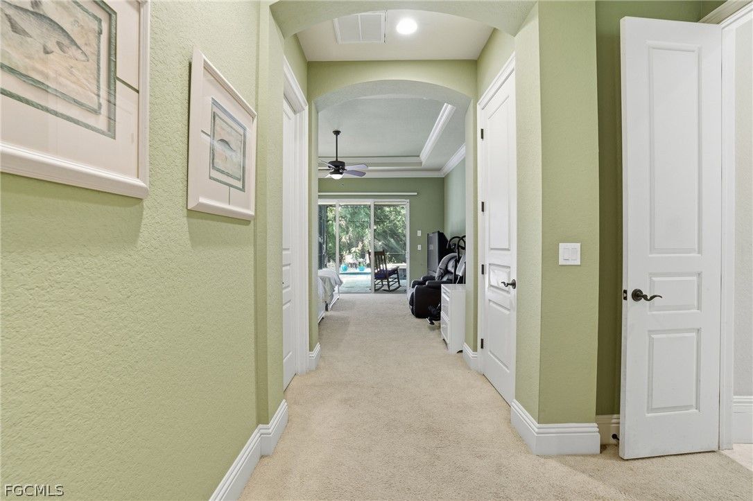 Offered turnkey, this River Point residence redefines luxury living with a design centered around seamless indoor-outdoor enjoyment. From the moment you step through the foyer, the architectural details set the tone: coffered ceilings stretch across the main living areas and tray ceilings add dimension in select rooms. Natural light pours through the home, highlighting the open-concept design and expansive gathering spaces. The kitchen is both striking and functional — anchored by a statement range, gas stove top, electric microwave/wall oven, built-in cabinetry, and a generous bar that invites conversation long after dinner is served. It flows seamlessly into the main living area, creating a space that feels grand yet welcoming. The true showpiece is the expansive screened lanai and pool deck spanning the entire back of the home - one of the largest in the community. Every rear-facing room opens directly to this outdoor retreat, where a picture-window screen frames tranquil preserve views. The custom, oversized pool and spa take center stage, complemented by a gas fireplace, grill, and even a unique sandbar lounge area — a rare touch that turns everyday evenings into resort-style experiences. The primary suite is its own sanctuary, featuring a walk-through “car wash” shower, soaking tub, dual vanities, and an oversized custom closet with built-ins. Two additional bedrooms each offer generous proportions and private baths, ensuring comfort and privacy for guests. The den includes a Murphy bed and the office includes a sleeper sofa. Set against a peaceful preserve backdrop, this home offers privacy without sacrificing lifestyle. As a resident of Verandah, you’re not just buying a home — you’re stepping into a vibrant community lifestyle and can enjoy two championship golf courses, pickleball, tennis, bocce, a fitness center overlooking a resort-style pool, and private Orange River kayaking access. Luxury, lifestyle, and privacy. This is Florida living reimagined — refined, relaxed, and ready to enjoy from day one.
