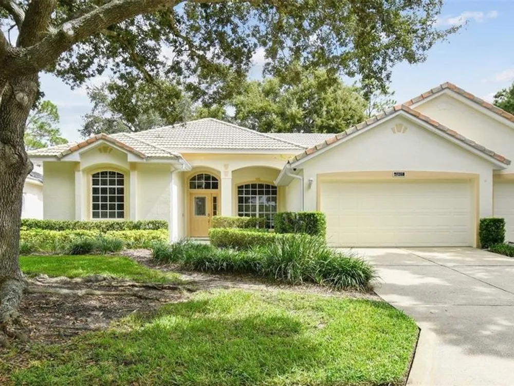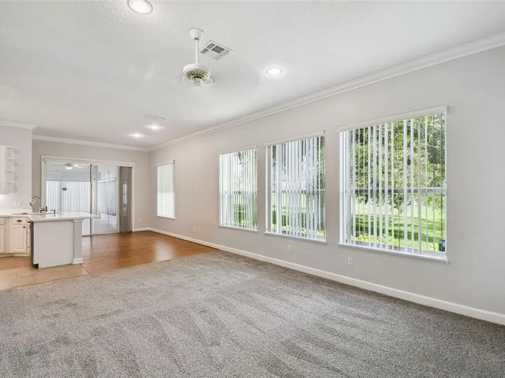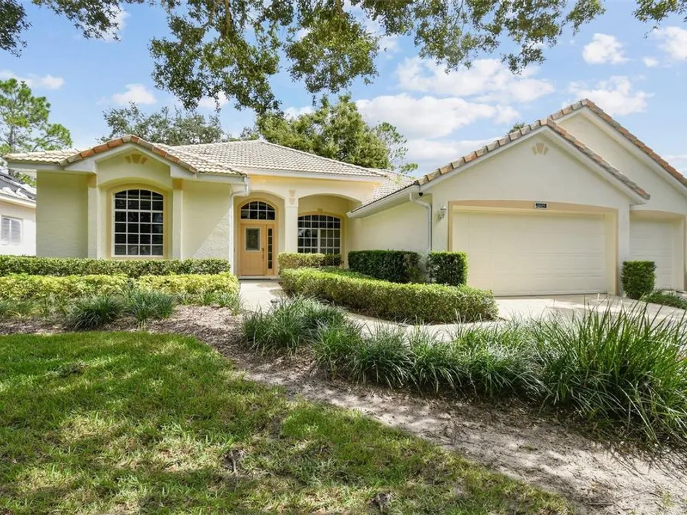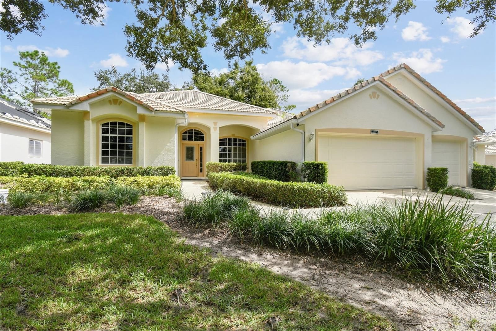 Welcome to 3805 Scarborough Ct, a beautifully maintained Nottingham model situated on the GOLF COURSE in the GATED - "MAINTENANCE FREE," 55 PLUS COMMUNITY in the highly desirable East Hampton section of Kings Ridge. This home offers 3 bedrooms, 2 full bathrooms, and a spacious three-car garage, all thoughtfully designed for comfort, style, and entertaining. NO FRONT OR REAR NEIGHBORS!! Golf course views from the front of the home and views greet you from multiple rooms. The LARGE ENCLOSED back porch (not part of the heated sq ft) features vinyl windows, perfect for enjoying the scenery on rainy or cooler days or open them to let in the full breeze. Two ceiling fans and diagonal tile add both comfort and elegance, while the large, covered porch extends the entertaining space outdoors. Views of the course also stretch across the family room, breakfast nook, kitchen, formal living room, and even the dining room and front porch, making every corner of this home connected to the lush surroundings. Inside, the home combines durability and style with laminate floors in the living and dining areas, tile in the wet areas and 3rd bedroom, and brand-new carpet in the master bedroom and 1 of the guest rooms. The popular floor plan includes both formal and family rooms, allowing for versatile living and entertaining. The kitchen is designed for both function and social connection, featuring 42" cabinets, stainless steel appliances, white Corian countertops, a breakfast bar, a closet pantry, and abundant counter space, perfect for preparing meals while staying connected to family and guests. The master suite continues the golf course views, offering dual walk-in closets and a master bathroom with a glass-enclosed shower, senior walk-in bathtub, and dual vanities. Attic pull-down stairs provide additional storage above the three-car garage. Throughout, the home has been very well maintained, from the tiled roof to the upgraded landscaping with mature trees, including a flourishing orange tree. Kings Ridge is a gated community offering a full range of amenities, including two golf courses, tennis courts, two pools, and a recreation building with classes and excursions. Residents enjoy easy access to major roads, or for a more leisurely option, you can reach grocery stores, restaurants, and shops by golf cart without ever stepping onto a main road. Monthly maintenance covers exterior repainting, lawn care, cable, and more, allowing you to enjoy the lifestyle without the hassle. This home combines timeless elegance, functional living spaces, and a premier golf course location, making it a must-see for buyers seeking the best of Kings Ridge living.