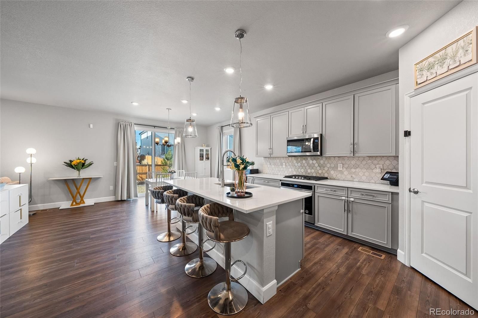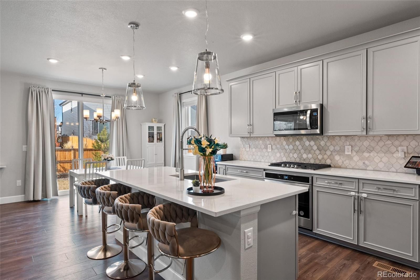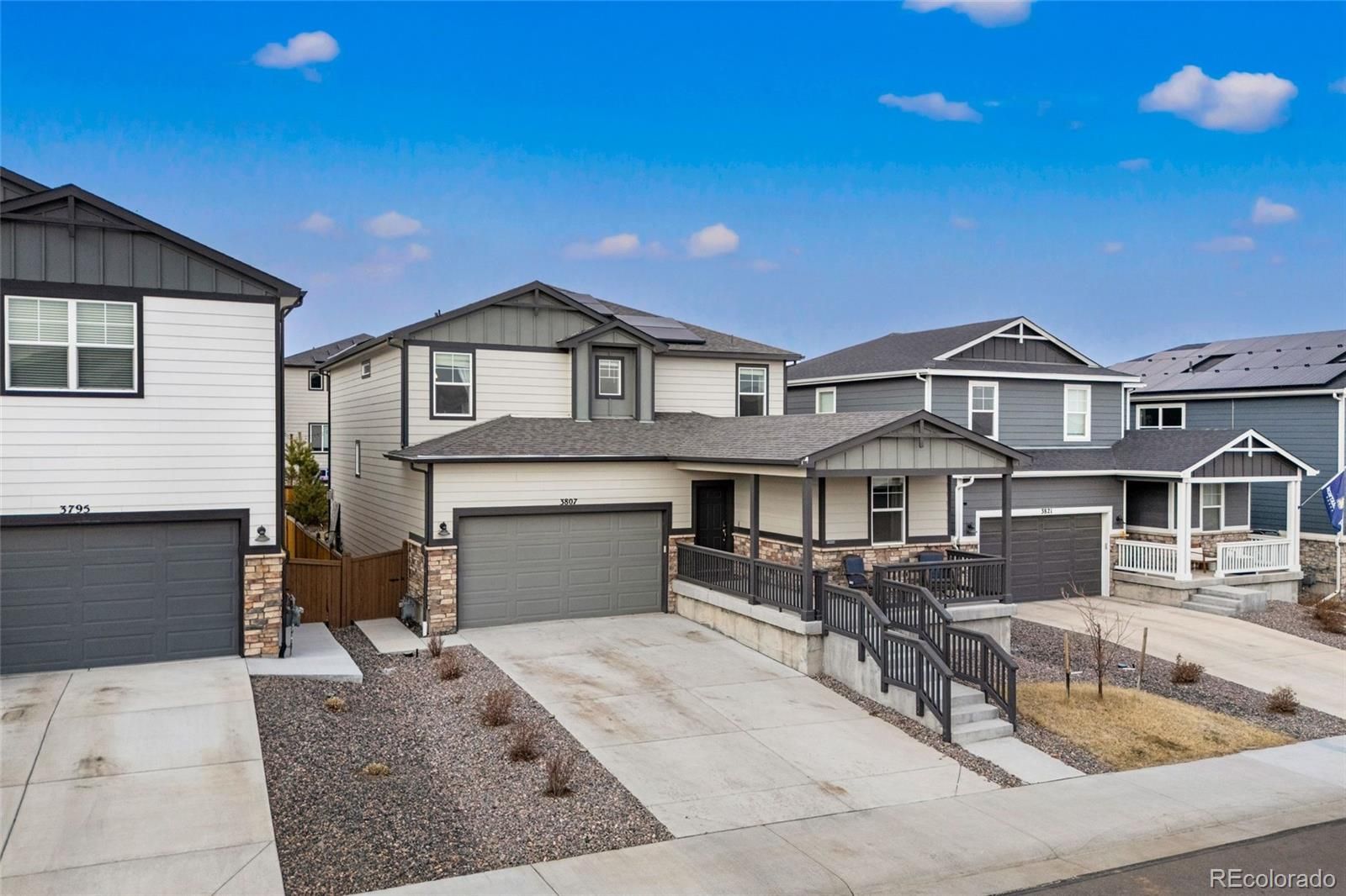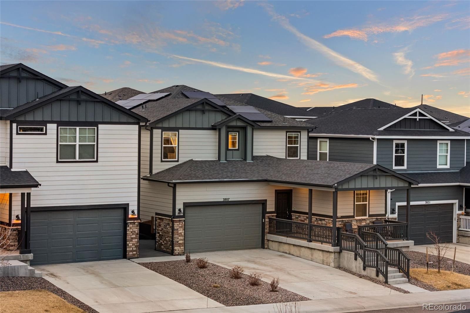 Welcome to this beautifully built 2022 mountain contemporary home in the sought-after Sunstone Village at Terrain, where modern living meets everyday convenience. Thoughtfully designed with flexibility and energy efficiency in mind, this home features solar panels and a separate attached 1-bedroom Short Term Rental with kitchenette, offering outstanding income potential or multi-generational living options. This home features 6 bedrooms and 4 bathrooms with a fully finished basement, leaving plenty of livable space for everyone. The open-concept main level is anchored by a warm gas fireplace in the living room and a gorgeous, updated kitchen with quartz countertops, a large island, modern cabinetry, and a spacious dining area which are perfect for both entertaining and daily life. Retreat to your primary bedroom upstairs with gorgeous primary bathroom and oversized closet. Upstairs provides generous bedrooms and a versatile loft space, while the finished basement adds additional living and recreational space complete with a kitchenette/wet bar area. Step outside to enjoy a covered front porch, a back patio, and a fully fenced backyard, ideal for relaxing, pets, or outdoor gatherings. Beyond the home, the location truly shines. This home is located in the sought-after Douglas County school district. Residents enjoy neighborhood walking paths, parks, playgrounds, and community trails, all just steps away. The home is minutes from grocery stores, restaurants, coffee shops, and shopping, including The Outlets at Castle Rock, offering a wide variety of dining, retail, and entertainment options. Convenient access to Founders Parkway and I-25 allows for easy commuting and quick trips to downtown Castle Rock, Parker, Denver, and Colorado Springs, while still enjoying the charm of a quiet, well-planned neighborhood. This home delivers the perfect balance of comfort, flexibility, and location which is ideal for homeowners and investors alike.