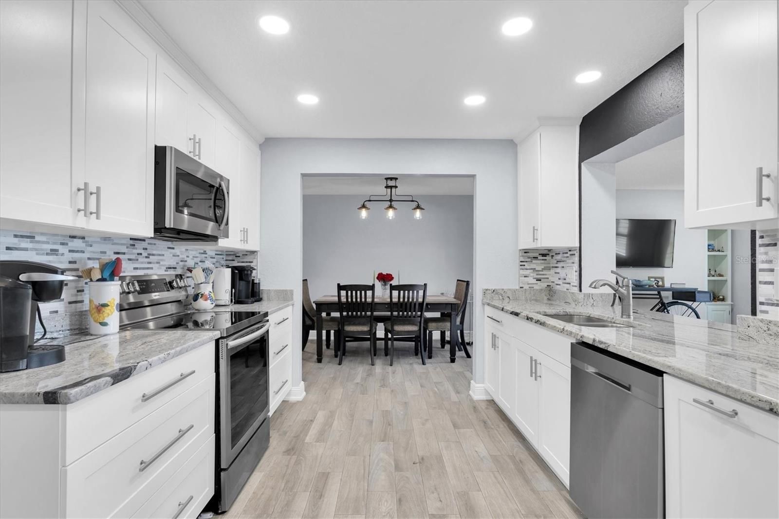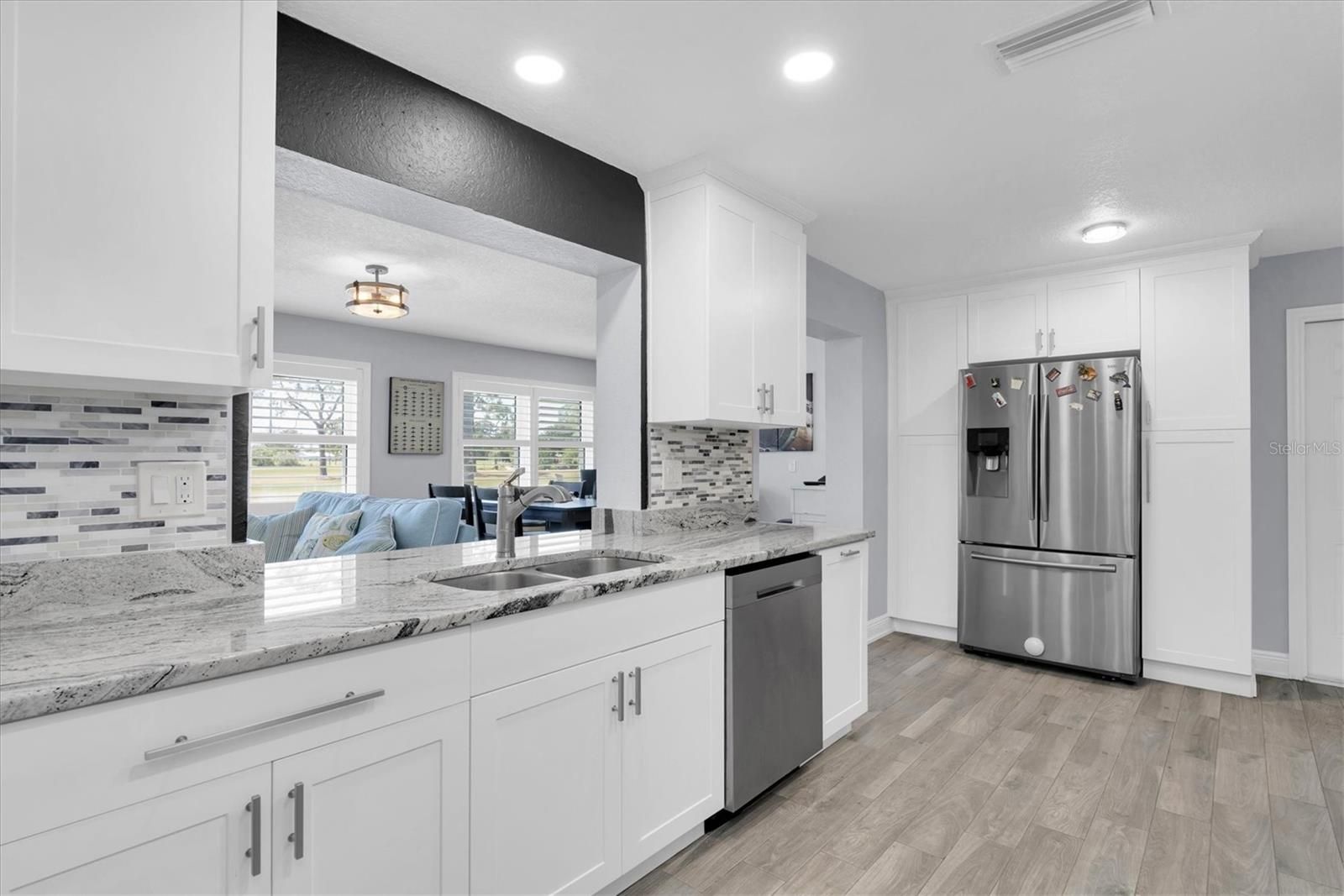 This stunning 2 bedroom, 2 bath, 1 car garage, 1649 sq. ft. home located in the desirable 55 + community of Mainlands of Tamarac by the Gulf. Golf enthusiasts will be delighted by the enclosed, screened patio that is complete with small fridge and seating that offers the perfect vantage point to watch golfers putt out on hole #2. Additionally, there is an outside, paver patio off the enclosed patio, ideal for hosting barbecue's or catching some rays. Step inside and discover all the updated features of this home, including tile flooring throughout with carpet in the bedrooms, new lighting, inset lights, remote control fans, and plantation shutters. The kitchen boasts Shaker white, soft-close cabinets, stainless appliances, and granite countertops. Both the guest and primary baths have been completely renovated with new floors, mirrors, vanities, shower, lights, and fixtures. The front, side, and garage doors have also been updated. There is a newer washer, dryer and water softener with a sink in the utility area of the garage. As you enter the home, you’ll find an enclosed, screened front porch area. This home comes fully furnished with modern interior design furnishings, dishes, pots and pans, etc. Additional update the sliding glass door is impact and installed in 2023, windows replaced in 2019, electrical and plumbing updated 2019. The Exterior of the Property is due to be painted courtesy of the HOA in March 2026. The clubhouse is where you can enjoy a swim in the heated pool or participate in various activities such as shuffleboard, bingo, cards, and dances. Mainlands is a golf cart community conveniently located just minutes away from Mainlands Public Golf Course, Freedom Lake Park, beaches, airports, and downtown St. Petersburg. The maintenance fee covers the replacement of the roof, which was done in 2023, as well as the painting of the exterior, cable, internet, trash, water, sewer, lawn, and access to the clubhouse with pool. All you need to bring are your clothes, toothbrush, and golf clubs. Don’t miss the opportunity to see this exquisite home. Call today to schedule your appt!