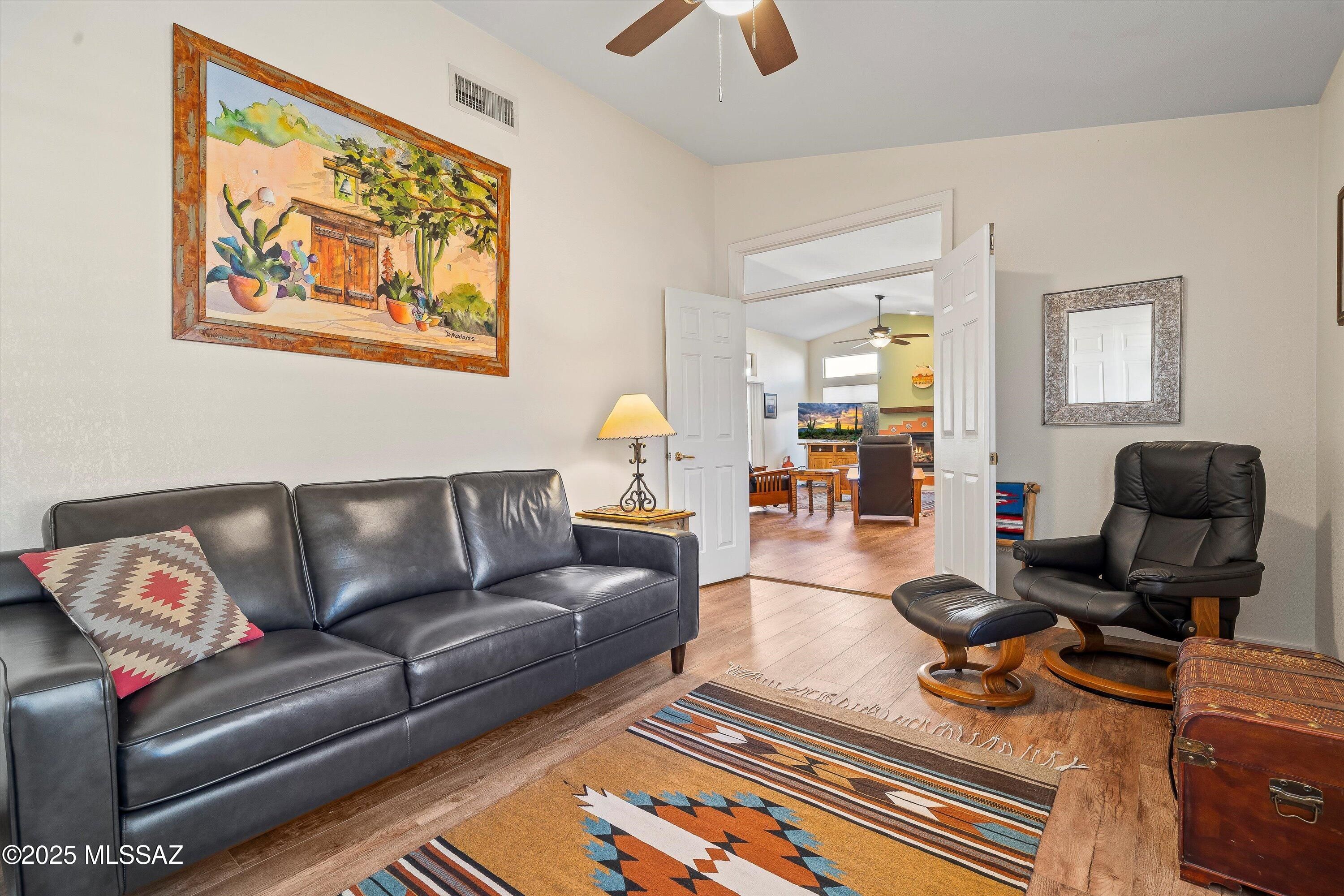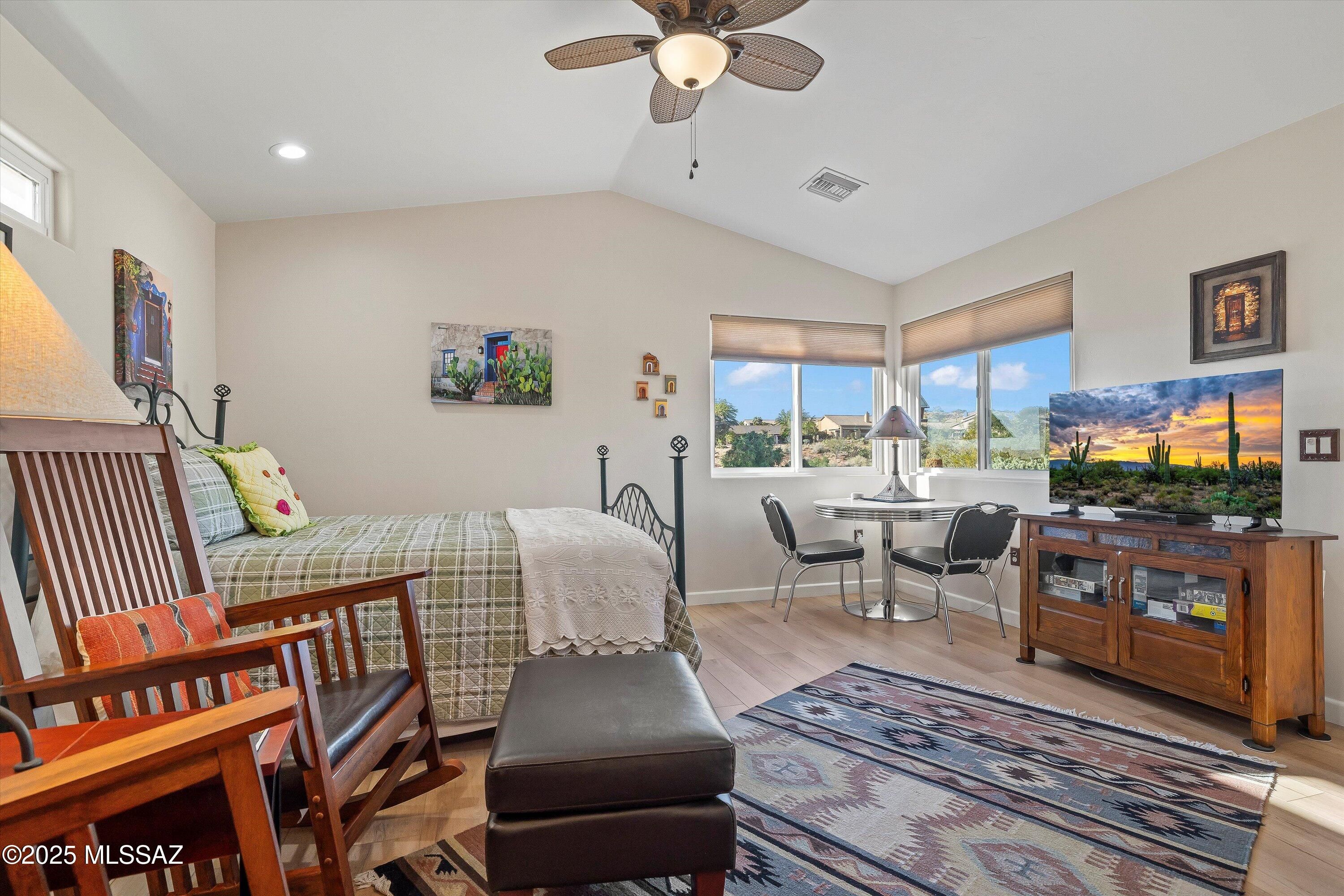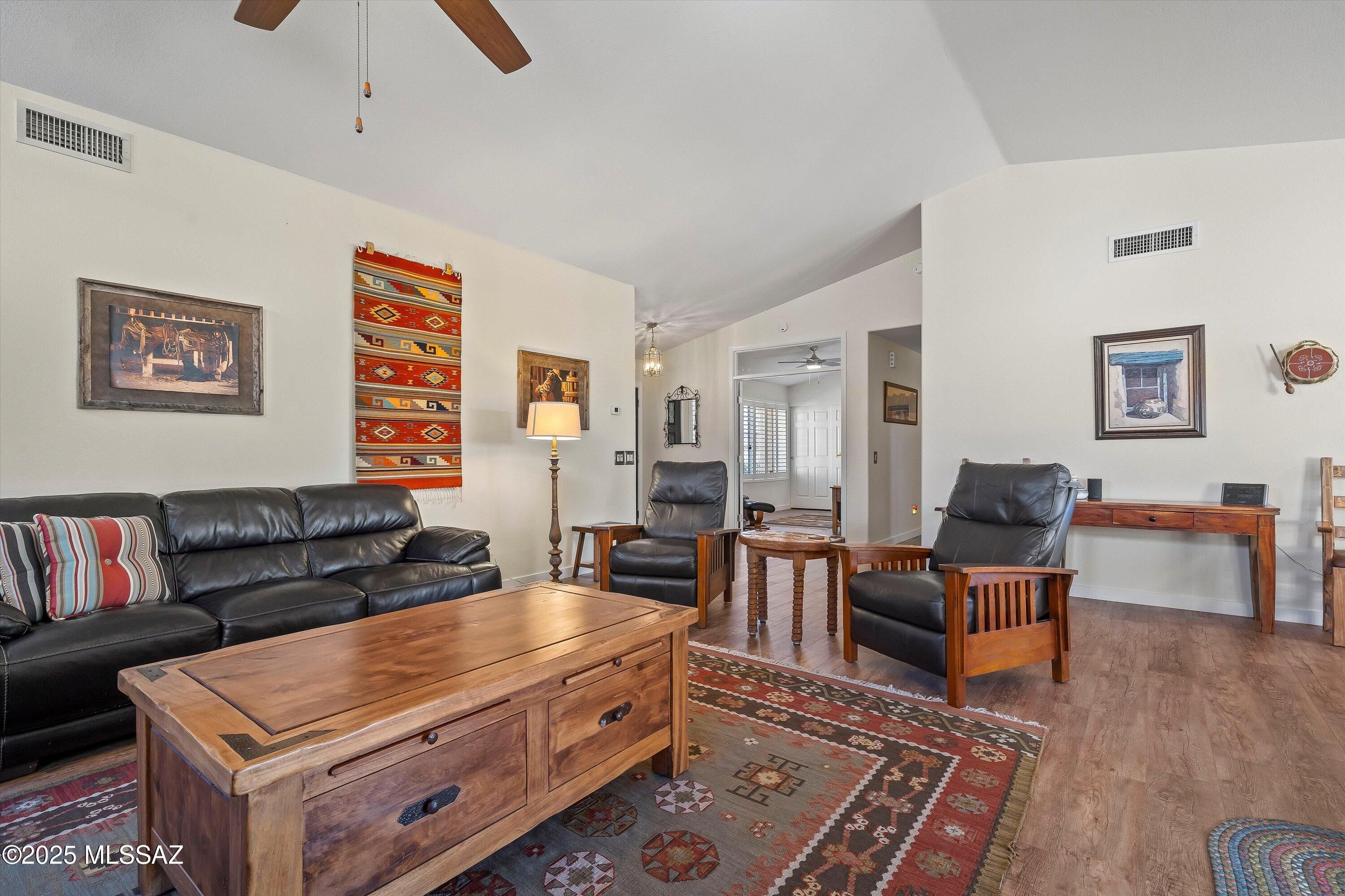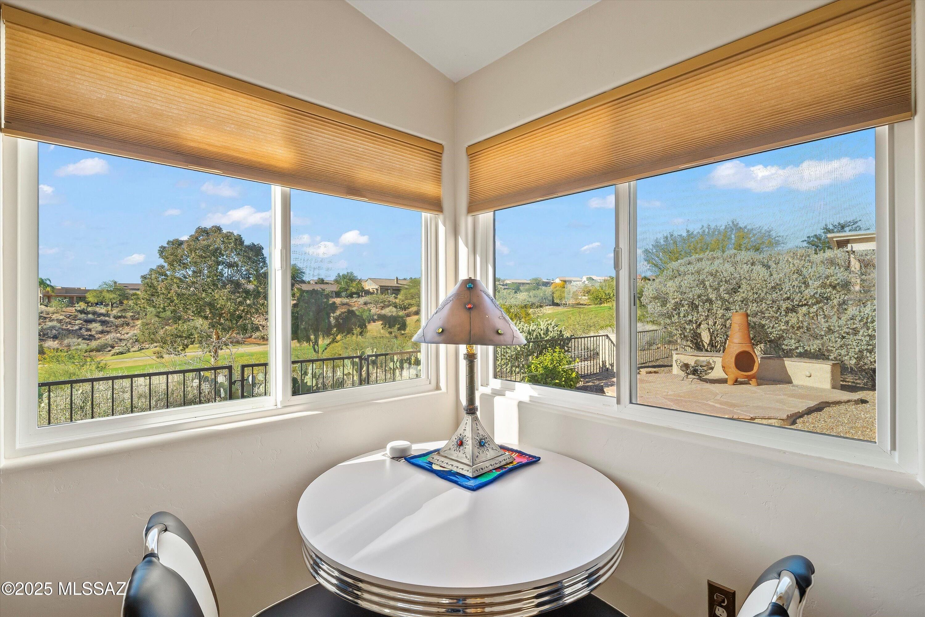 Tranquil, elevated golf course lot offers beautiful views and exceptional privacy. This popular Sonora model features an open-concept floorplan with high ceilings and large windows that fill the home with natural light. A casita added in 2019 expands the home to 3 bedrooms and 3 bathrooms, providing flexible space for guests, a craft room, or a private office. Indoor-outdoor living is seamless with doorwalls from both the great room and primary bedroom. Mohawk LVP flooring throughout adds warmth and easy care, while subtle Southwest details bring character without overwhelming. Recent updates include roof underlayment replaced in 2023, exterior paint in 2022, and a brand-new garage door. Located in SaddleBrooke's resort-style 55+ community, turnkey available with furnishings on a BOS.