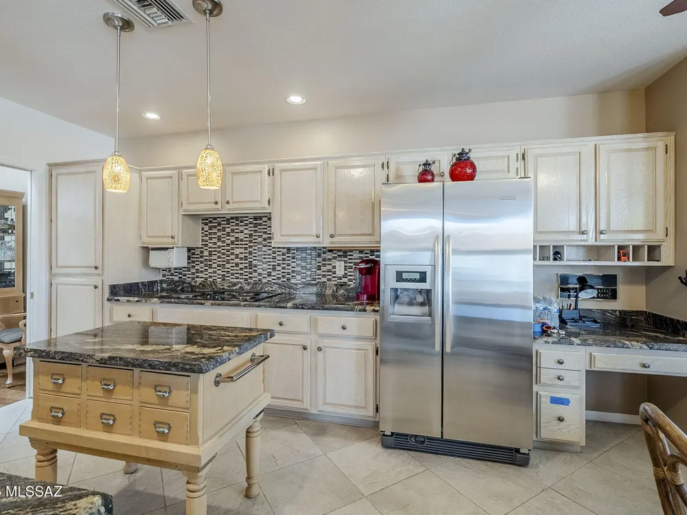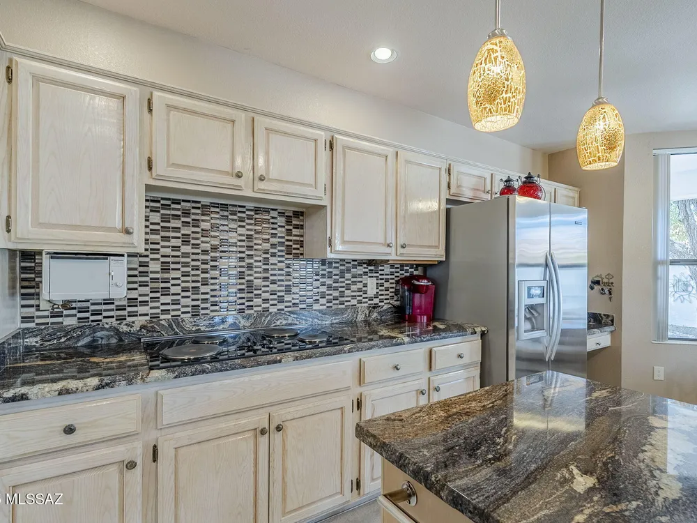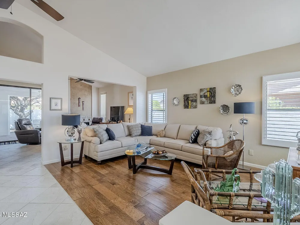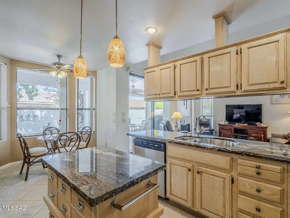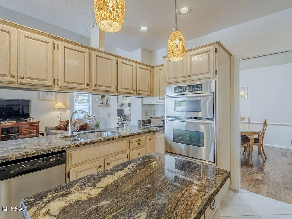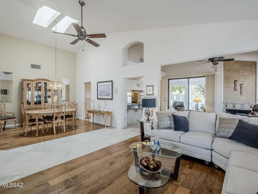 Light and bright Ventana floor plan located in desirable SaddleBrooke One community. This 2 bed, 2 bath home features 16'' tile set on the diagonal & engineered wood flooring (2014) - no carpet. The kitchen is equipped w/granite counters, updated stainless appliances, a double oven - both main oven and MW have convection features, electric cooktop & portable island for added prep space. Enjoy cozy evenings by the fireplace. Primary bath offers granite countertop & beautifully updated shower, the guest bath also features granite counter. Additional upgrades include Rheem heat pump, roof underlayment (2021), and fresh exterior paint (2025). Relax on the patio with retractable shades for sun protection. Move-in ready - thoughtfully updated!