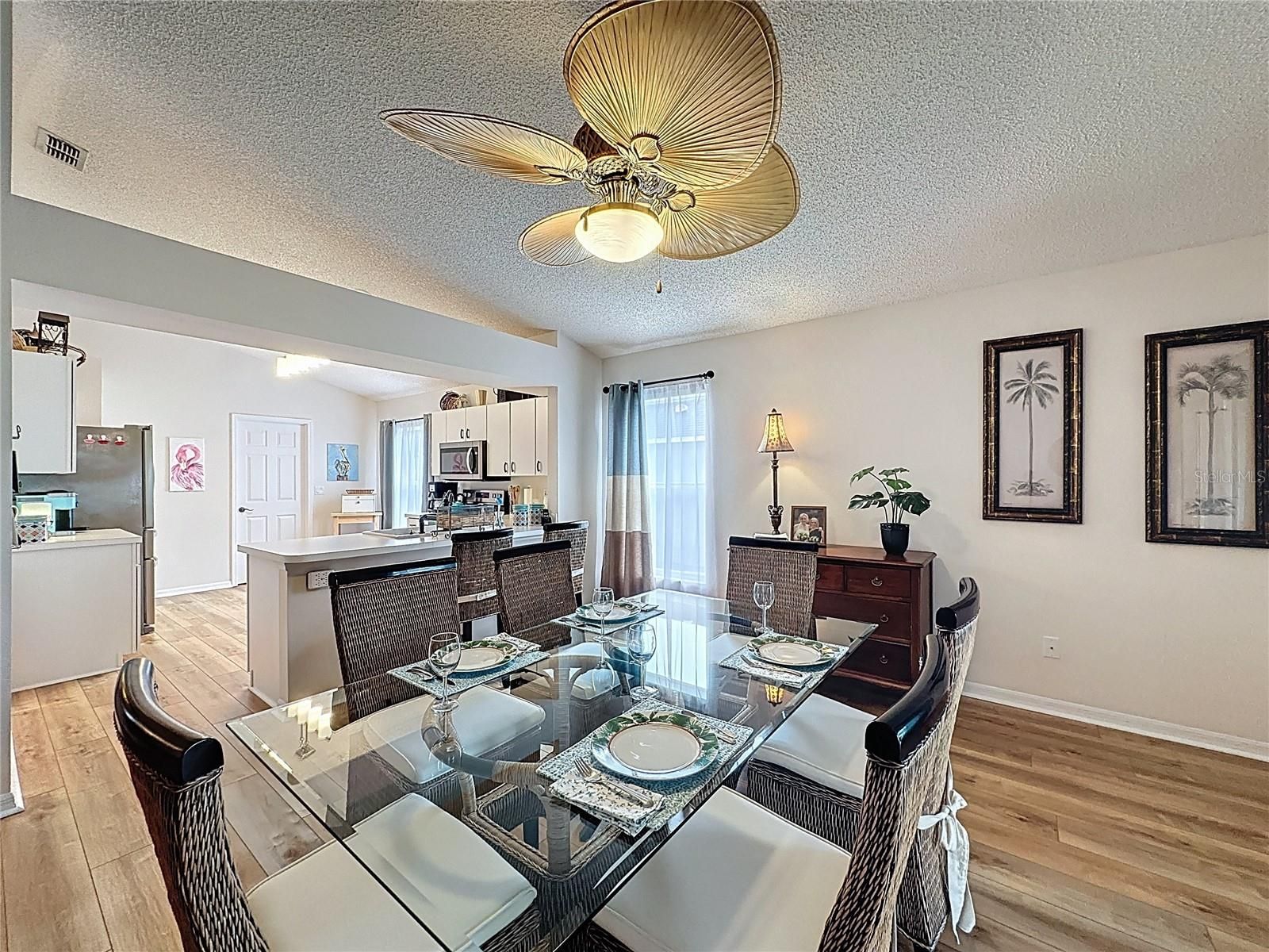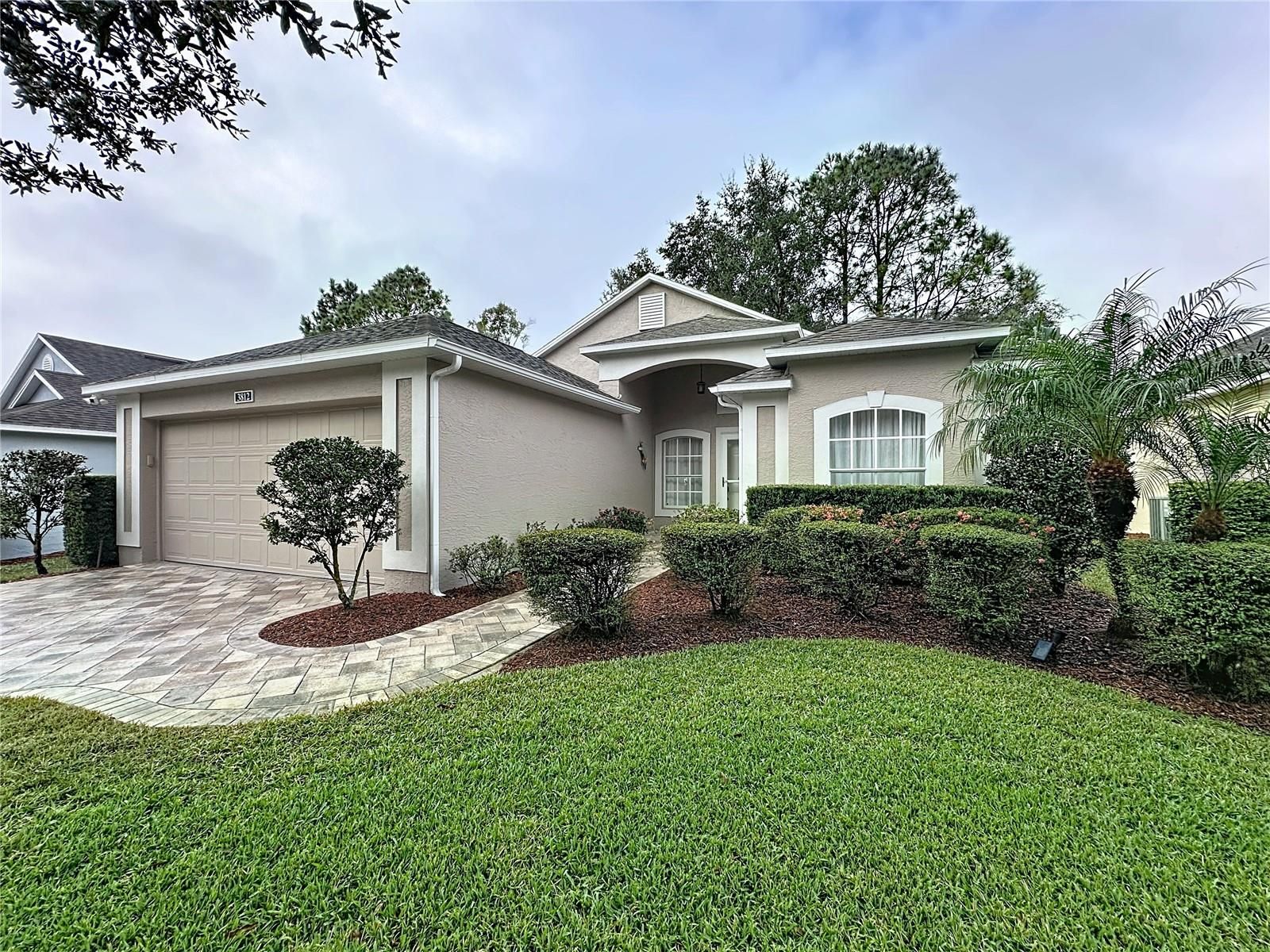 Fully furnished /turnkey Oxford model on the golf course in 55+ gated golf community of Kings Ridge. Located on the 15th tee box and you can enjoy the golf course from the screened in lanai. Home has 1679 heated SF wit 2 BD/2 BA plus den and a 1 1/2 car garage. The paver brick driveway was installed in 2015.--makes for great curb appeal. There is newer Cortex luxury vinyl plank flooring throughout the home. New roof in August 2014 and new water heater in 2024. The HVAC was changed out with a state of the art 3 ton Trane unit in Nov 2018. The den/flex room has had a door added. The interior has been painted with neutral colors and new light fixtures throughout the home. Separate laundry room- LG washer/dryer remain. The primary bathroom has a walk in shower . The exterior was just painted in 2024. The lanai has newer screens and roll down sun shades. There is a transferrable Truly Nolan Termite warranty also. Very very clean home. The golf cart is available but is being sold separately from the home. Kings Ridge is a 55 Plus gated golf community located in the rolling hills of Clermont, FL. Enjoy the Royal life style in the multi-million $ clubhouse with 3 heated pools, spas, tennis & pickle ball courts, billiards, shuffle board, shows, Bingo, cards and clubs galore. The monthly maintenance fees include: lawn maintenance including trimming of shrubs, care of irrigation system & irrigation water, internet & TV thru Opticaltel, maintenance of roads and outside painting of home ever