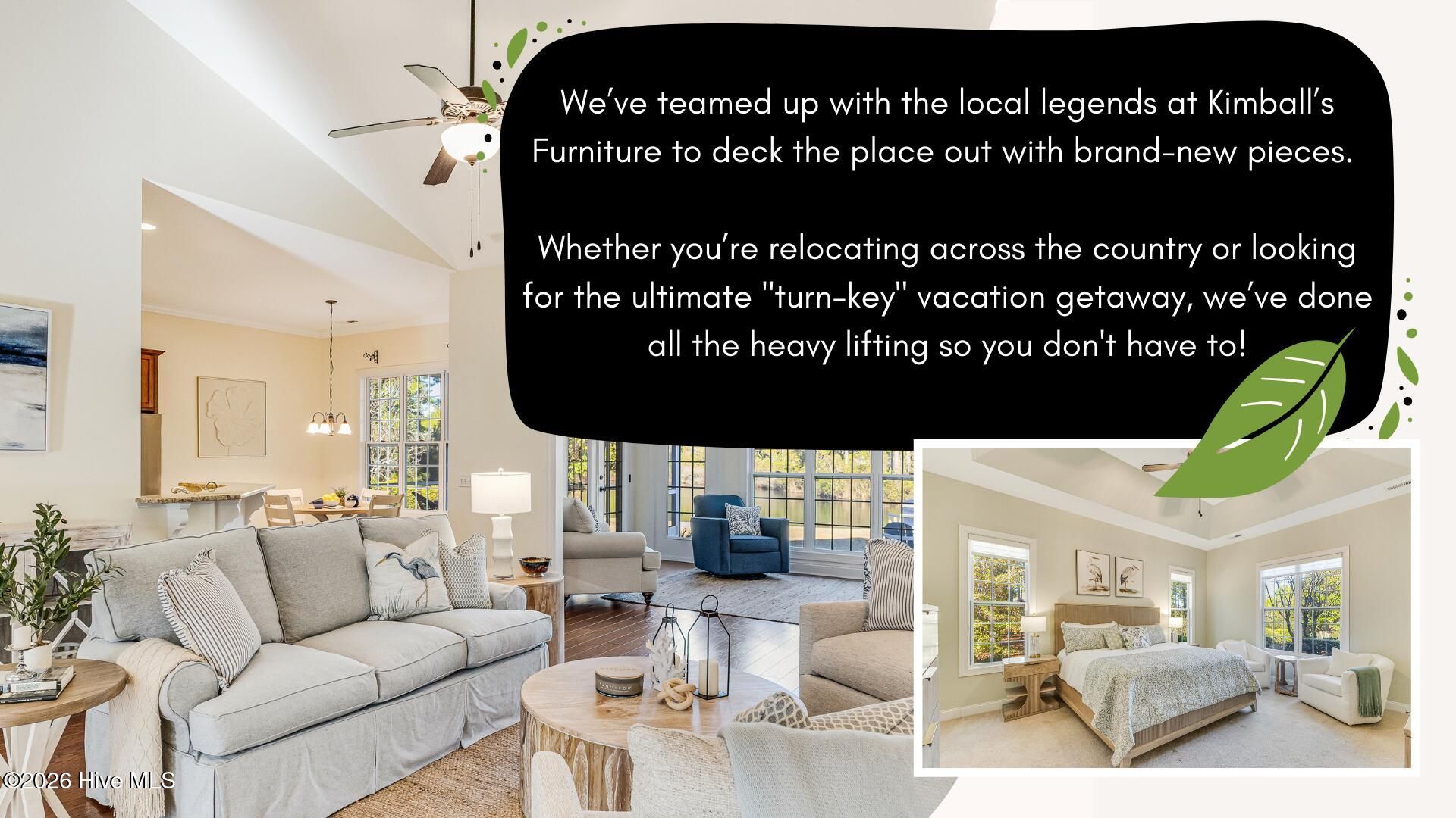 Get ready to pack your bags and move right in! This stunning home can be yours fully furnished—exactly like the fresh, stylish look you see in the photos. We've teamed up with the local legends at Kimball's Furniture to deck the place out with brand-new pieces. Whether you're relocating across the country or looking for the ultimate ''turn-key'' vacation getaway, we've done all the heavy lifting so you don't have to! Why you'll love it: Instant Vibes: Every room is designed for maximum style and cozy comfort. Total Flexibility: Love the look but want to tweak a few things? No problem! You can swap pieces to perfectly match your personal flair. Zero Stress: Just bring your toothbrush and start living the dream. This elegant all-brick, one-level home is perfectly situated in the prestigious Reserve section of St James Plantation. Enjoy one of the most coveted locations—just moments from the main gate for quick, easy access in and out of the neighborhood! Ready to dive into the St. James lifestyle? We've got some fantastic news: the active club membership on this property translates to a sweet discount on your activation fee! It's basically a ''welcome to the neighborhood'' gift that makes joining the St. James Clubs easier (and more affordable) than ever. Whether you're eyeing the golf course, the tennis courts, or the social scene, you're already one step ahead! Step inside to a bright, open floor plan designed for both comfort and entertaining. The welcoming foyer opens to a dedicated office with French doors and a formal dining room, making a grand first impression. The spacious living room features a cozy gas fireplace and flows seamlessly into the Carolina Room, where walls of windows bring in soft natural light and offer tranquil pond views. Love outdoor living? Relax on your screened-in porch or grill out on the large patio overlooking the private backyard and peaceful pond. The manicured landscaping and covered front porch create a w inviting entry every time you come home. The kitchen offers abundant cabinet and counter space, plus a sunny breakfast nook for casual meals. All three bedrooms are on the main levelincluding a spacious primary suite with pond views, a luxurious bath (soaking tub, walk-in shower, double vanity, water closet, and huge walk-in closet), and two generous secondary bedrooms. Thoughtful upgrades make this home accessible for all: the secondary bath features a wide door frame, zero-barrier tile shower, and ADA-compliant sinkperfect for guests or family members with mobility needs. St James Plantation offers an unmatched coastal lifestyle, including: * Oceanfront Beach Club on Oak Island: Pool, private parking, beach access, showers, and restrooms * Waterway Park Amenities: Fitness/walking trail, children's playground, picnic shelters, dog park, volleyball court, bocce ball, kayak launch, covered pier to the Intracoastal Waterway, covered pavilion with picnic tables, and a scenic plant trail * Woodlands Park Amenities: Three-level terraced lakefront amphitheater, bike/walking trail, restrooms, picnic shelters, dog park, and environmental education spaces * Active St James Club membershipbuyers enjoy a discounted initiation fee if they choose to join one of the many clubs offered This is coastal living at its finestconvenient, comfortable, and move-in ready. Come see why life is better at 3812 Ridge Crest Drive in St James!