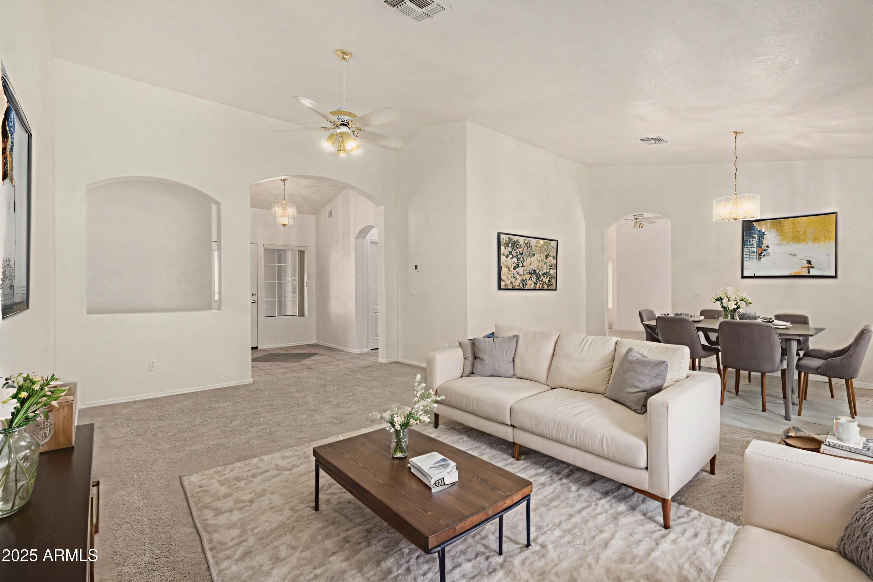 Freshly remodeled residence in the highly sought-after PebbleCreek community. This home is completely move-in ready and designed for comfortable, elegant living. Step inside to discover brand-new carpet throughout and stunning white quartz countertops in the kitchen, bathrooms, and laundry room. The chef's kitchen showcases new stainless steel appliances, expansive quartz counters, and a convenient breakfast bar—perfect for entertaining or casual dining. Multiple living spaces create a bright, semi-open layout filled with natural light from oversized windows. The interior has been freshly painted in a warm cream-white palette, giving every room a clean, inviting feel. Other updates include new faucets, sinks & valves. Oversized lot with large back yard! Photos digitally staged