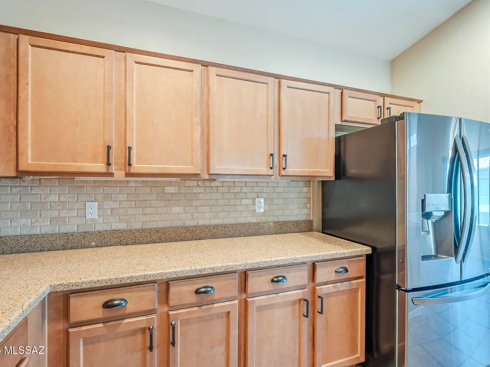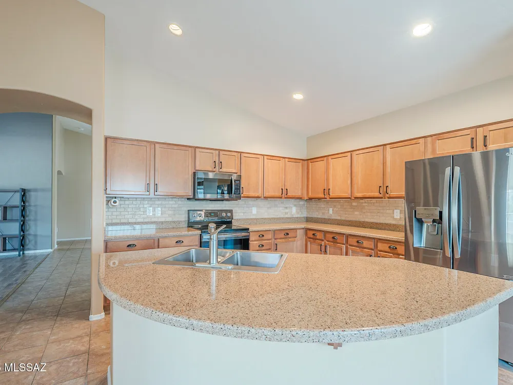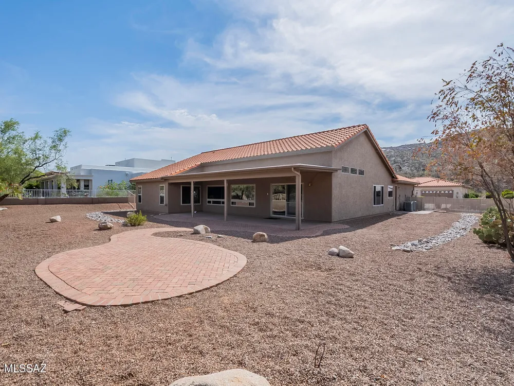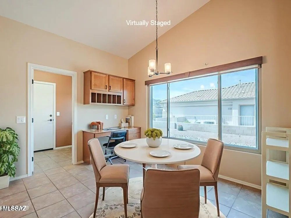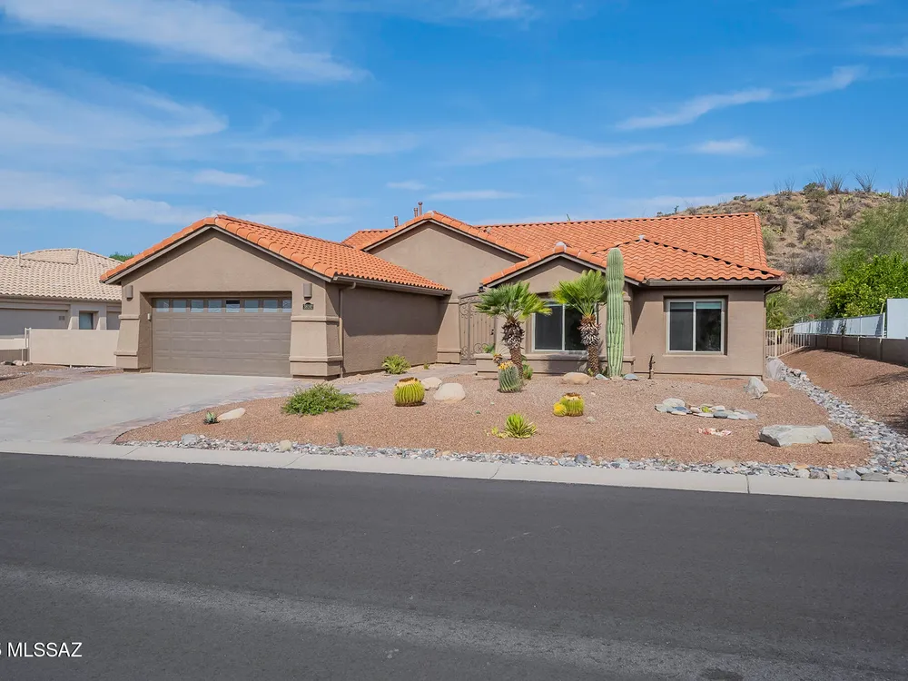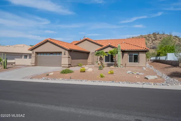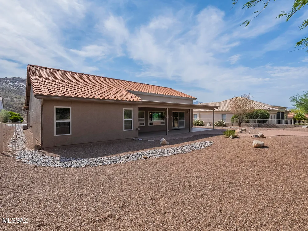 Stylish Montana model blends comfort & charm in Saddlebrooke's scenic enclave. Spacious 3BR/2BA + den features vaulted ceilings, quartz counters, stainless appliances & large picturesque windows in great room. Kitchen boasts beautiful cabinetry, backsplash ('23); island & breakfast nook & new Maytag dishwasher ('23) --ideal for entertaining. Primary suite offers dual vanities, walk-in closet & updated fixtures. Backyard backs to mountainy desert area & has a long covered patio, new fence with 3 gates ('23), low-care landscaping & paver walkways. New roof w/ 50-yr underlayment ('25). Owner carryback available--don't miss this move-in ready gem! Now Get to know the SaddleBrooke Lifestyle: Welcome to SaddleBrooke One an established, beautifully maintained neighborhood nestled in the