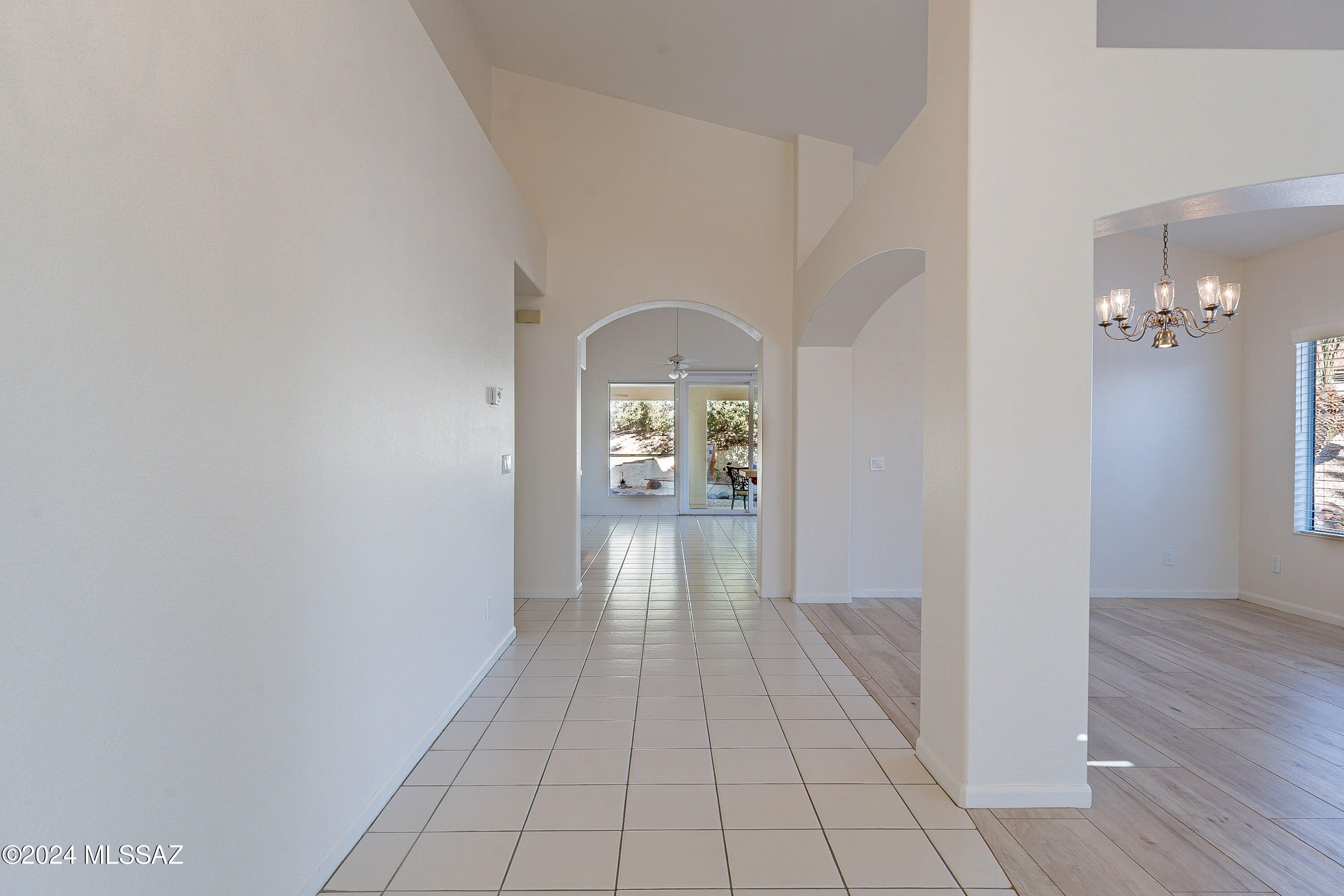 Enveloped in serenity, this beautifully updated Hermosa design in the well-regarded active adult community of SaddleBrooke offers a tranquil desert retreat with breathtaking mountain views and ultimate privacy. Freshly painted and updated, this move-in-ready home is designed for both relaxation and effortless entertaining. A secluded side yard is a true private oasis, featuring a sparkling pool and spa, lush mature landscaping with graceful palm and pine trees, and an expansive terrace ideal for soaking in the stunning mountain backdrop. The recently relandscaped rear yard showcases beautiful desert plantings and multiple serene lounging areas, perfect for enjoying Arizona's spectacular sunsets.