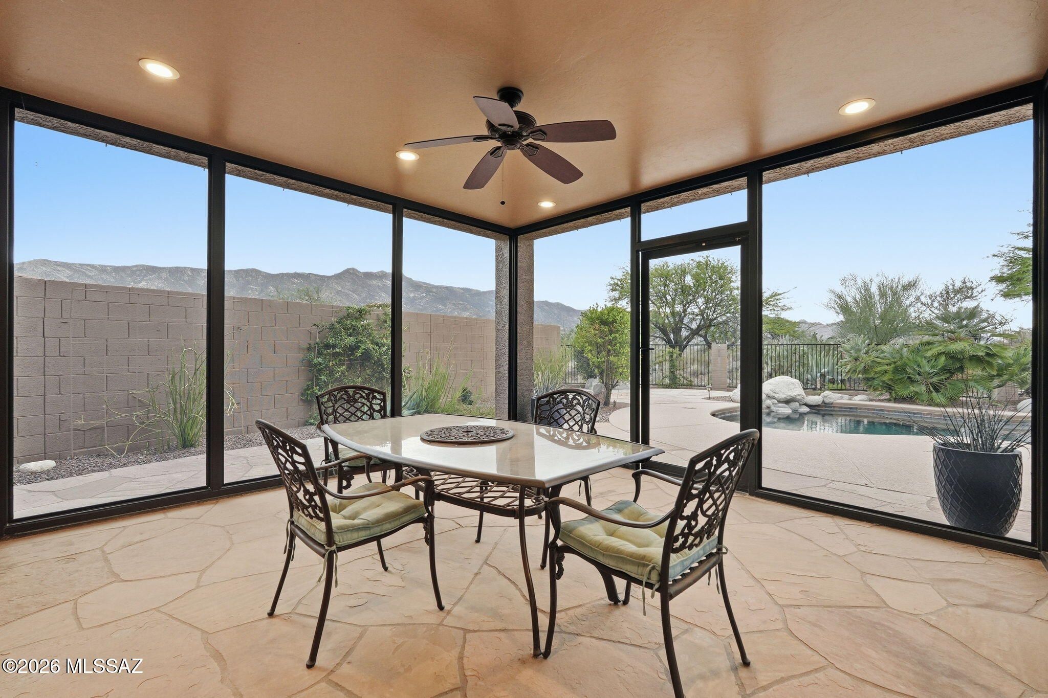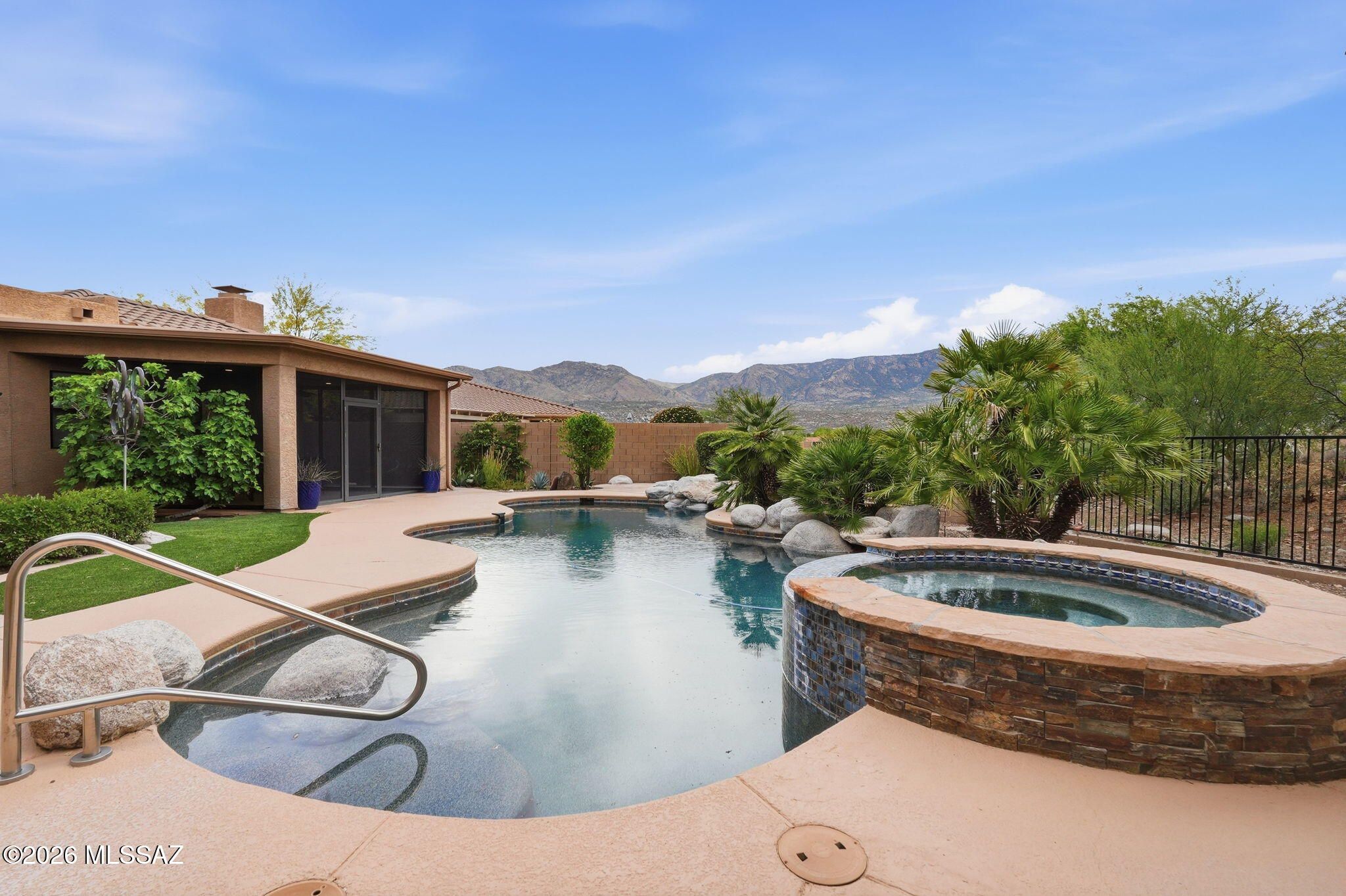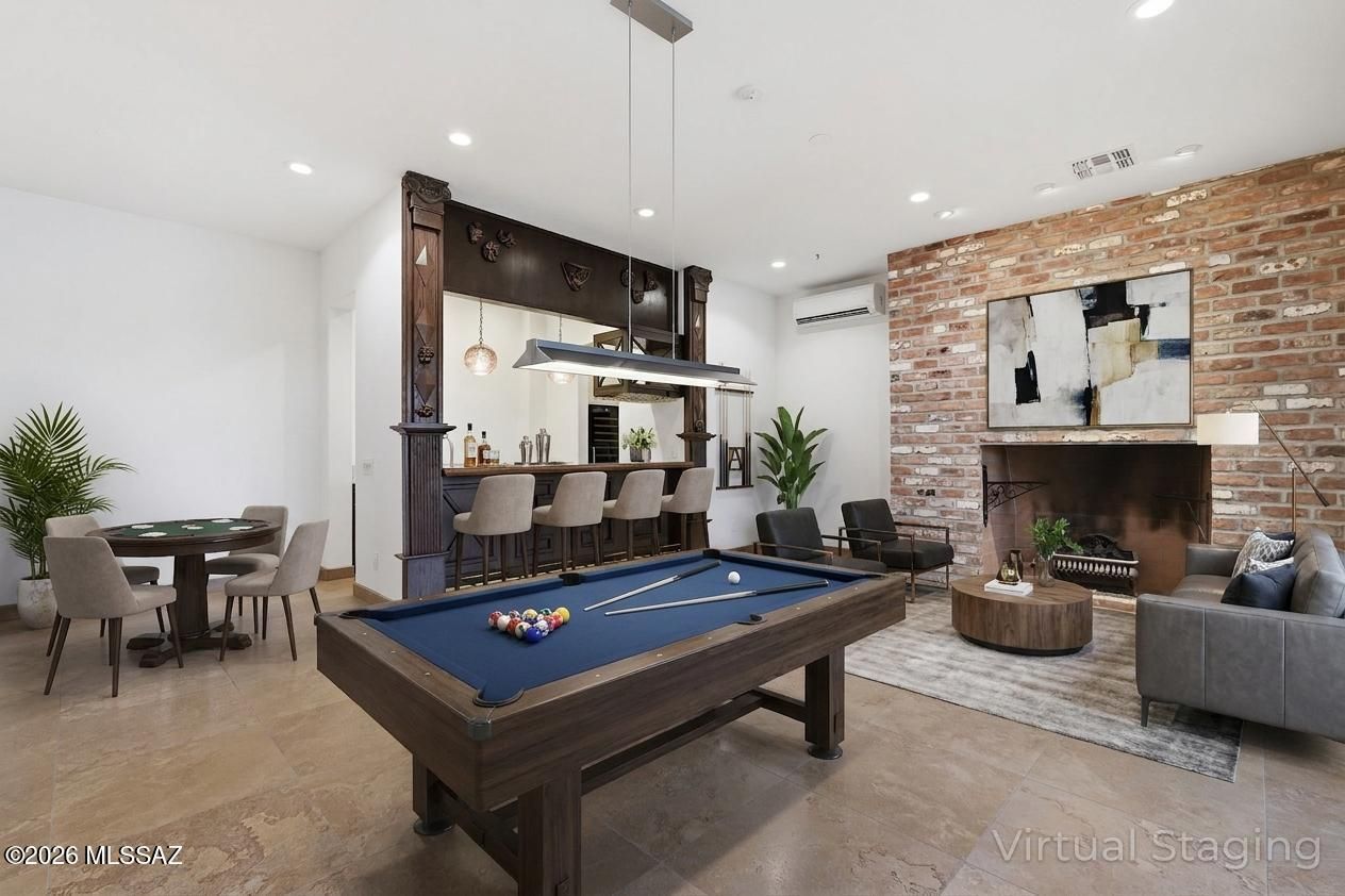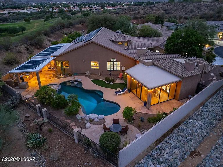 Spectacular property-an entertainer's dream and true desert oasis. This 2-bedroom, 2 full/2 half bath home features a gourmet kitchen with dual Wolf ovens, Wolf gas cooktop, granite countertops, Miele dishwasher, SubZero refrigerator/freezer, wine cooler, Scotsman icemaker, and venting hood with warming lamps and racks. The primary suite offers a see-through fireplace to the patio, French doors, steam shower, heat lamps, skylight, and heated towel rack. The expansive rec room includes billiards space, wet bar, private bath, and Arizona room, plus a fireplace with floor-to-ceiling brick facade. Library, office, and laundry/hobby room and flexibility. Outdoors, enjoy a saltwater solar-heated pool, spa, screened patio, outdoor kitchen with built-in BBQ, and mountain views. Welcome home!
