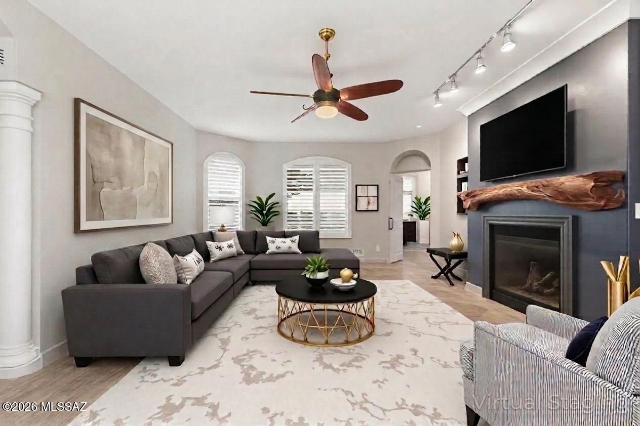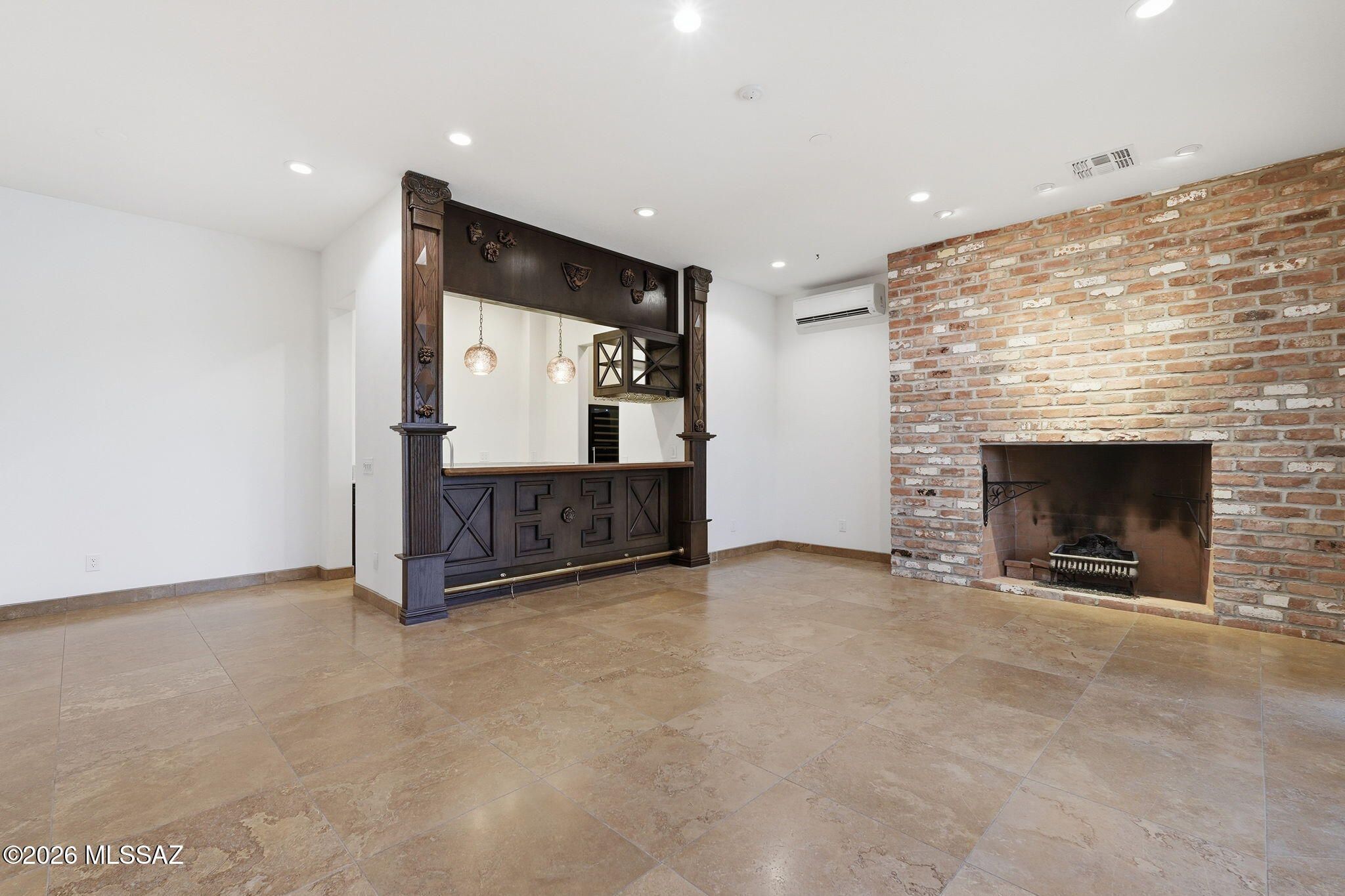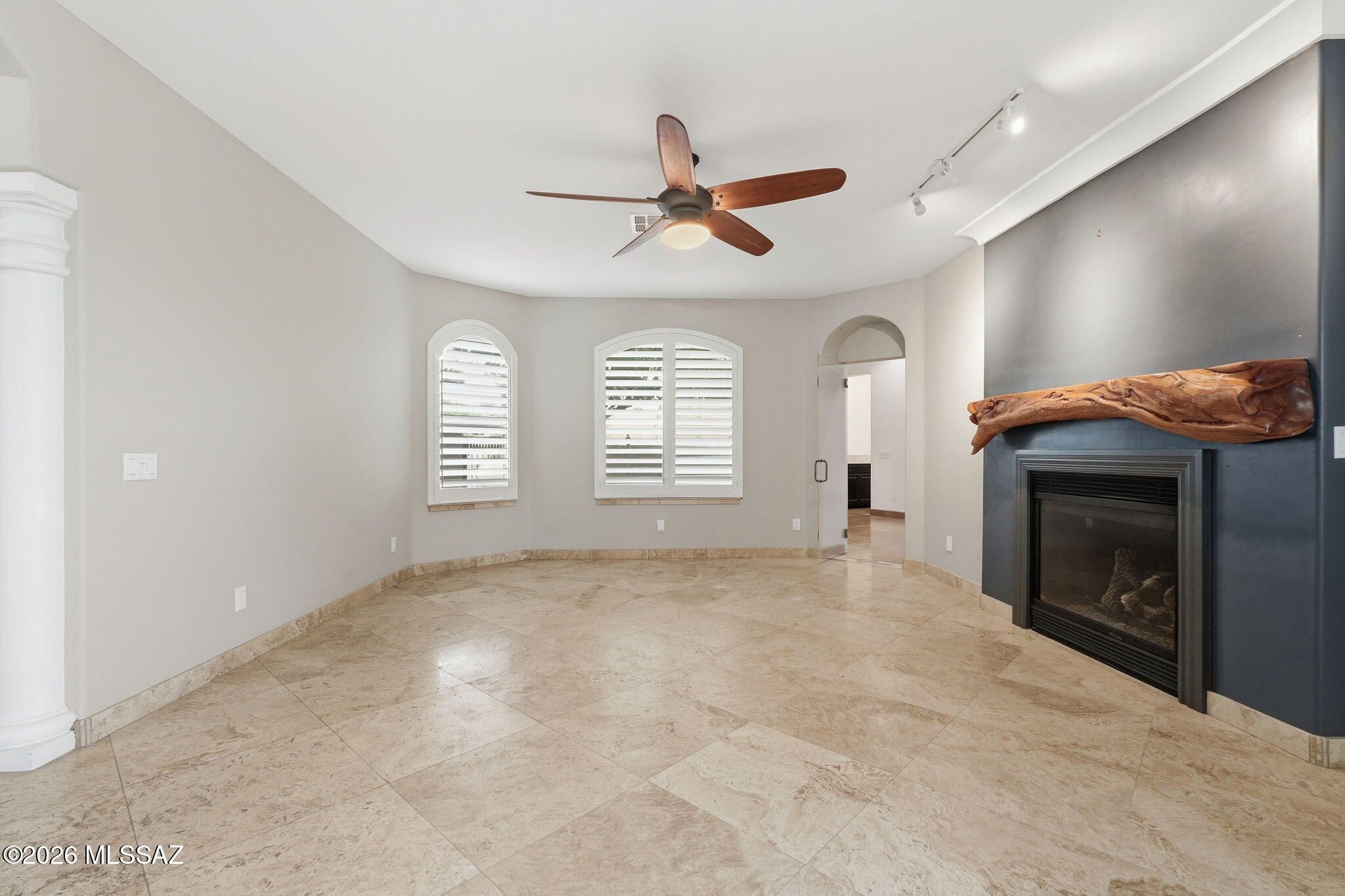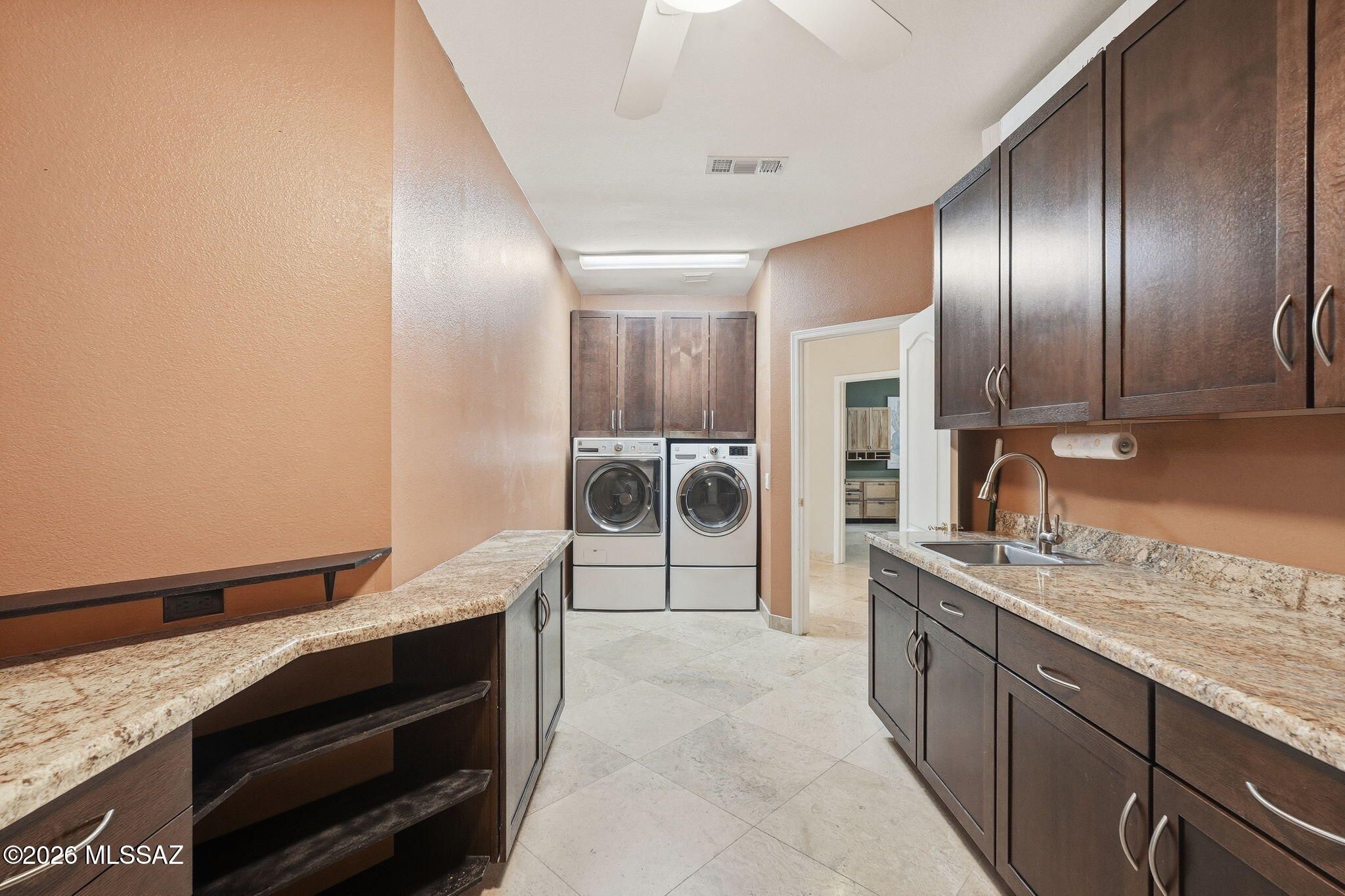 Spectacular property-an entertainer's dream and true desert oasis. This 2-bedroom, 2 full/2 half bath home features a gourmet kitchen with dual Wolf ovens, Wolf gas cooktop, granite countertops, Miele dishwasher, SubZero refrigerator/freezer, wine cooler, Scotsman icemaker, and venting hood with warming lamps and racks. The primary suite offers a see-through fireplace to the patio, French doors, steam shower, heat lamps, skylight, and heated towel rack. The expansive rec room includes billiards space, wet bar, private bath, and Arizona room, plus a fireplace with floor-to-ceiling brick facade. Library, office, and laundry/hobby room and flexibility. Outdoors, enjoy a saltwater solar-heated pool, spa, screened patio, outdoor kitchen with built-in BBQ, and mountain views. Welcome home!
