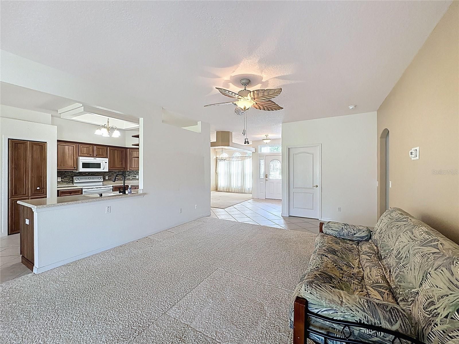 - Ceiling Fan(s), Eat-in Kitchen, High Ceilings, Kitchen/Family Room Combo, Open Floorplan, Main Level Primary, Solid Surface Counters, Thermostat, Walk-In Closet(s), Window Treatments
