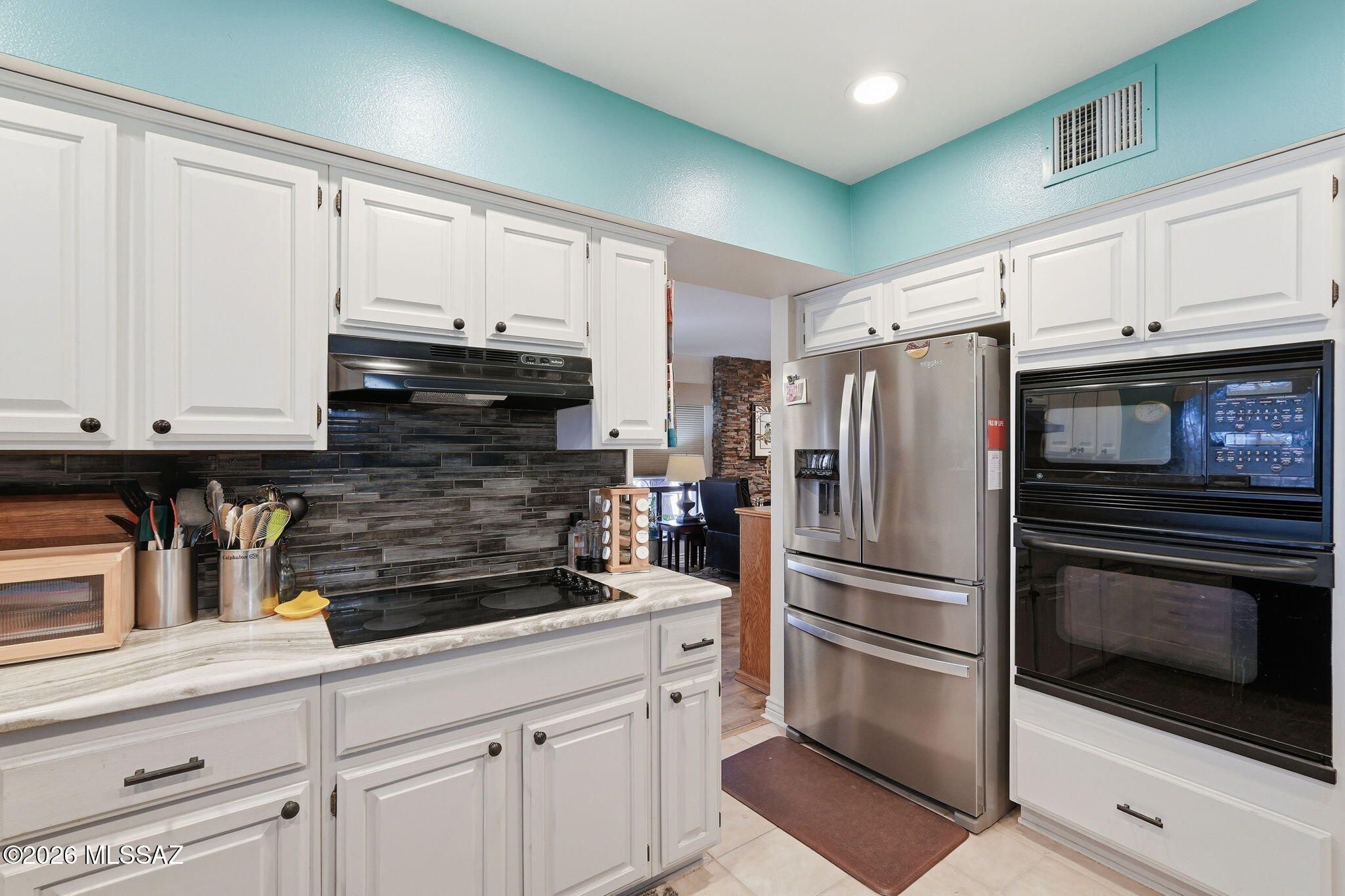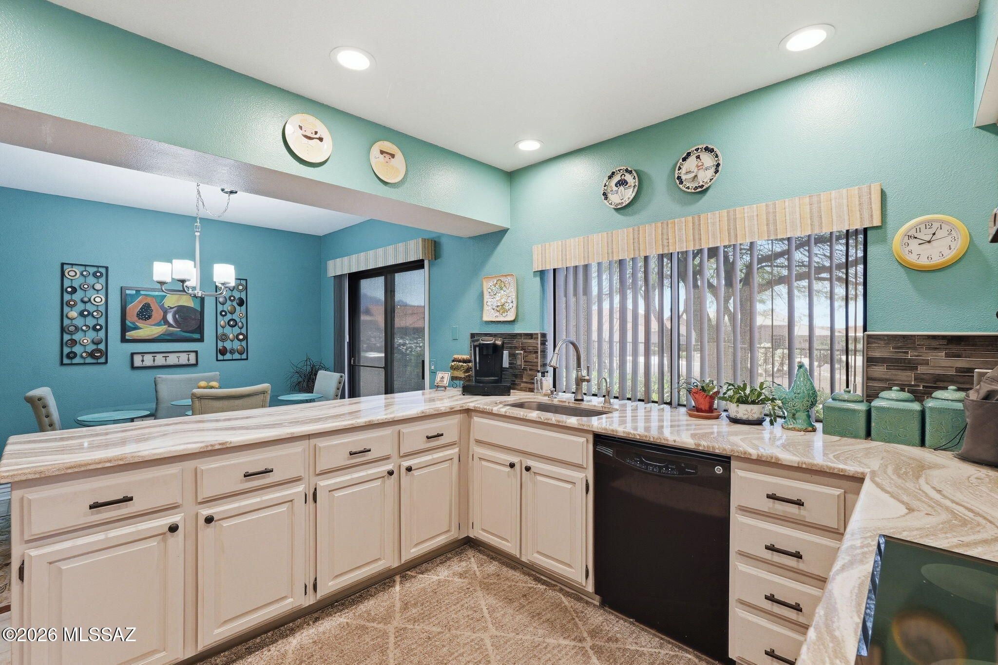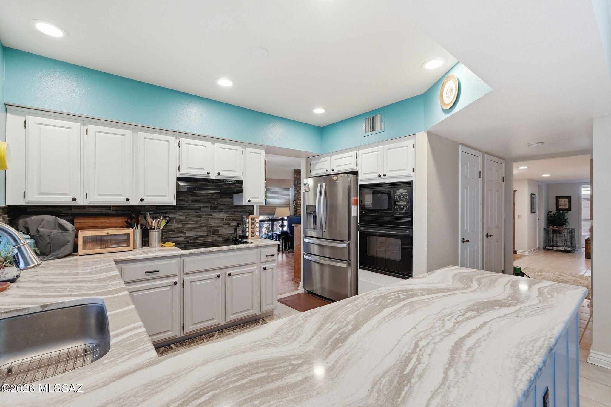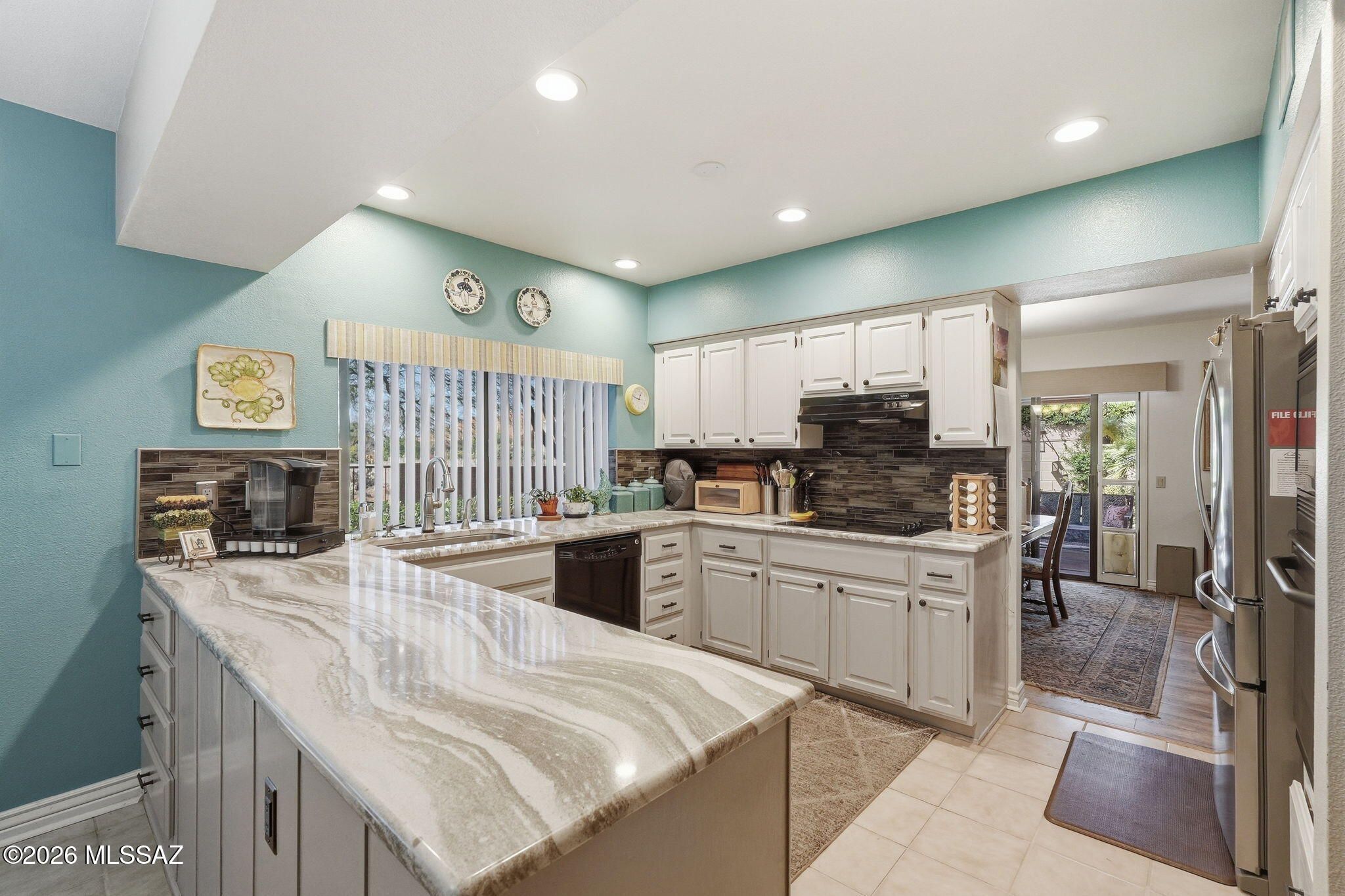 Welcome to this beautifully maintained 3 BD/2BA Alameda model in the highly desirable active-adult community of SaddleBrooke. This inviting home features a bright, open floor plan perfect for everyday living and entertaining. The updated kitchen showcases elegant quartz countertops, complemented by a convenient quartz wet bar ideal for hosting guests. Both bathrooms have been tastefully updated, and the cozy gas fireplace adds warmth and charm to the living space. Additional highlights include ceiling fans in all bedrooms, recirculating water pump, fresh exterior paint (2025), hot tub hookup, and updated irrigation system. Step outside to enjoy the private backyard featuring two citrus trees and a dedicated garden area, creating the perfect setting for relaxing or outdoor hobbies.