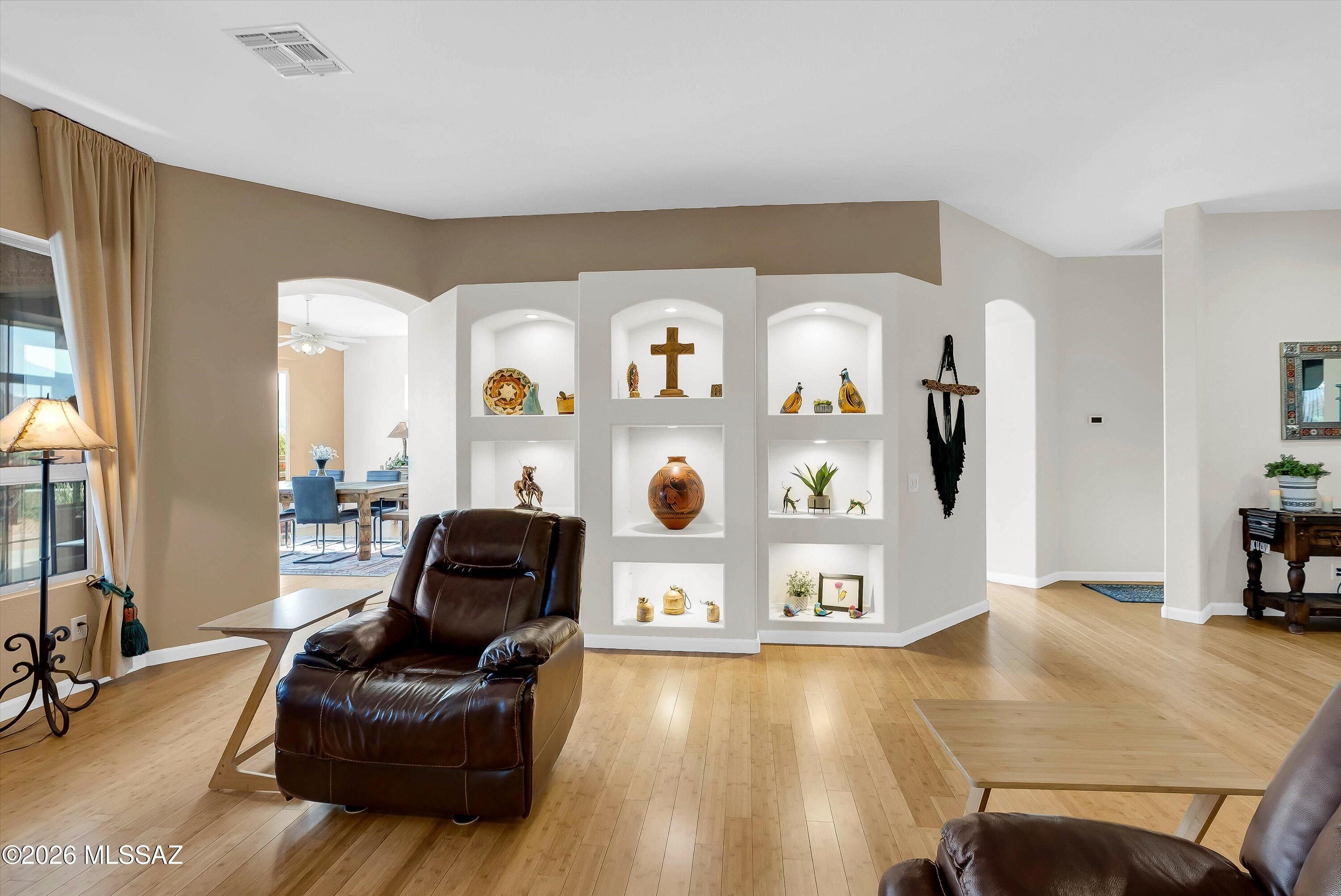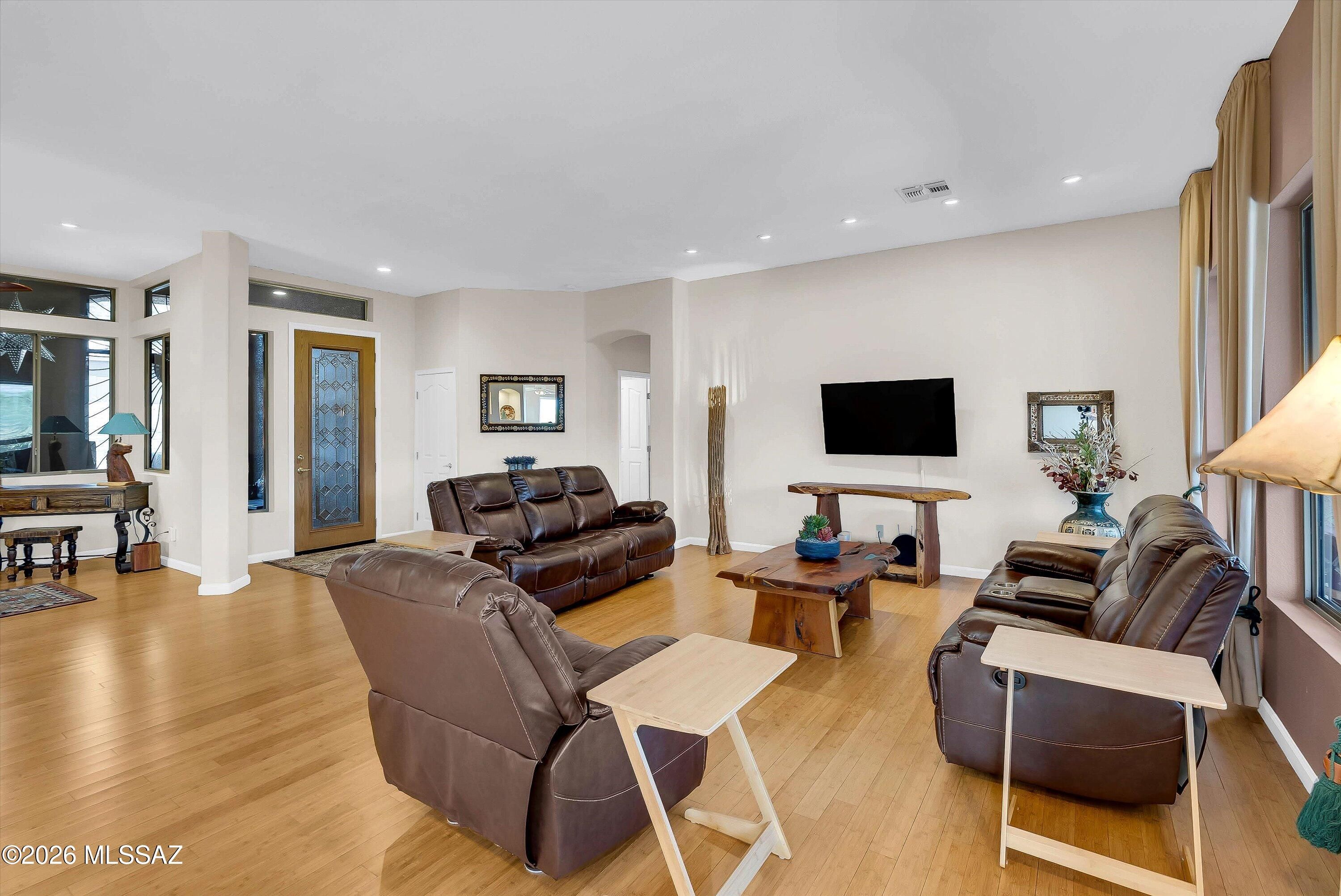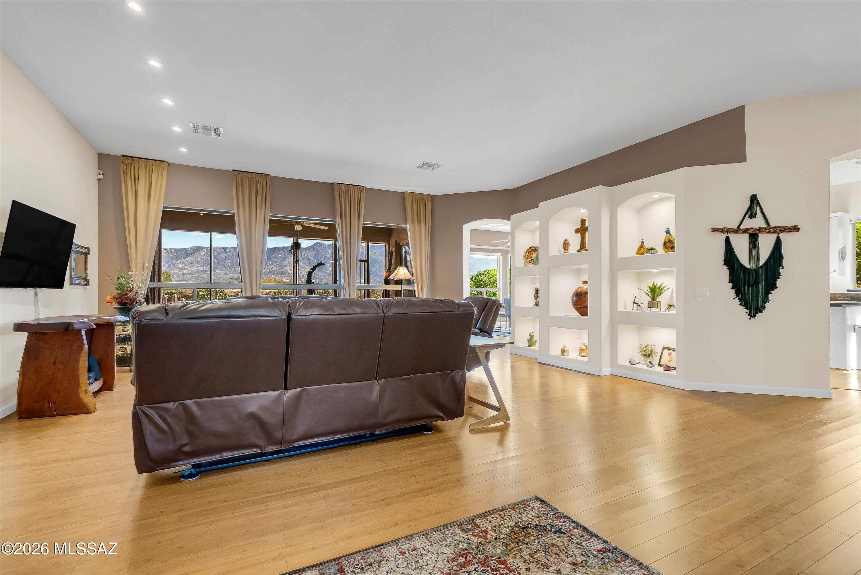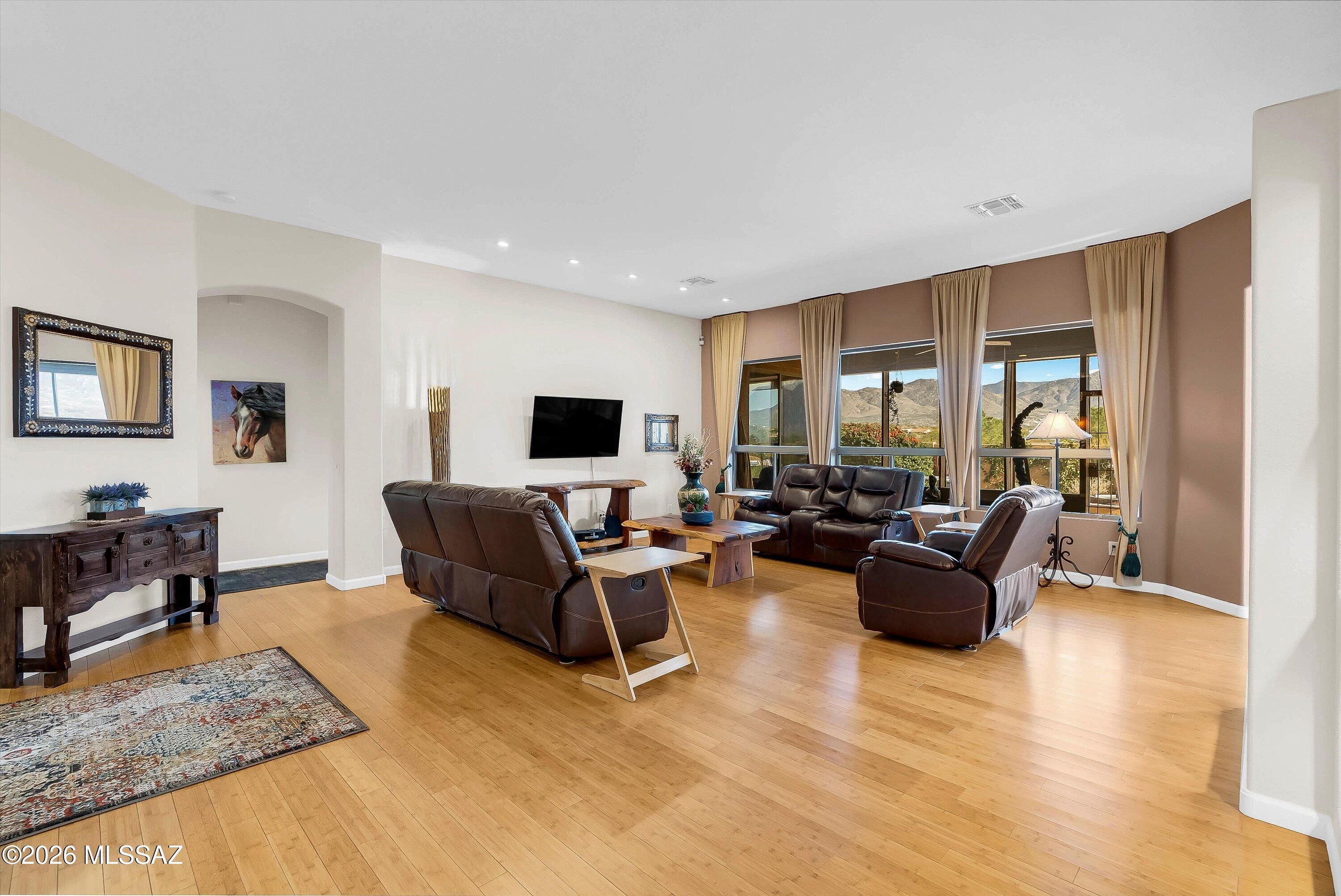 EXCEPTIONAL 3BD/2BA (2,413 sq ft) East facing Dakota model on elevated lot boasts an Arizona room plus front view of hill and rear panoramic Catalina views from inside & out. This lovingly cared for home can be purchased TURNKEY with all personal property available for purchase on a separate Bill of Sale (see Exclusion list). Sealed bamboo plank flooring is featured in most rooms with carpeted Primary suite. Countless updates include newer roof, windows, water heater, zoned HVAC system and more! Dramatic wrought iron gate encloses front porch while rolling shutters at rear of home provide privacy, security & interior cooling. Enter to find a dramatic living room with backlit display wall, dining room (or den/office), open concept Great room for casual living plus a split bedroom