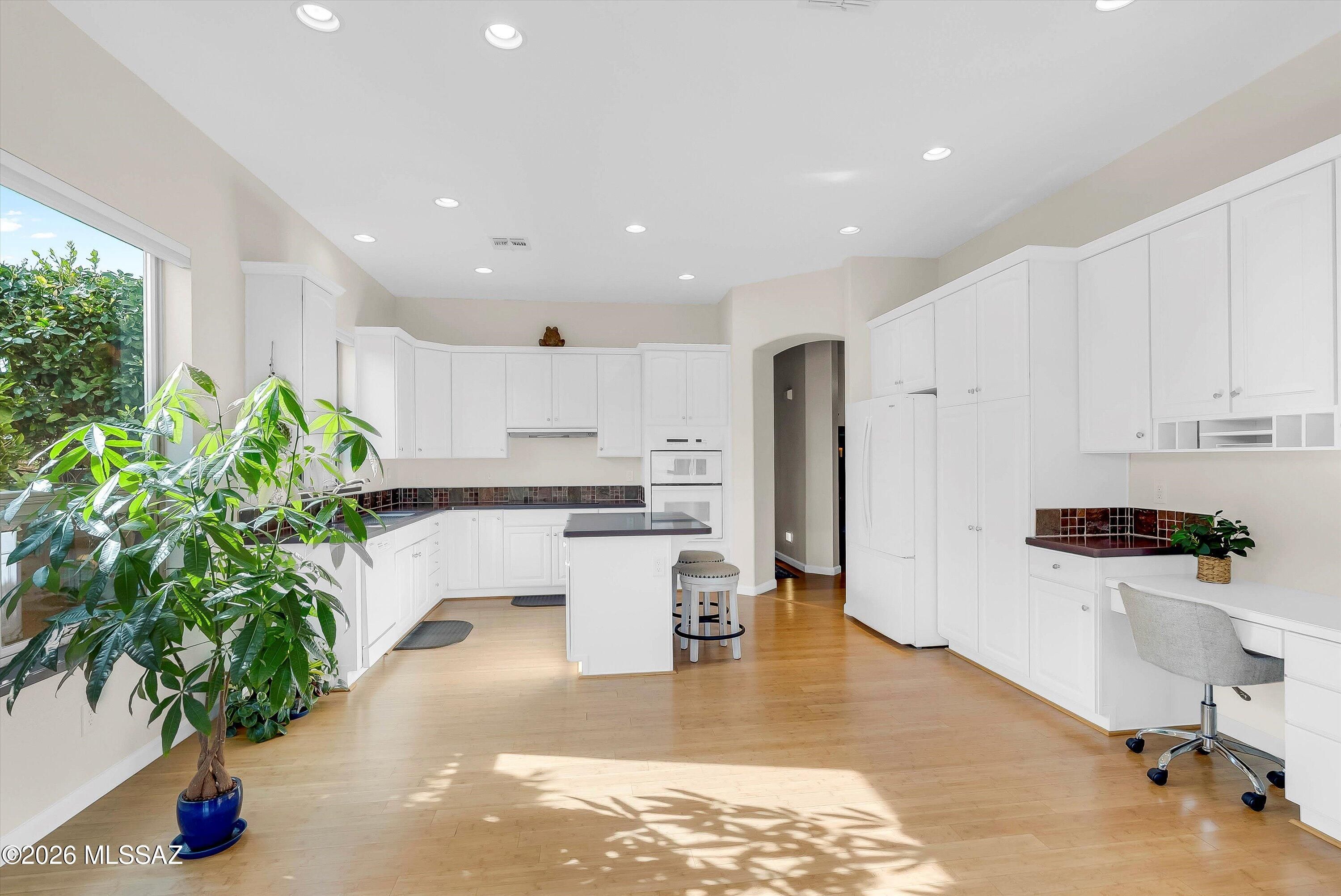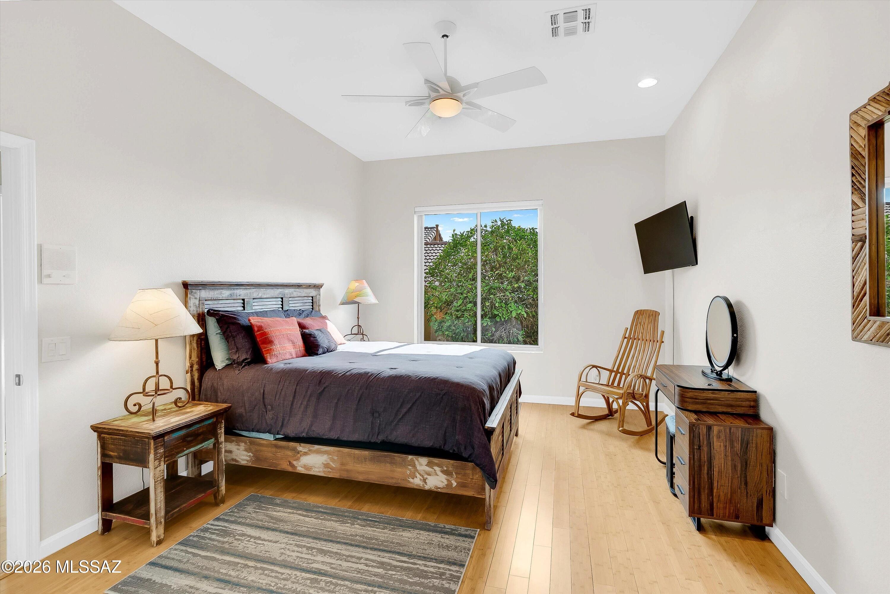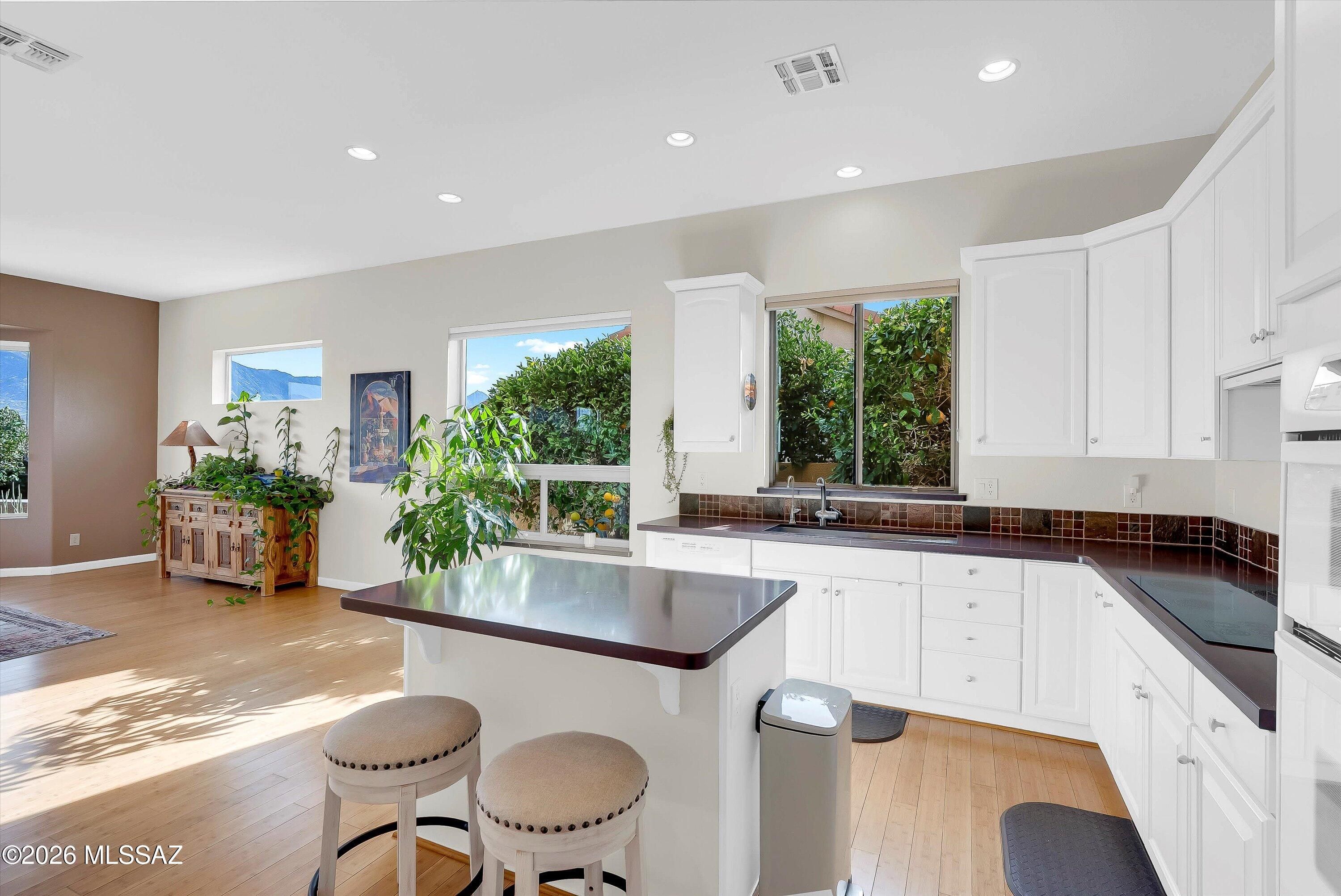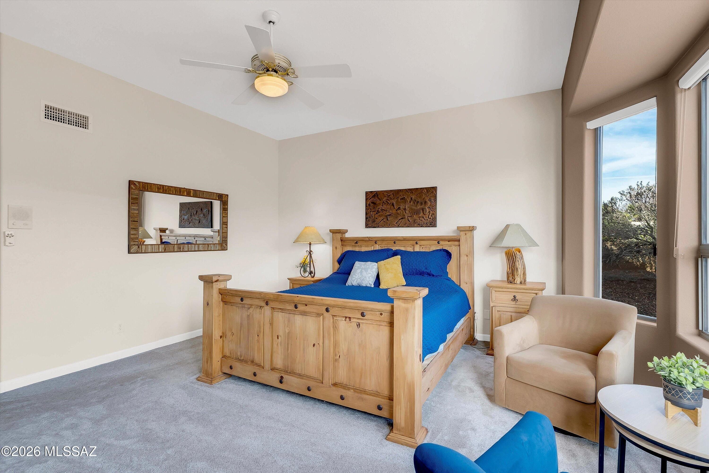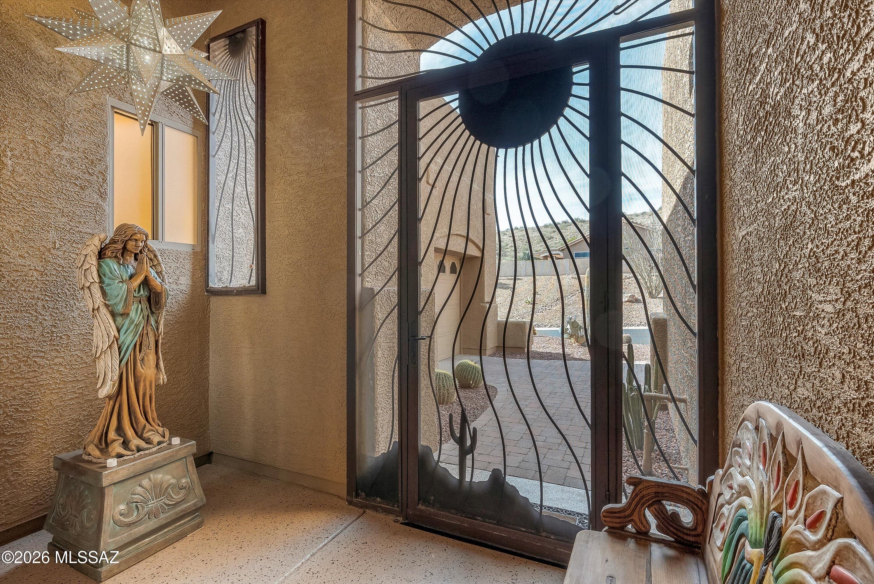 EXCEPTIONAL 3BD/2BA (2,413 sq ft) East facing Dakota model on elevated lot boasts an Arizona room plus front view of hill and rear panoramic Catalina views from inside & out. This lovingly cared for home can be purchased TURNKEY with all personal property available for purchase on a separate Bill of Sale (see Exclusion list). Sealed bamboo plank flooring is featured in most rooms with carpeted Primary suite. Countless updates include newer roof, windows, water heater, zoned HVAC system and more! Dramatic wrought iron gate encloses front porch while rolling shutters at rear of home provide privacy, security & interior cooling. Enter to find a dramatic living room with backlit display wall, dining room (or den/office), open concept Great room for casual living plus a split bedroom