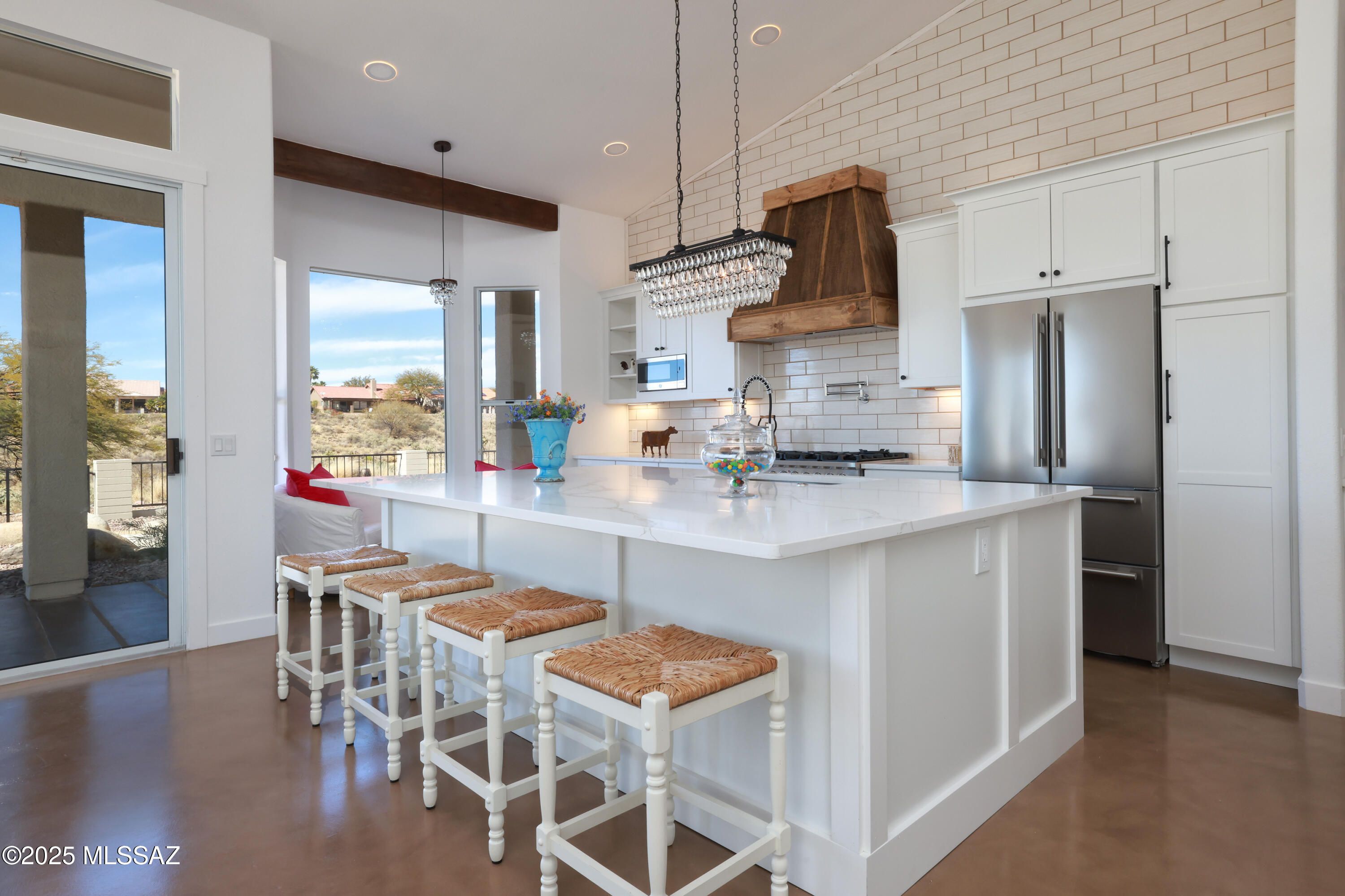 Views! Views of mountains and golf course. Newly renovated golf course property. Open floor plan and fantastic for entertaining or enjoying the captivating impeccable location of Saddlebrooke, highly coveted 55+ community. Dual fuel 8 burner 48'' range with double oven, new refrigerator and washer and dryer included with sale. Pot filler at range. Gorgeous concrete floors. New exterior and interior paint. Master shower with seat and additional hand held sprayer at seat. You would be lucky to call this home. Oversized lot can accept a casita addition. Waterfall feature in the back yard, located on the 6th hole. Formerly Fiesta model (renovation brought changes). Seller is a licensed AZ Realtor.