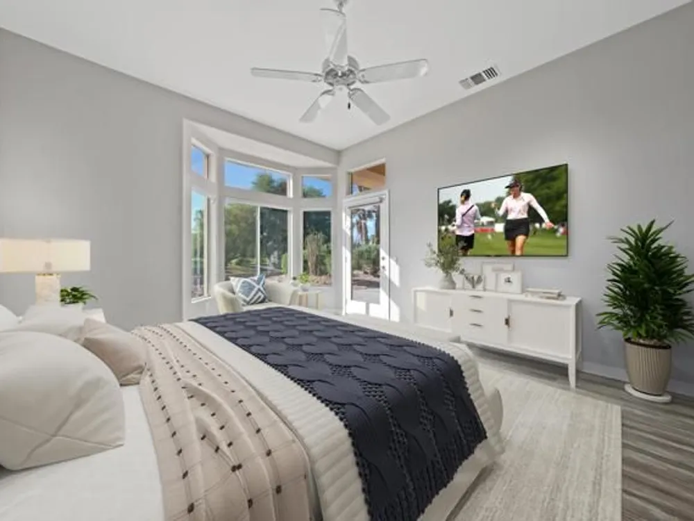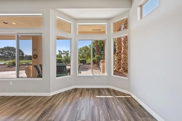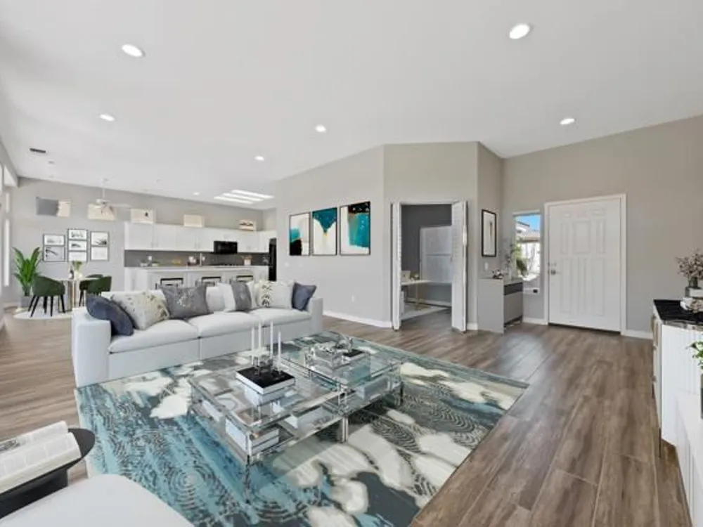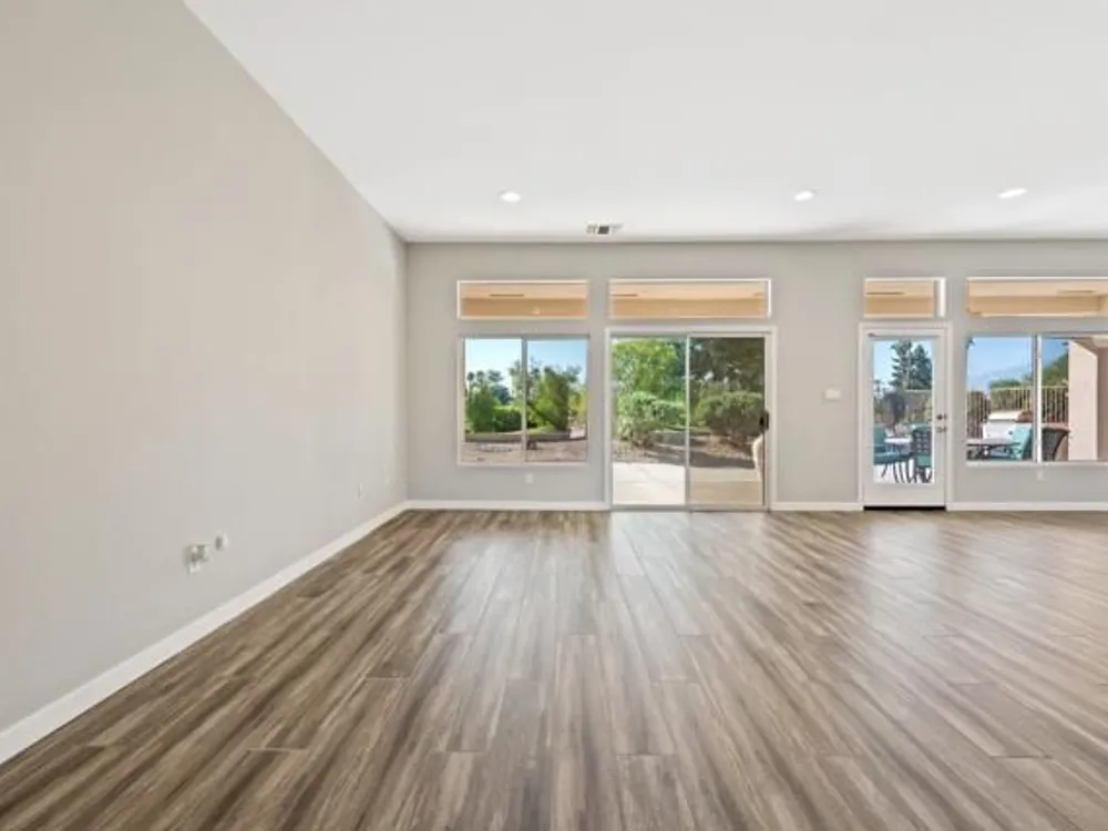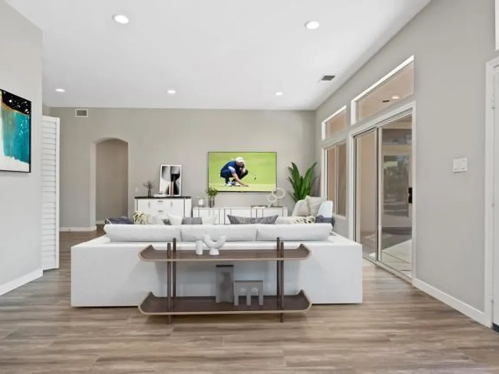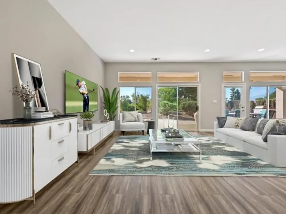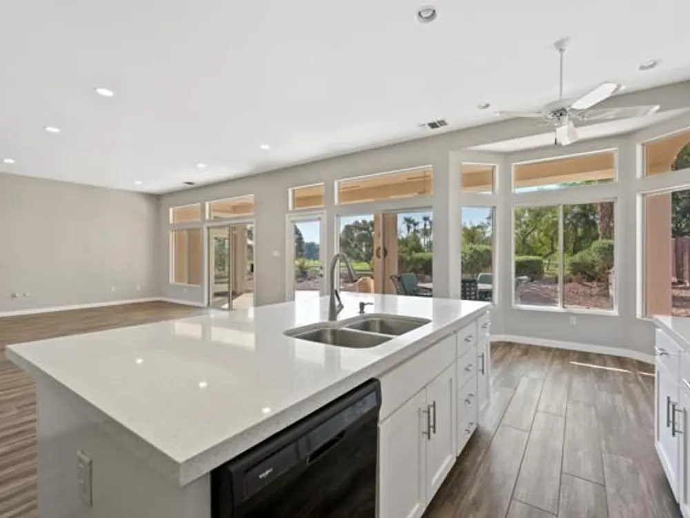 Sun City Palm Desert - Orrefors. This beautifully reimagined Orrefors floor plan has been transformed into a stunning great room design, perfectly positioned overlooking the 11th fairway with sweeping views of the lake, multiple fairways, and surrounding mountains. The southeast-facing backyard offers an expansive salt-finished patio surrounded by low-maintenance desert landscaping--ideal for outdoor living and entertaining. A gated front courtyard enhances both curb appeal and privacy. Inside, 10-foot ceilings and transom windows create a bright, open atmosphere. Wood-plank style tile floors, upgraded baseboards, and modern finishes run throughout. The kitchen features quartz countertops, a glass subway tile backsplash, a chef's island with breakfast bar, and upgraded shaker cabinetry, hardware, sink, and fixtures. Adjacent to the great room is a versatile den/office. The primary suite boasts a bay window, direct patio access, a large walk-in closet, and an en suite bath with dual sinks, a glass-enclosed shower, and a dramatic skylight. The guest bedroom offers mirrored wardrobe doors and easy access to the full guest bath with a tub/shower combination. Additional highlights include a laundry room with storage and sink option, and a 2-car garage with golf cart nook, epoxy flooring, and built-in storage.