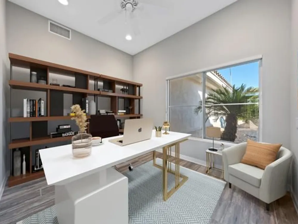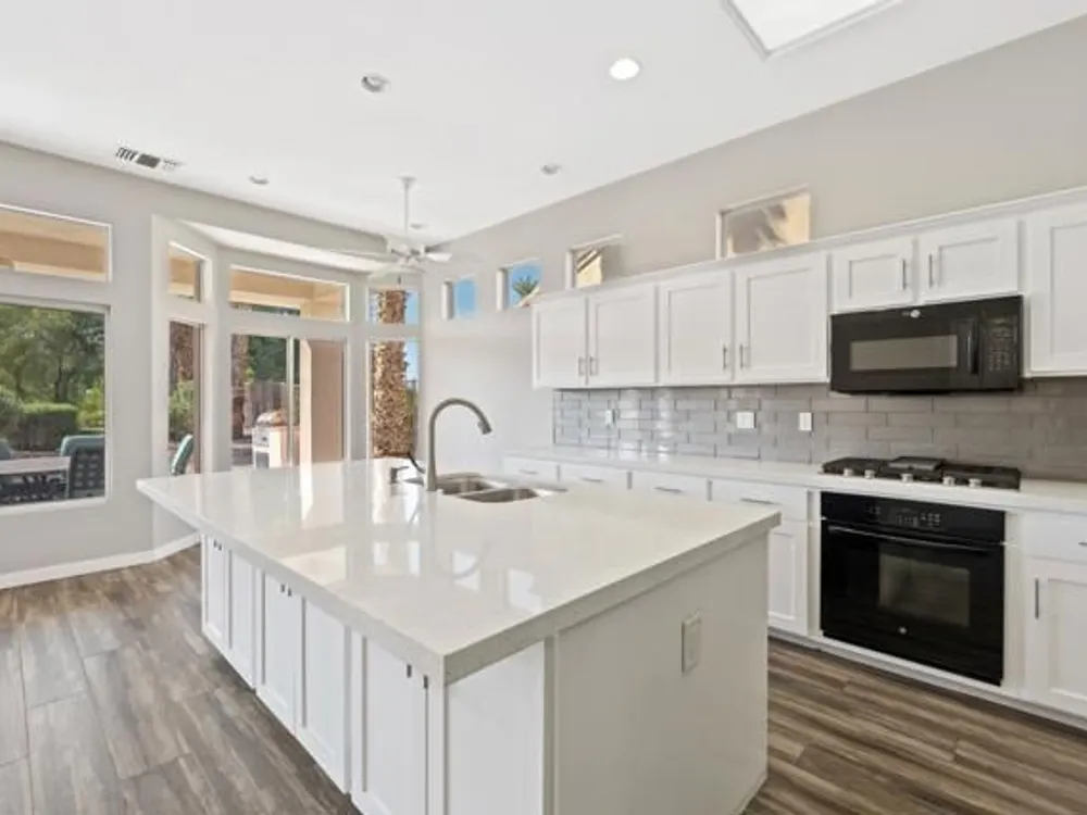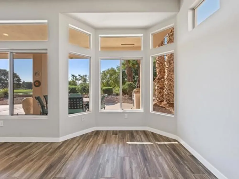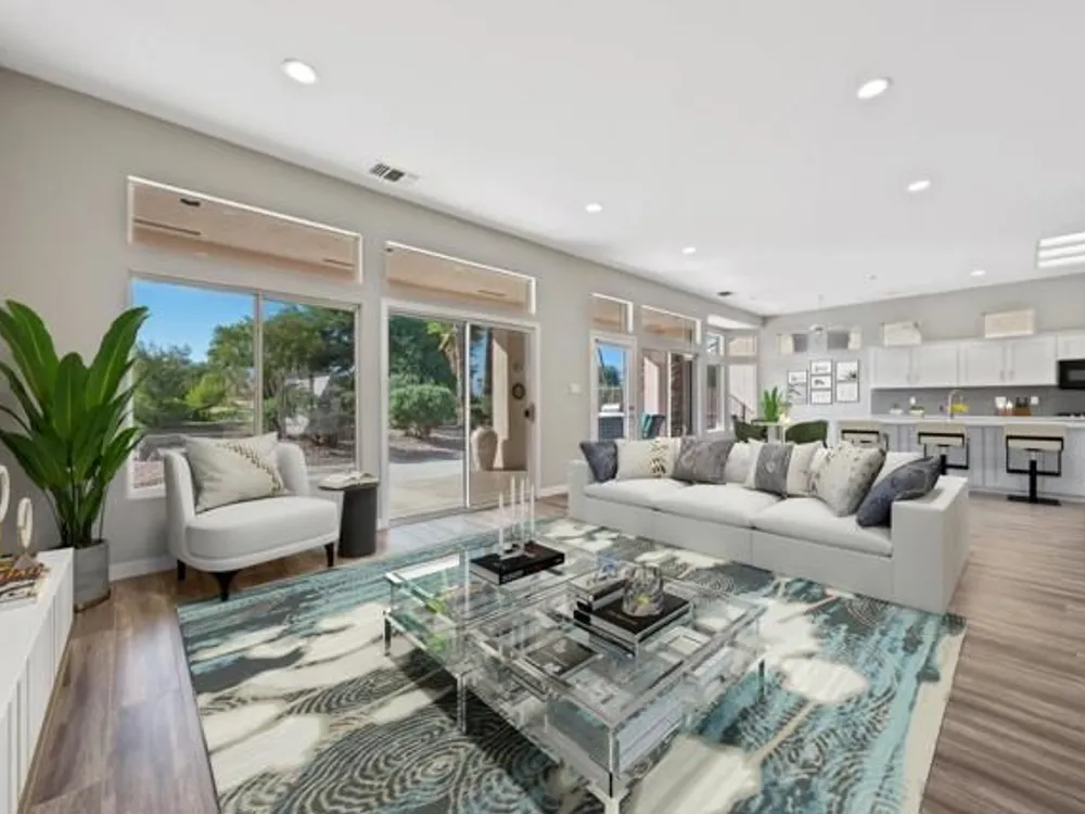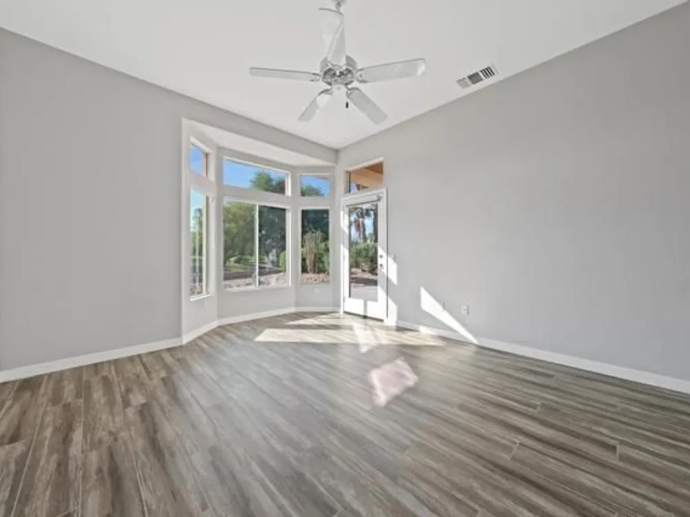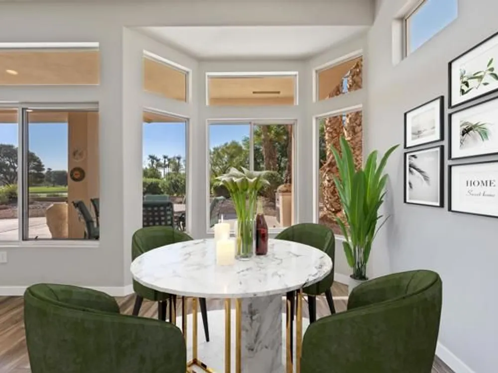 Sun City Palm Desert - Orrefors. This beautifully reimagined Orrefors floor plan has been transformed into a stunning great room design, perfectly positioned overlooking the 11th fairway with sweeping views of the lake, multiple fairways, and surrounding mountains. The southeast-facing backyard offers an expansive salt-finished patio surrounded by low-maintenance desert landscaping--ideal for outdoor living and entertaining. A gated front courtyard enhances both curb appeal and privacy. Inside, 10-foot ceilings and transom windows create a bright, open atmosphere. Wood-plank style tile floors, upgraded baseboards, and modern finishes run throughout. The kitchen features quartz countertops, a glass subway tile backsplash, a chef's island with breakfast bar, and upgraded shaker cabinetry, hardware, sink, and fixtures. Adjacent to the great room is a versatile den/office. The primary suite boasts a bay window, direct patio access, a large walk-in closet, and an en suite bath with dual sinks, a glass-enclosed shower, and a dramatic skylight. The guest bedroom offers mirrored wardrobe doors and easy access to the full guest bath with a tub/shower combination. Additional highlights include a laundry room with storage and sink option, and a 2-car garage with golf cart nook, epoxy flooring, and built-in storage.