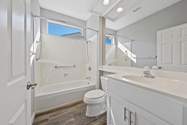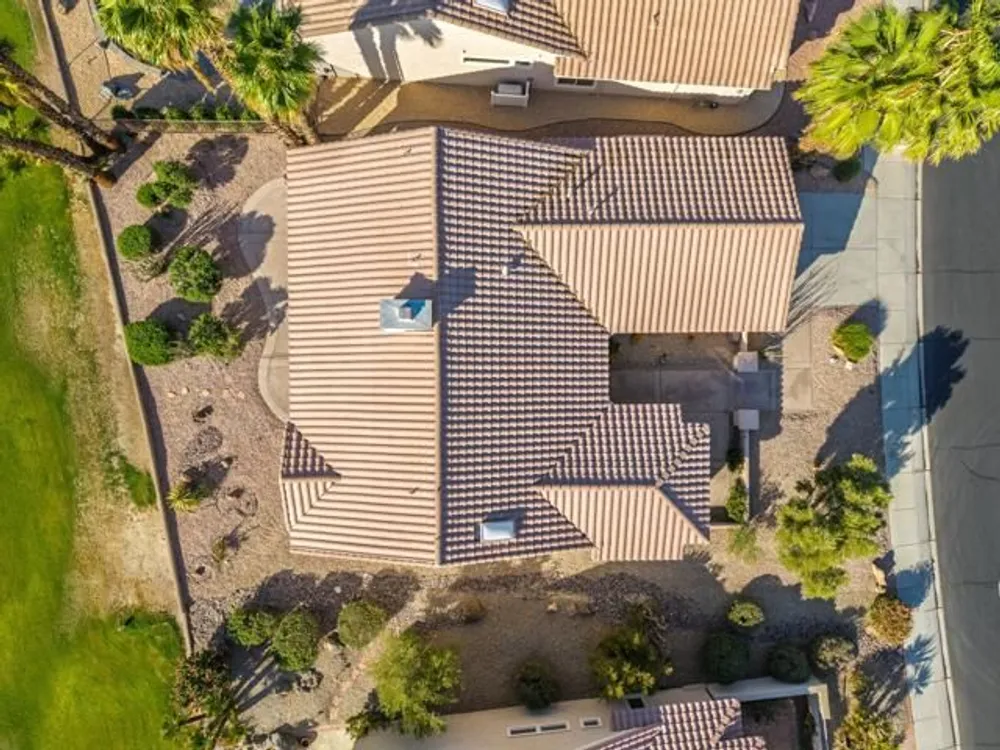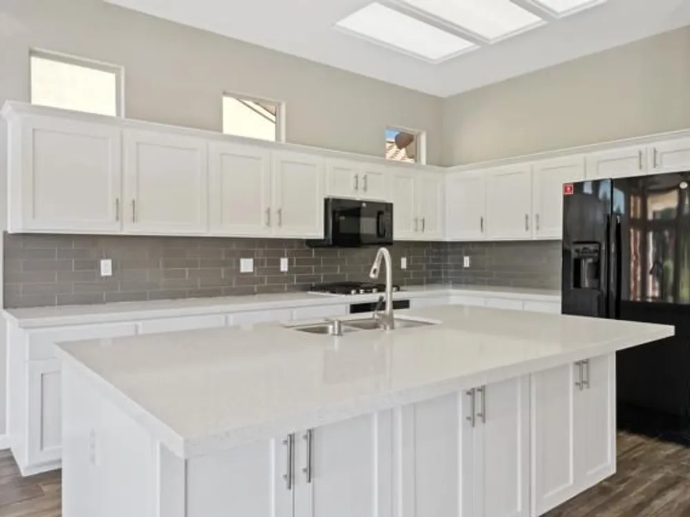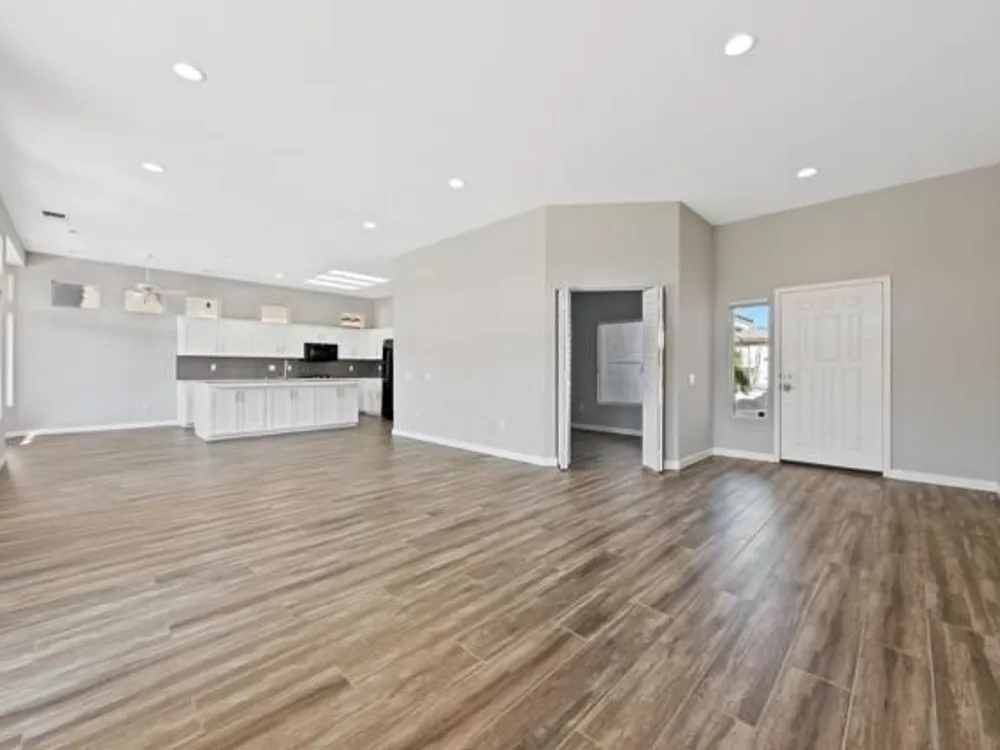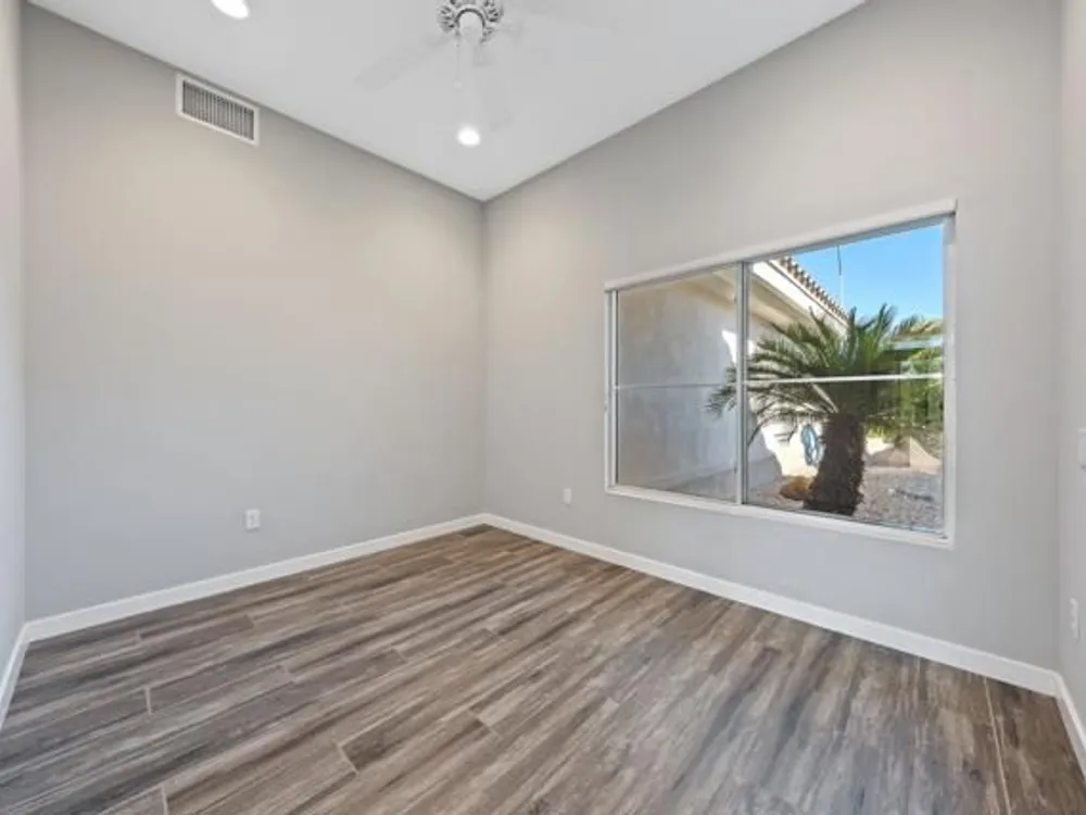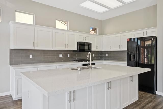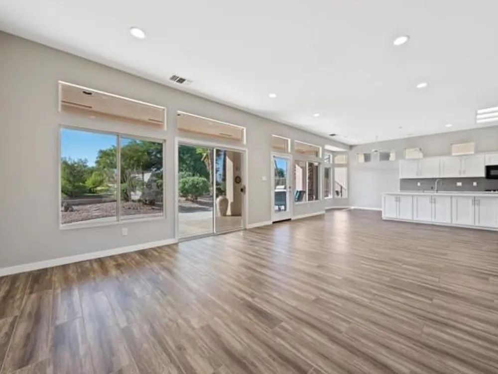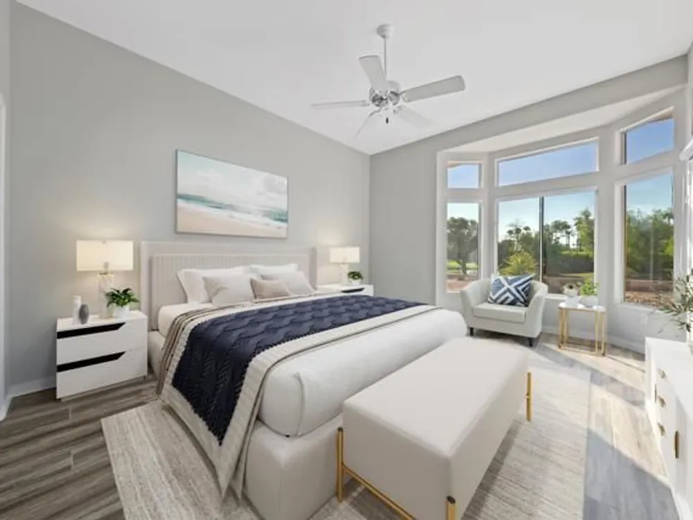 Sun City Palm Desert - Orrefors. This beautifully reimagined Orrefors floor plan has been transformed into a stunning great room design, perfectly positioned overlooking the 11th fairway with sweeping views of the lake, multiple fairways, and surrounding mountains. The southeast-facing backyard offers an expansive salt-finished patio surrounded by low-maintenance desert landscaping--ideal for outdoor living and entertaining. A gated front courtyard enhances both curb appeal and privacy. Inside, 10-foot ceilings and transom windows create a bright, open atmosphere. Wood-plank style tile floors, upgraded baseboards, and modern finishes run throughout. The kitchen features quartz countertops, a glass subway tile backsplash, a chef's island with breakfast bar, and upgraded shaker cabinetry, hardware, sink, and fixtures. Adjacent to the great room is a versatile den/office. The primary suite boasts a bay window, direct patio access, a large walk-in closet, and an en suite bath with dual sinks, a glass-enclosed shower, and a dramatic skylight. The guest bedroom offers mirrored wardrobe doors and easy access to the full guest bath with a tub/shower combination. Additional highlights include a laundry room with storage and sink option, and a 2-car garage with golf cart nook, epoxy flooring, and built-in storage.