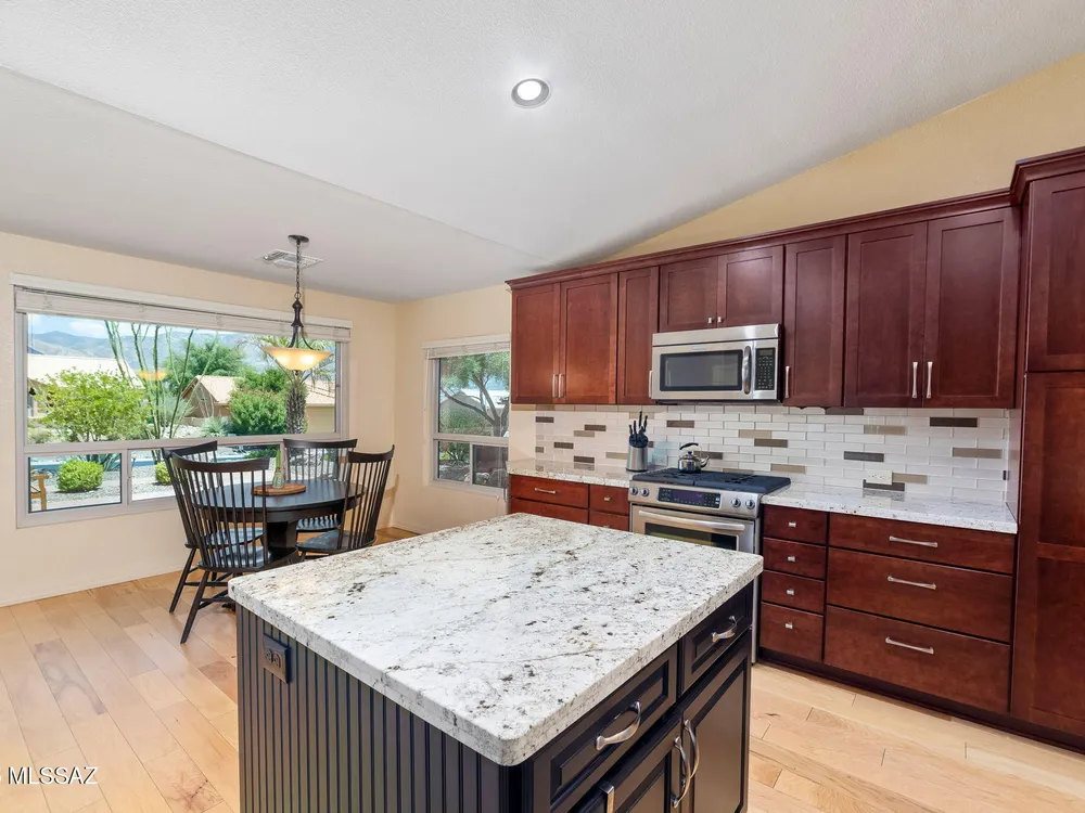 Range priced from $550,000- $569,000. Immaculately maintained Laredo model with stunning mountain views and a private backyard--no rear neighbors and elevated lot offer rare seclusion. Upgraded kitchen features soft-close cabinets, extended island, granite counters, pull-out storage, and newer stainless appliances. Additional upgrades include remodeled baths, engineered hardwood floors, designer paint, stylish window treatments, and screened security doors. The primary suite offers a new walk-in shower.Back wall extended 5-6 feet, bedroom slider freshly painted, and a new roof installed last year. Updated irrigation supports lush landscaping and a tranquil waterfall.Extended two-car garage offers added length and width. Move-in ready with comfort, style, and serene outdoor living.