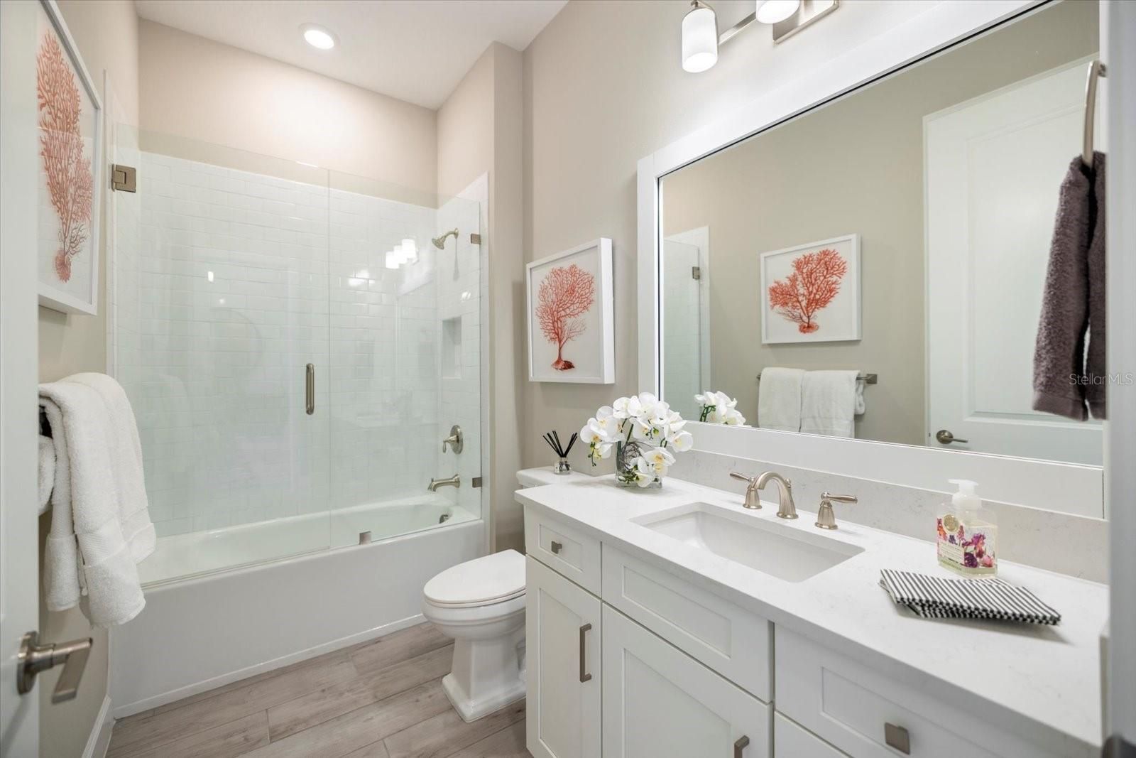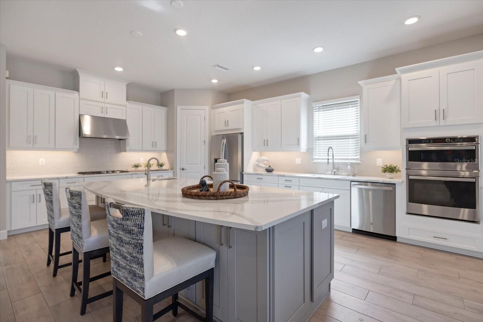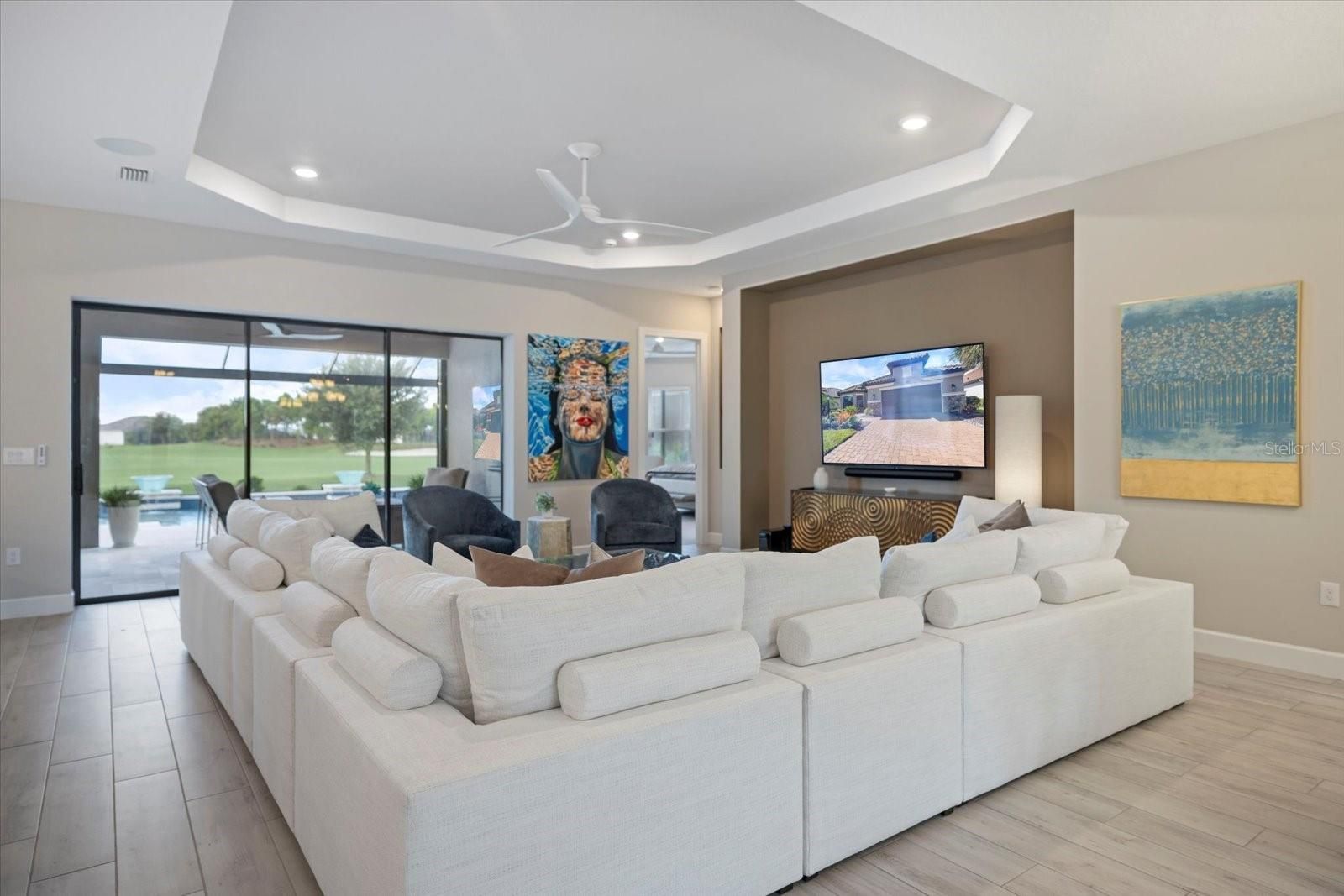 Discover an unparalleled lifestyle with this exceptional home, complete with deeded golf membership, located in the highly coveted Esplanade at Azario community in Lakewood Ranch, Florida, with a Southern exposure and breathtaking sunsets! This exquisite single-family residence encompasses 3,101 square feet of meticulously crafted living space, featuring 3 bedrooms, 3 baths, a den, and additional tandem space in the garage. Positioned on the 2nd fairway, this home offers direct access to world-class golfing at your convenience. Architectural elegance meets modern luxury in this stunning retreat, perfect for those who value both style and comfort. With over $300,000 in luxury upgrades, this open-concept floor plan is masterfully designed to seamlessly integrate indoor and outdoor living areas. Upon entry, you're welcomed by a spacious living area enhanced with sliding pocket doors that unveil breathtaking views of the golf course and serene water features. The highlight of this home is its expansive outdoor oasis, with professional landscaping and lightiing package, designed for both relaxation and entertainment. This resort-style setting includes a pristine saltwater pool and spa, adorned with elegant glass waterbowls fountains and enclosed by a clearview screen. A custom outdoor kitchen beckons culinary enthusiasts, while a fireplace and luxurious marble decking, complemented by intricate wood ceiling finishes, create a warm and inviting ambiance for gatherings. When the sliding glass doors are fully open, the covered lanai merges with indoor spaces, providing a vast area ideal for hosting guests. Inside, the extended gourmet kitchen stands out with quartz countertops, a prep sink in the island, and a large single-bowl main sink, making it perfect for casual meals and entertaining. The dining room, with its mirror and wood trim walls, exudes sophistication. The primary suite, featuring a bay window sitting area, offers unobstructed golf course views and is complemented by a luxurious bathroom with a large walk-in shower equipped with multiple shower heads, shampoo niches, and a shower bench. The extended vanity includes a drawer bank, quartz countertops, and dual sinks, while the closet boasts custom-built cabinets for ample storage. Beyond luxury, this home is equipped with advanced smart home technology for convenience and peace of mind, including motorized Storm Smart shutters, a blend of high-impact windows and storm panels, and motorized screens. With the remaining builder's warranty, this home is truly move-in ready. The Esplanade at Azario community offers an array of resort-style amenities to enrich your lifestyle. Residents can enjoy a large community pool and hot tub, a clubhouse, and a Bahama Bar for poolside dining. Culinary options include the Culinary Center, Barrel House and Bistro, and the Vine & Olive pizza place. Active lifestyles are supported by facilities for tennis, pickleball, bocce, a well-equipped fitness center, and scenic walking trails. With an onsite activity director orchestrating events for all ages, the community offers vibrant living. Embrace maintenance-free luxury in Lakewood Ranch, where each day feels like a vacation. This home offers the Florida lifestyle you've always envisioned—a perfect blend of sophistication and comfort.
