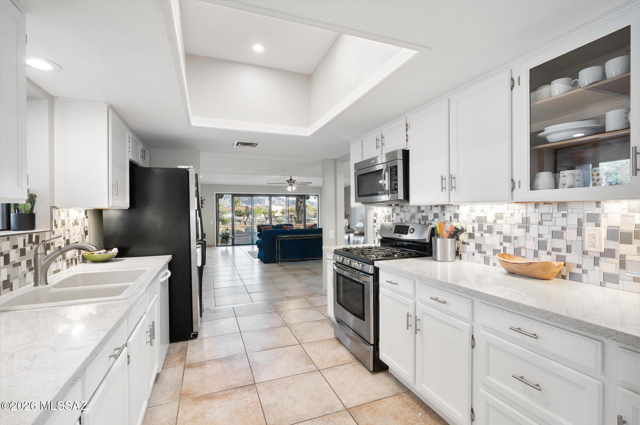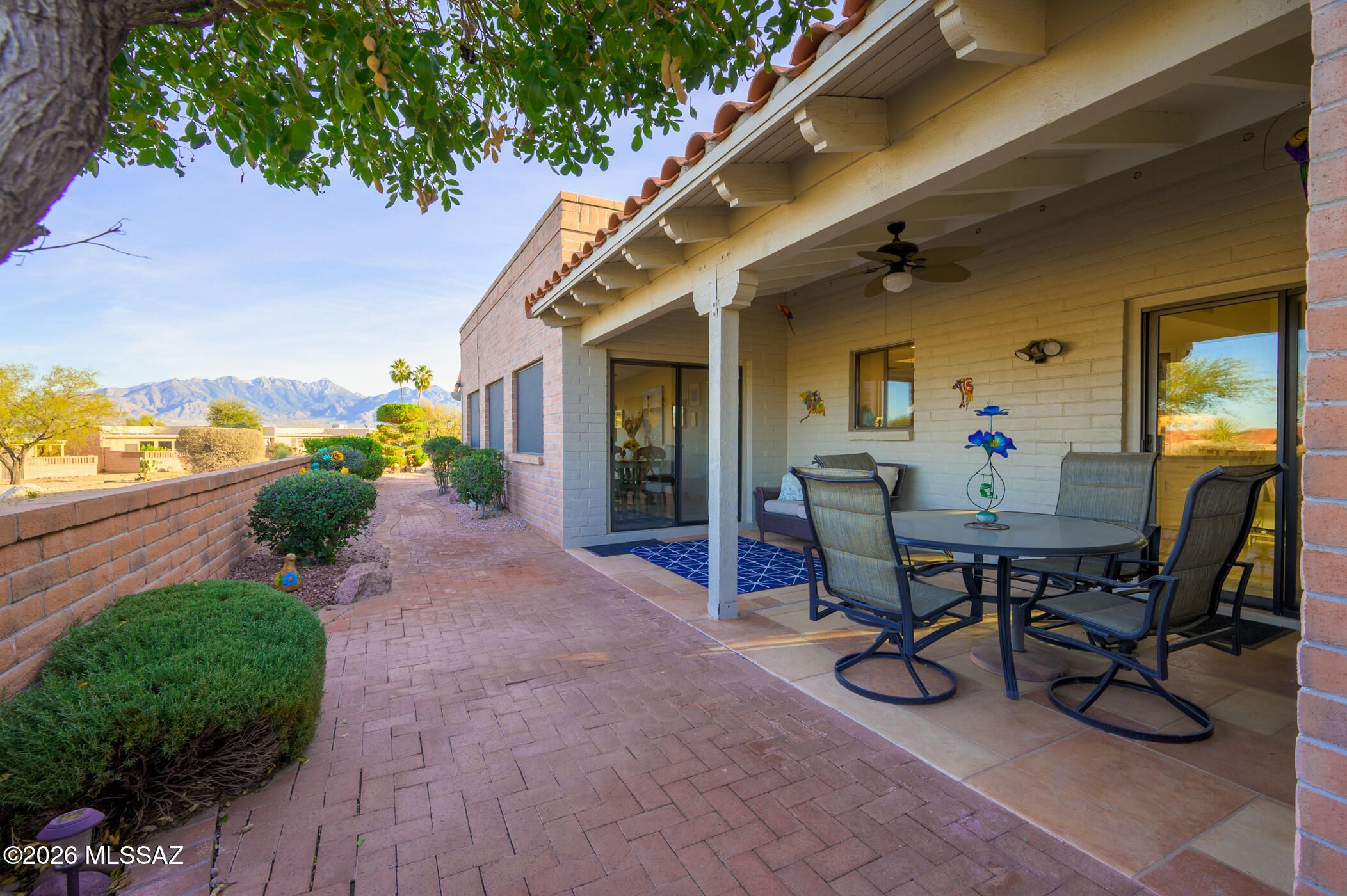 Step into the warmth and character of this classic red brick territorial home, where timeless Southwest charm meets inviting modern comfort. Beyond the front gate is a private courtyard, its brick pavers richly set the tone for the peaceful retreat that awaits inside. A bright skylit entry welcomes you with oversized tile flooring and a cheerful, uplifting ambiance. The moment you reach the living area, a dramatic wall of glass steals your attention--framing sweeping mountain vistas that turn everyday living into a breathtaking experience. Entertaining is effortless with a discreetly tucked-away wet bar featuring a sink, cabinetry, and shelving hidden behind louvered doors. The open layout flows seamlessly into a beautifully appointed kitchen offering expansive quartz counters,