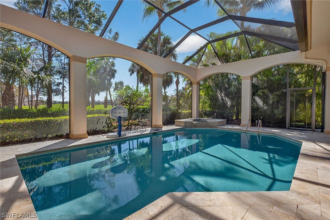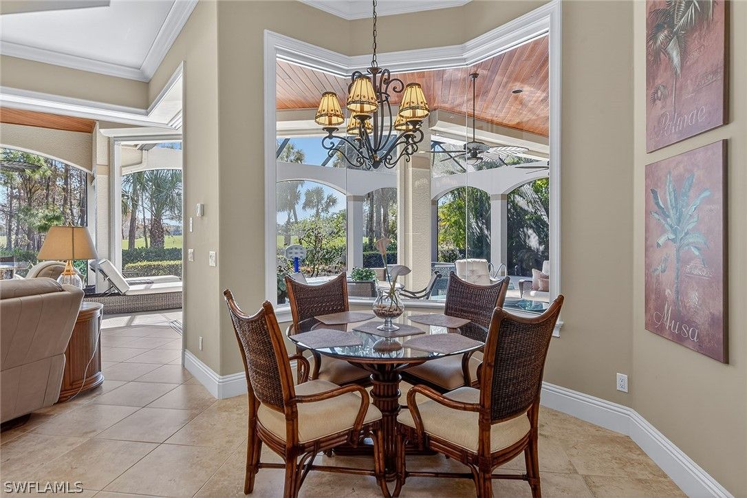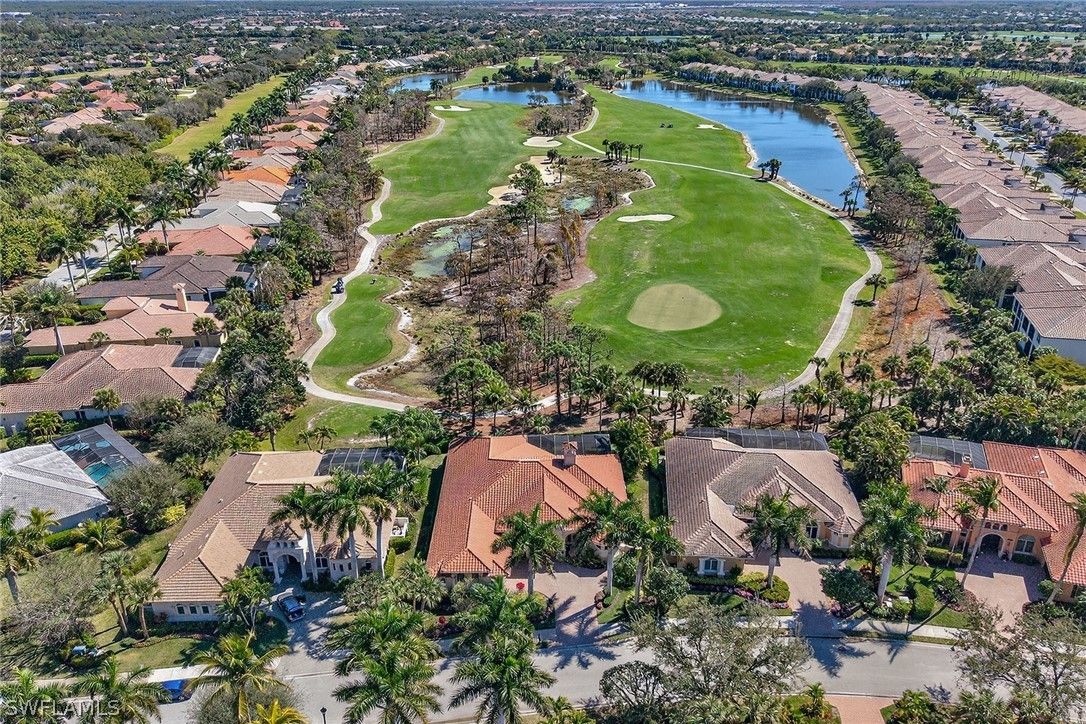 Enjoy sweeping views of the Rookery Golf Course from this light-filled residence in Mahogany Bend within the prestigious community of Fiddler’s Creek. Designed to capture the beauty of its surroundings, large windows frame lush fairways and tropical landscaping while filling the home with natural light. Offering four bedrooms plus a den, four baths and a two-car attached garage, this spacious residence combines refined architectural details with a comfortable, open layout ideal for everyday living and entertaining. Inside, the bright and welcoming interiors feature tasteful wall colors, recessed lighting and elegant crown molding throughout. Tile flooring laid on the diagonal flows seamlessly through the main living areas, enhancing the home’s open feel. The living room is sophisticated and inviting, highlighted by a coffered ceiling, fireplace, crown molding, and expansive views of the outdoor living areas and golf course beyond. The kitchen is thoughtfully designed for style and function, featuring white cabinetry, a tile backsplash, under-cabinet lighting and a convenient three-seat bar for casual dining. Premium KitchenAid stainless steel appliances include a gas cooktop with a hood, French door refrigerator, wall oven and microwave. Nearby, the family room offers a relaxed gathering space with crown molding, a tray ceiling, recessed lighting and a built-in entertainment center, all complemented by beautiful outdoor views. A private den with French double-door entry, a tray ceiling, recessed lighting and an arched window provides the ideal home office or quiet retreat. The expansive primary suite features a tray ceiling, recessed lighting, a comfortable seating area and two walk-in closets. The primary bath includes a double vanity, large soaking tub, walk-in shower and a private water closet. The guest suites are bright and inviting, featuring crown molding and abundant natural light. Two offer private en-suite baths, while the third is conveniently near a well-appointed full bath with a glass-enclosed shower, providing comfort and privacy for family and visitors. Outdoor living is a highlight with a large screened lanai offering panoramic golf course views and multiple seating and entertaining areas. The space is complete with a full outdoor kitchen featuring an island and tile backsplash, a ceiling fan and a heated pool and spa, creating an inviting setting for year-round enjoyment. Additional conveniences include a well-equipped laundry room with an LG washer and dryer, a utility sink and upper cabinetry for storage. Residents enjoy an award-winning gated community with resort-style amenities, including a pool, the Gator Grille for casual dining, Caxambas for fine dining, fitness center, spa services, tennis and an active pickleball program with 10 courts, along with a full calendar of social events. Optional memberships offer access to the championship golf course, new golf clubhouse, marina and beach club.