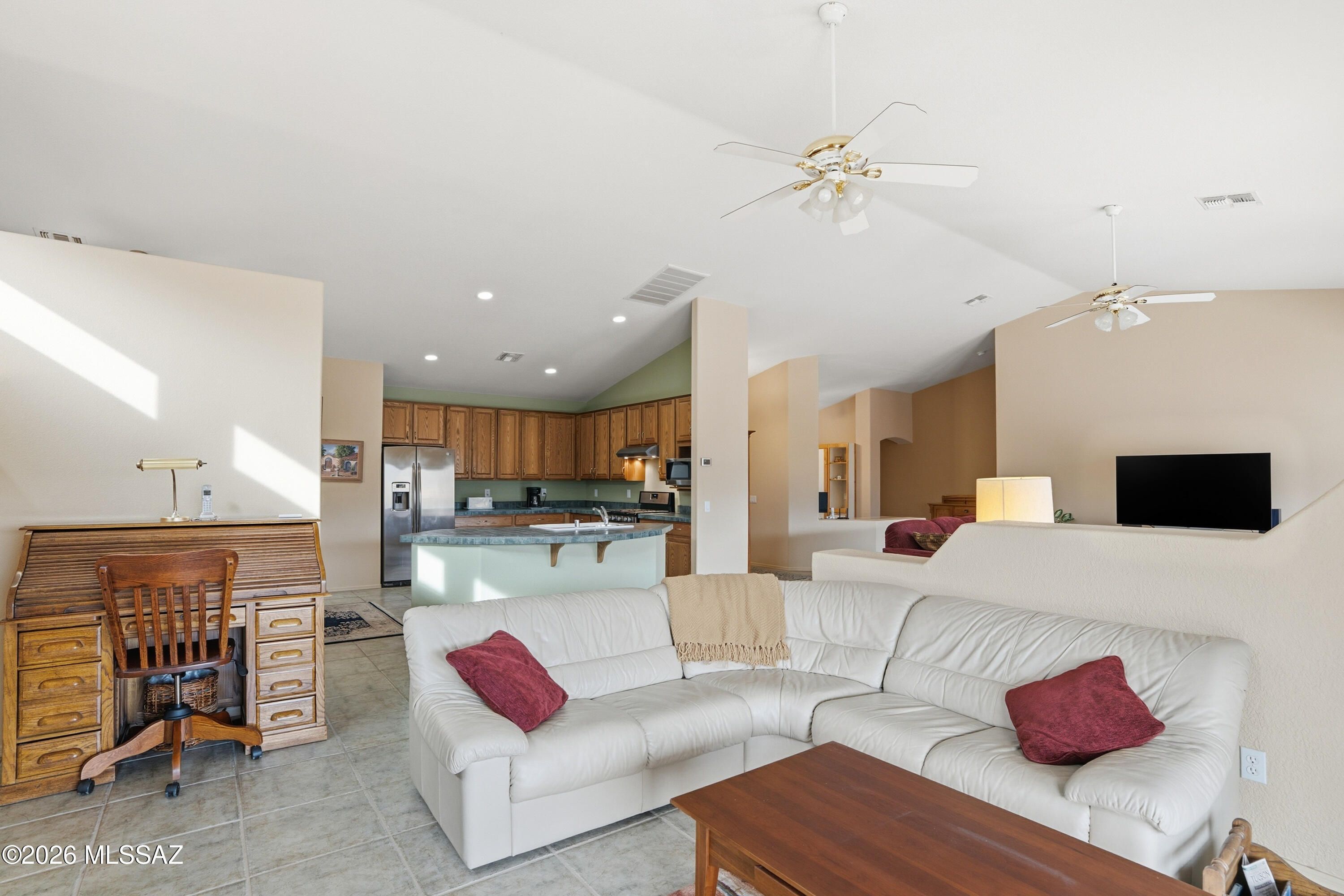 Located in the highly desirable active adult community of SaddleBrooke, this spacious 2,298 sq ft home sits on a fabulous view lot and offers exceptional indoor-outdoor living. The open-concept floor plan welcomes you with lovely living and family rooms, perfect for relaxing or entertaining, all designed to take advantage of the stunning views. The home flows seamlessly into a very large kitchen featuring abundant cabinetry and expansive countertops -- truly a chef's dream. The generous owner's suite offers beautiful views, private patio access, and a well-appointed ensuite bath with double vanities, walk-in shower, and walk-in closet. A split floor plan ensures privacy for guests, while the additional den provides a flexible space for work or hobbies.