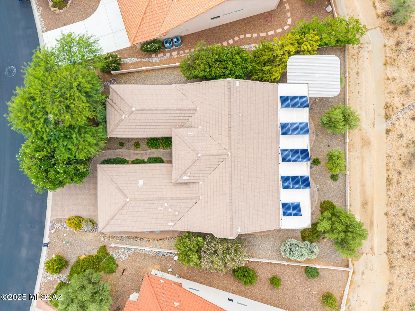 Beautiful energy-efficient 2-bed, 2-bath home is the one you've been waiting for! Providing owned solar, covering most of the electric bill. Interior features vaulted ceilings, Travertine tile flooring and throughout the bathrooms, fresh neutral paint. Spacious open floor plan, filled w/natural light, creates an airy ambiance & effortless flow. Upscale kitchen displays recessed lighting, oak cabinets with custom slide outs, upgraded SS appliances, tile backsplash, granite counters, an island, & a cozy dining area w/a bay window. Large main retreat offers double door entry, an ensuite w/two vanities, soaking tub, & a walk-in closet. Make the open den a formal dining room or office. Enjoy privacy and wildlife from the full-length covered patio. Full yard is on auto drip system and lighting.