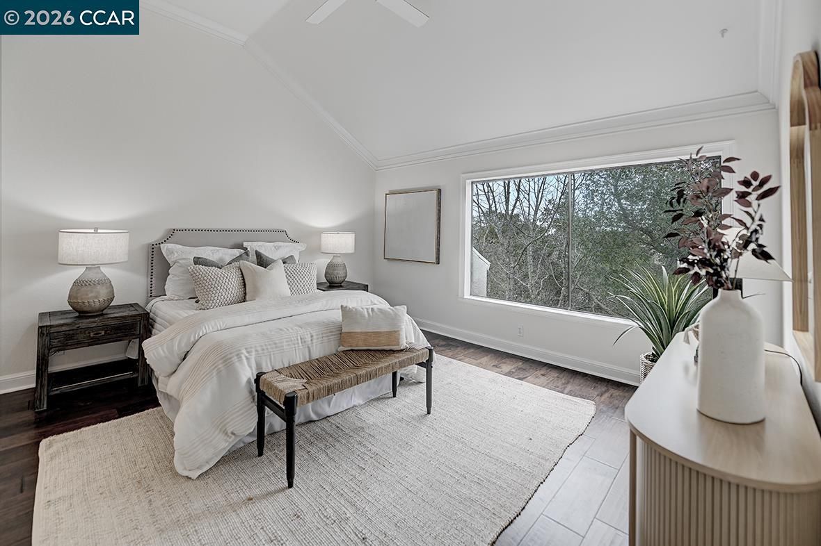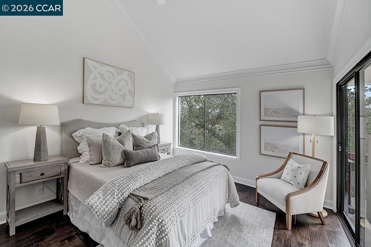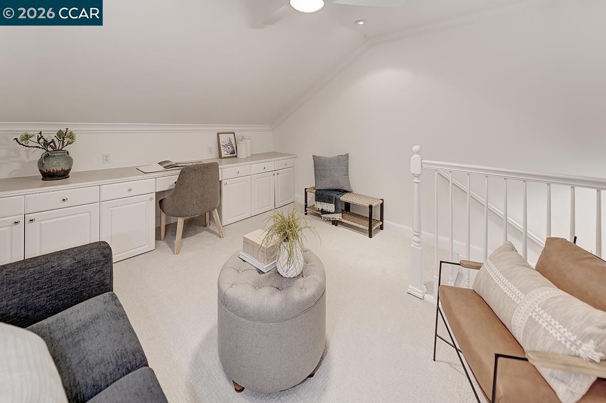 Tucked into a peaceful, tree-lined setting in Rossmoor, this sought-after Villa Verde model offers privacy, light, and style. Featuring 2 bedrooms, 2 baths, and a finished loft/den, the open floor plan is filled with natural light from oversized windows and tranquil hillside views. Enjoy seamless indoor-outdoor living on the expansive deck surrounded by mature trees—ideal for morning coffee, sunset wine, or entertaining guests. Designer touches include high ceilings, hardwood floors, new carpet, wainscoting, crown molding, and updated lighting and fixtures throughout. The eat-in kitchen features white cabinetry, granite countertops, a stainless refrigerator, white appliances, and plantation shutters framing serene views. The living room offers an electric fireplace and mounted flat-screen TV, creating a warm, inviting space to gather. The primary suite includes a walk-in closet and ensuite bath with soaking tub and double-sink vanity. The guest bedroom opens directly to the deck, perfect for visitors. A finished loft w/built-in desk, serviced by central H/A is ideal for a home office or flex space. In-home laundry & attached painted garage w/ epoxy floor complete this move-in-ready retreat.