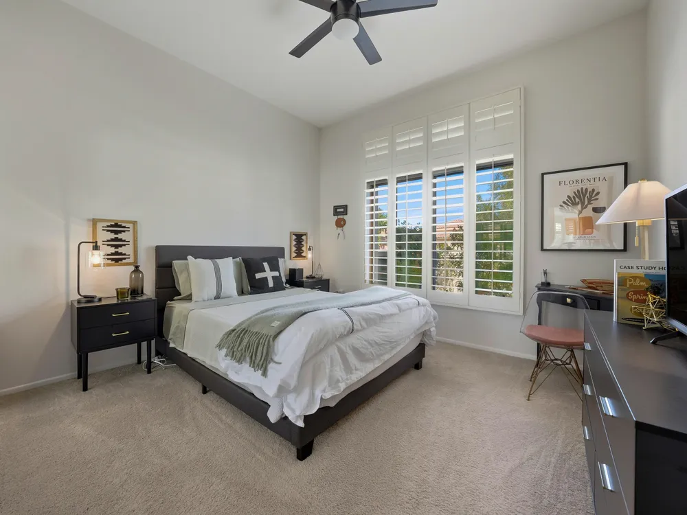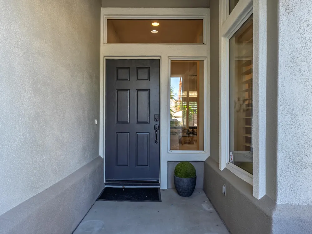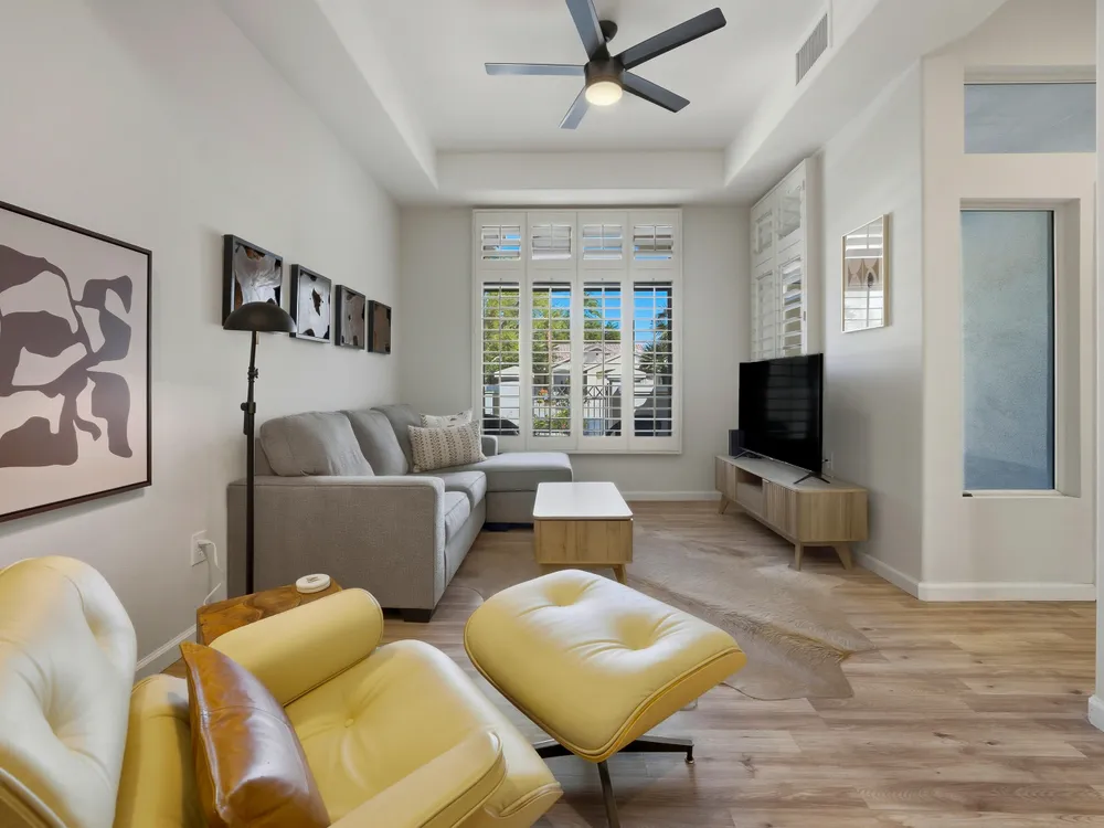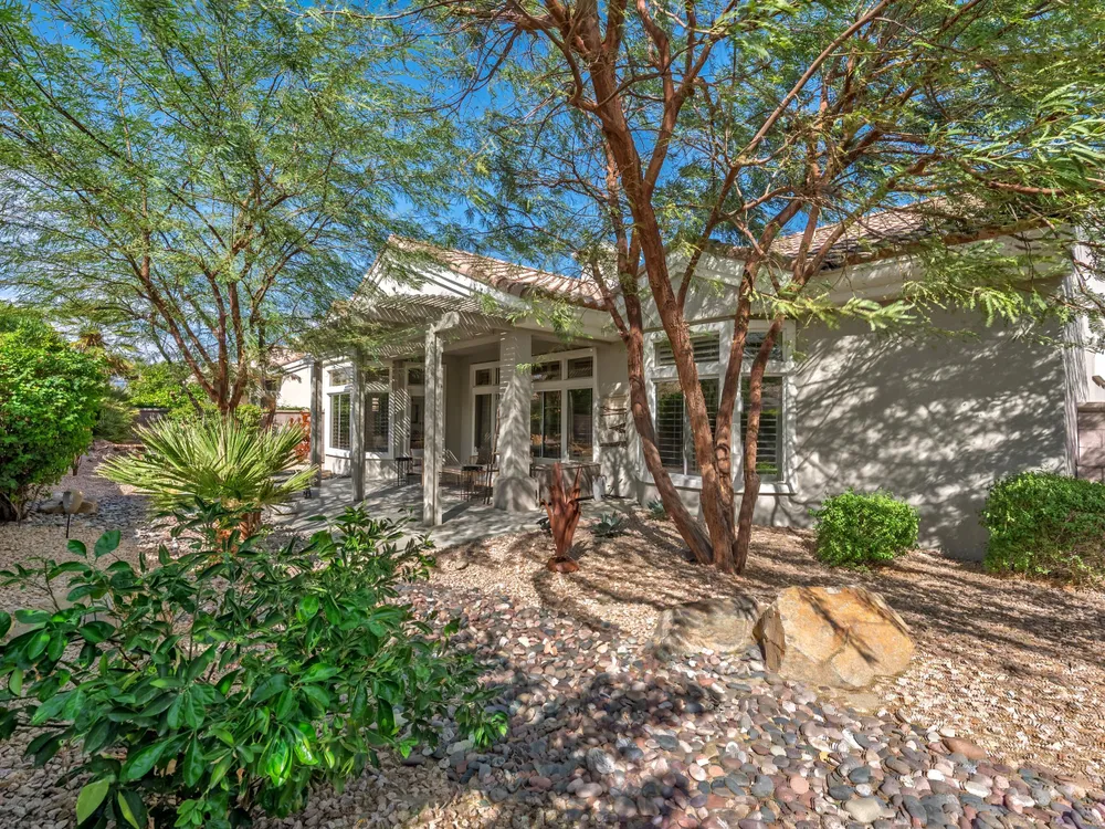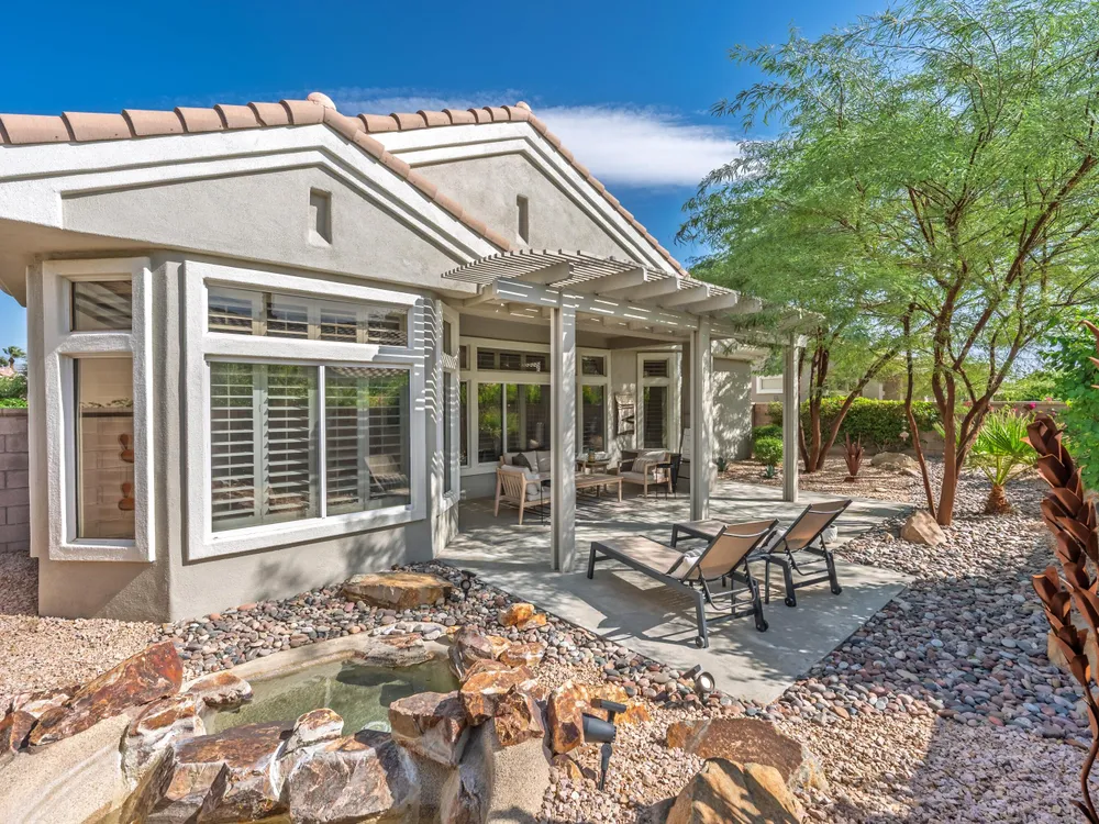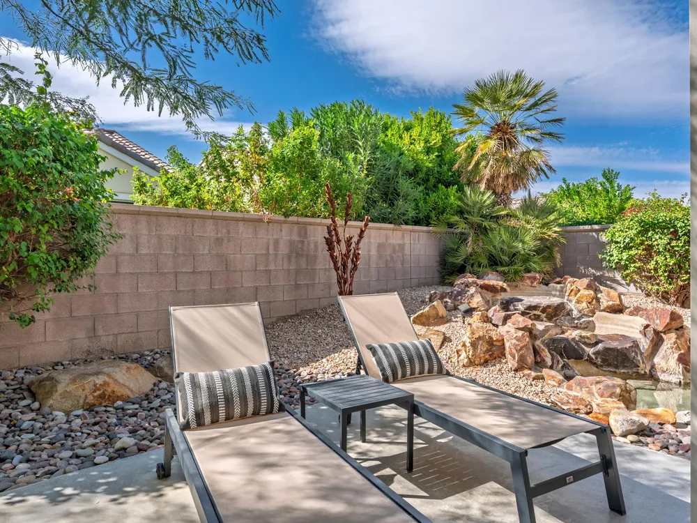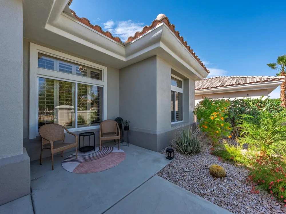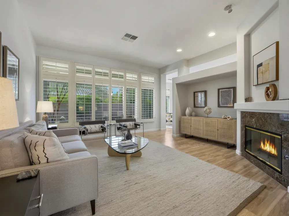 Sun City Palm Desert - Lenox. This beautifully updated Lenox model is move-in ready and exudes modern desert charm. Inside, luxury vinyl plank flooring is featured throughout, with tile in the bathrooms. Ten-foot ceilings and transom windows create a bright, open atmosphere. Upgraded lighting, fans, hardware, baseboards, and plantation shutters enhance the home's fresh, contemporary feel. The living room offers a cozy gas fireplace with a marble tile surround and a spacious media niche. The kitchen showcases quartz countertops, a subway tile backsplash, stainless steel appliances, and an upgraded sink and fixtures. Just off the living room is a versatile den or office. The primary suite features a bay window and a large walk-in closet. Its bathroom includes 12''x24'' tile flooring, a glass-enclosed stall shower, and a quartz-topped vanity with dual sinks, updated fixtures, and mirrors. The guest bathroom is similarly upgraded and includes a tub/shower combination. The laundry room provides generous storage space, and the two-car garage includes a convenient golf cart nook. Additional upgrades include a new top level air conditioner & furnace installed in 2024. Curb appeal abounds with an updated exterior paint scheme and a gated front courtyard. The rear yard offers an extended patio, alumawood patio cover, and a soothing water feature surrounded by lush desert landscaping — the perfect setting for relaxing or entertaining