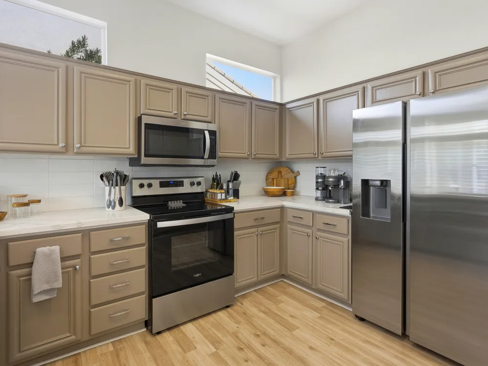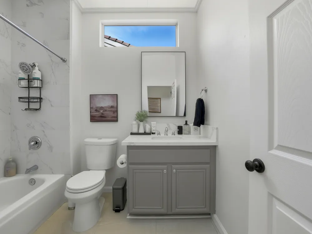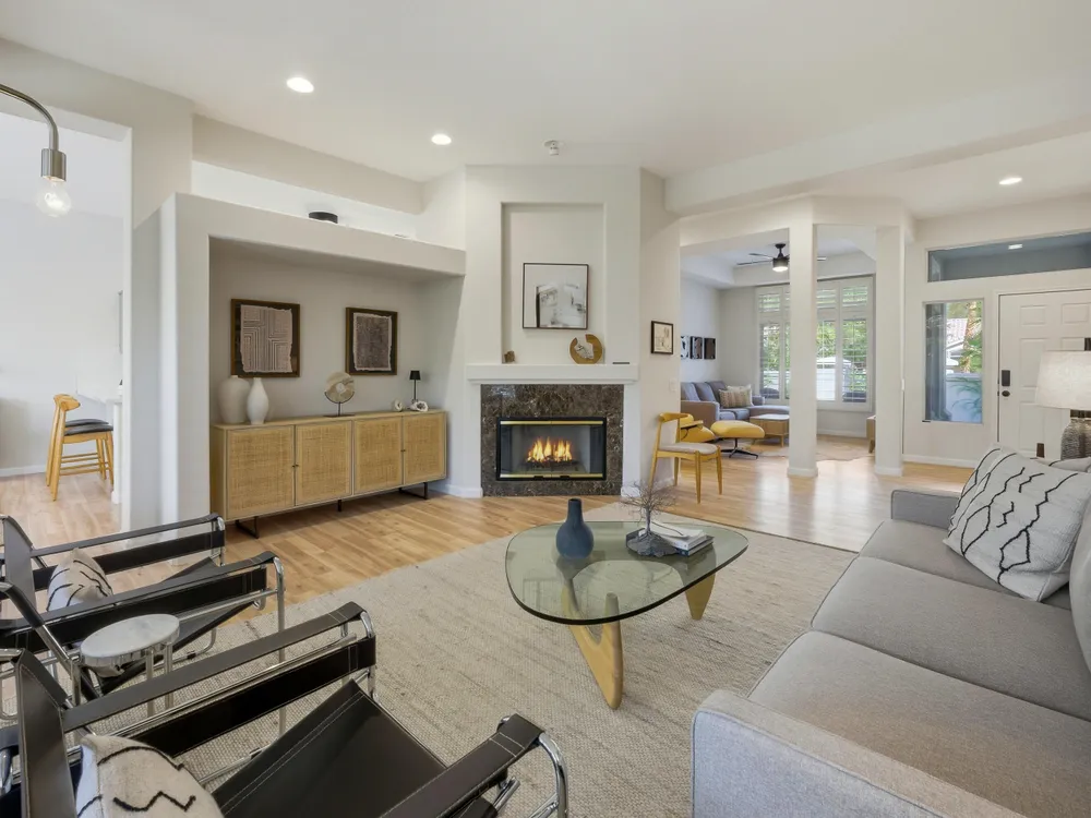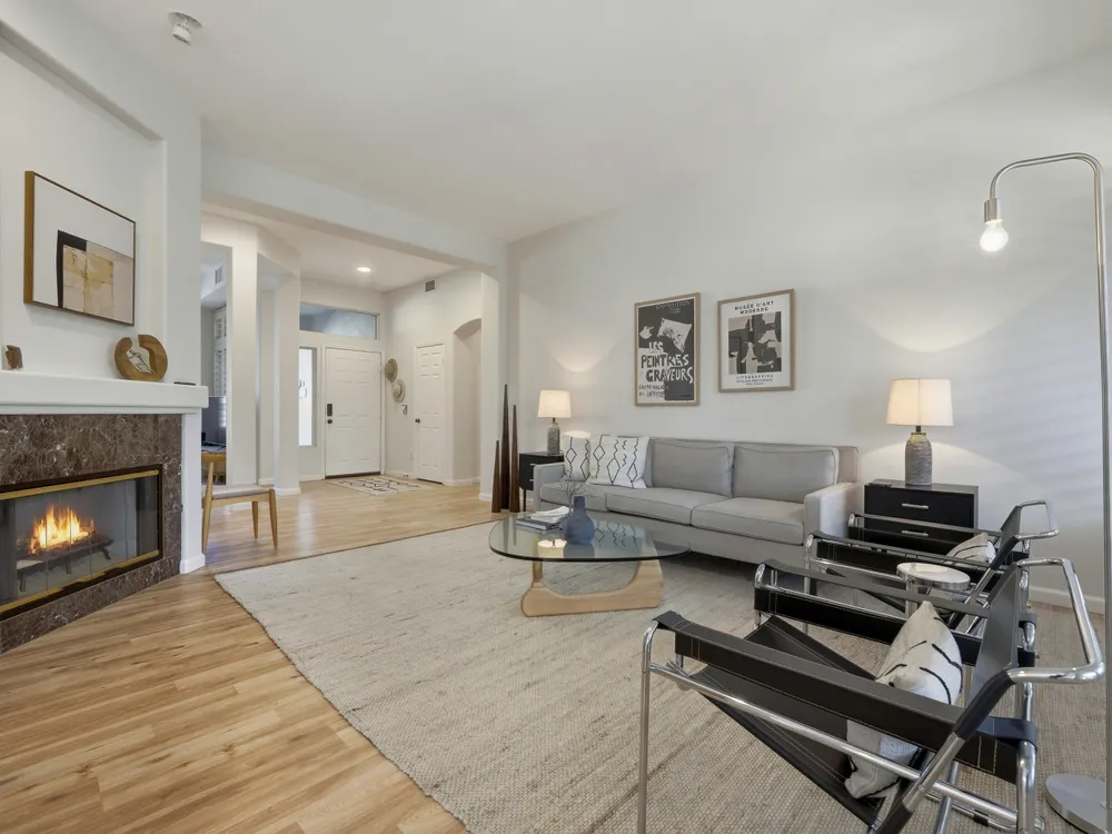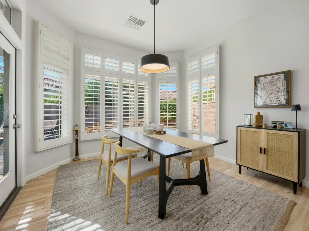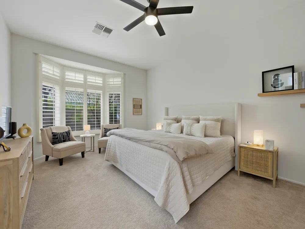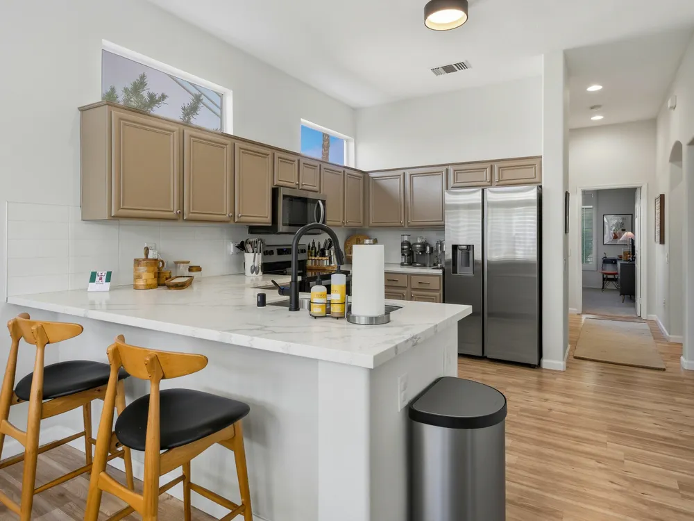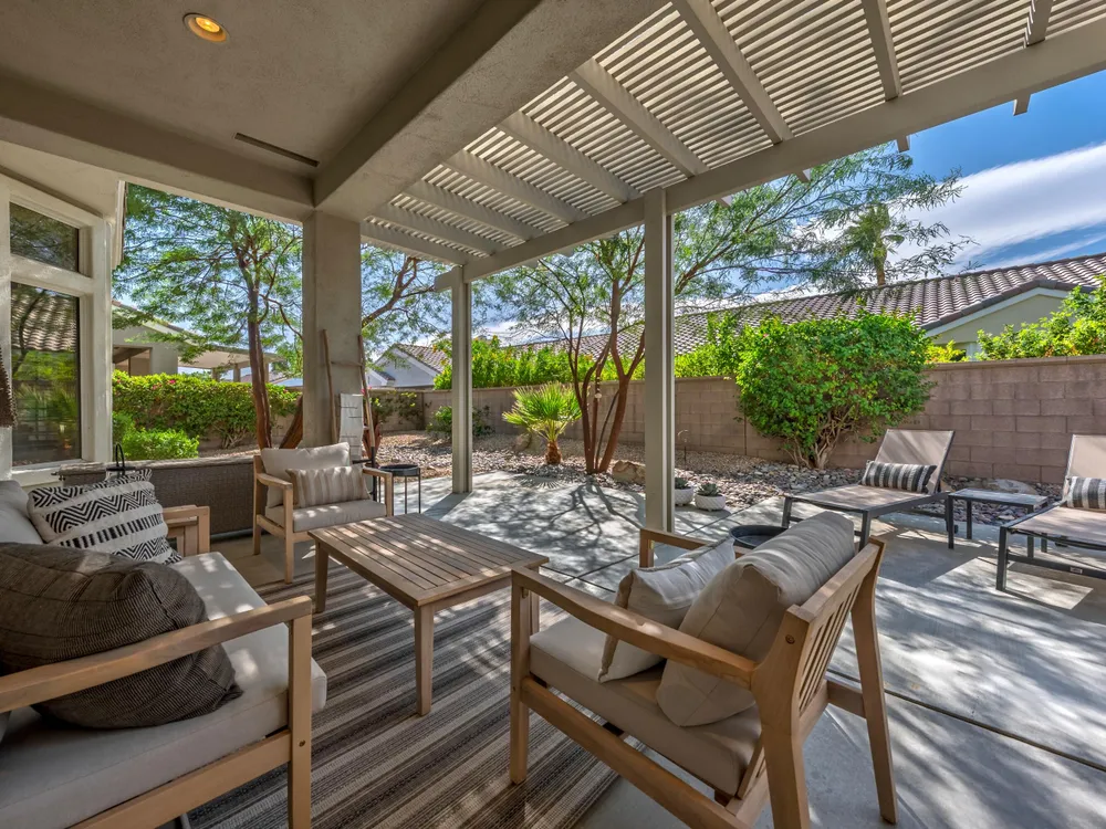 Sun City Palm Desert - Lenox. This beautifully updated Lenox model is move-in ready and exudes modern desert charm. Inside, luxury vinyl plank flooring is featured throughout, with tile in the bathrooms. Ten-foot ceilings and transom windows create a bright, open atmosphere. Upgraded lighting, fans, hardware, baseboards, and plantation shutters enhance the home's fresh, contemporary feel. The living room offers a cozy gas fireplace with a marble tile surround and a spacious media niche. The kitchen showcases quartz countertops, a subway tile backsplash, stainless steel appliances, and an upgraded sink and fixtures. Just off the living room is a versatile den or office. The primary suite features a bay window and a large walk-in closet. Its bathroom includes 12''x24'' tile flooring, a glass-enclosed stall shower, and a quartz-topped vanity with dual sinks, updated fixtures, and mirrors. The guest bathroom is similarly upgraded and includes a tub/shower combination. The laundry room provides generous storage space, and the two-car garage includes a convenient golf cart nook. Additional upgrades include a new top level air conditioner & furnace installed in 2024. Curb appeal abounds with an updated exterior paint scheme and a gated front courtyard. The rear yard offers an extended patio, alumawood patio cover, and a soothing water feature surrounded by lush desert landscaping — the perfect setting for relaxing or entertaining