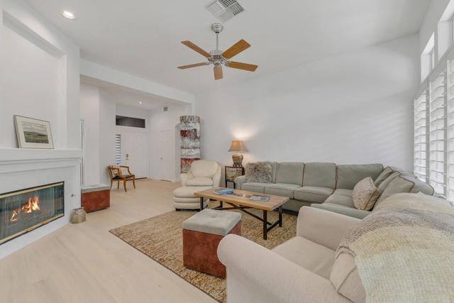 Welcome to this Lenox model with exceptional curb appeal, highlighted by a private front courtyard and a brand-new ornamental wrought iron gate that creates a charming and inviting entrance. This beautifully appointed 2-bedroom, 2-bath residence with a versatile den offers a bright, open layout designed for comfortable living and effortless entertainment. High ceilings, transom windows, and expansive picture and bay windows fill the home with abundant natural light while creating a seamless connection to the outdoors. The interior showcases stylish newer neutral- color tile plank flooring all throughout, upgraded baseboards, and a completely carpet-free design for a clean, modern look. The open-concept kitchen features an eating bar and generous counter space, flowing seamlessly into the dining area with charming bay windows overlooking the backyard. The spacious primary suite serves as a private retreat, complete with dual vanities, a large enclosed shower, and a walk-in closet enhanced with a custom organization system. A desirable split floor plan positions the guest bedroom and bathroom on the opposite side of the home, ensuring privacy for family or visitors. The den, featuring built-in shelving, offers flexible space ideal for a home office, reading lounge, hobby room, or additional guest accommodations. Outdoor living is equally impressive, with an extended covered patio and expanded hardscape providing ample space for dining, relaxing, and entertaining under the sun or evening stars. Inside laundry room with storage and utility closet. The 2-car garage features a golf cart nook, epoxy-coated flooring, and built-in storage cabinets for added functionality. Additional upgrades include a newer water heater, fresh interior paint, updated kitchen fixtures, and a high toilet in the guest bath. Furniture is available outside of escrow. A move-in-ready home offering comfort, style, and inviting indoor-outdoor living.