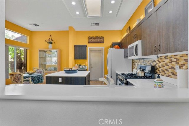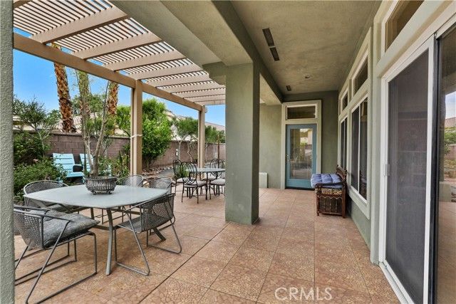 Beautifully maintained 2-bedroom, 2-bath Fostoria model located in Sun City Palm Desert, a premier 55+ community, offering an inviting blend of comfort and functionality. This residence features a private gated courtyard and an open floor plan with approximately 10-foot ceilings, transom windows, designer paint, and tile flooring throughout the main living areas, creating a light and spacious environment. The great room is filled with natural light and flows into a versatile den, with direct access to the rear yard, providing a seamless indoor-outdoor living experience. The kitchen includes a skylight, pantry, oversized island, and abundant cabinetry, offering ample space for meal preparation and storage. The primary suite features double door entry, dual vanities, a soaking tub, separate shower, a glass block window for natural light, and a walk-in closet with built-in organizers. The guest bedroom and bathroom are thoughtfully positioned on the opposite side of the home for added privacy. Additional features include an indoor laundry area and a two-car garage with storage cabinets. The rear yard offers a covered patio and landscaped areas suitable for outdoor enjoyment. Community amenities may include golf courses, clubhouses, pools, spas, dining, and recreational facilities; buyer to verify all features, amenities, and HOA information to their satisfaction.