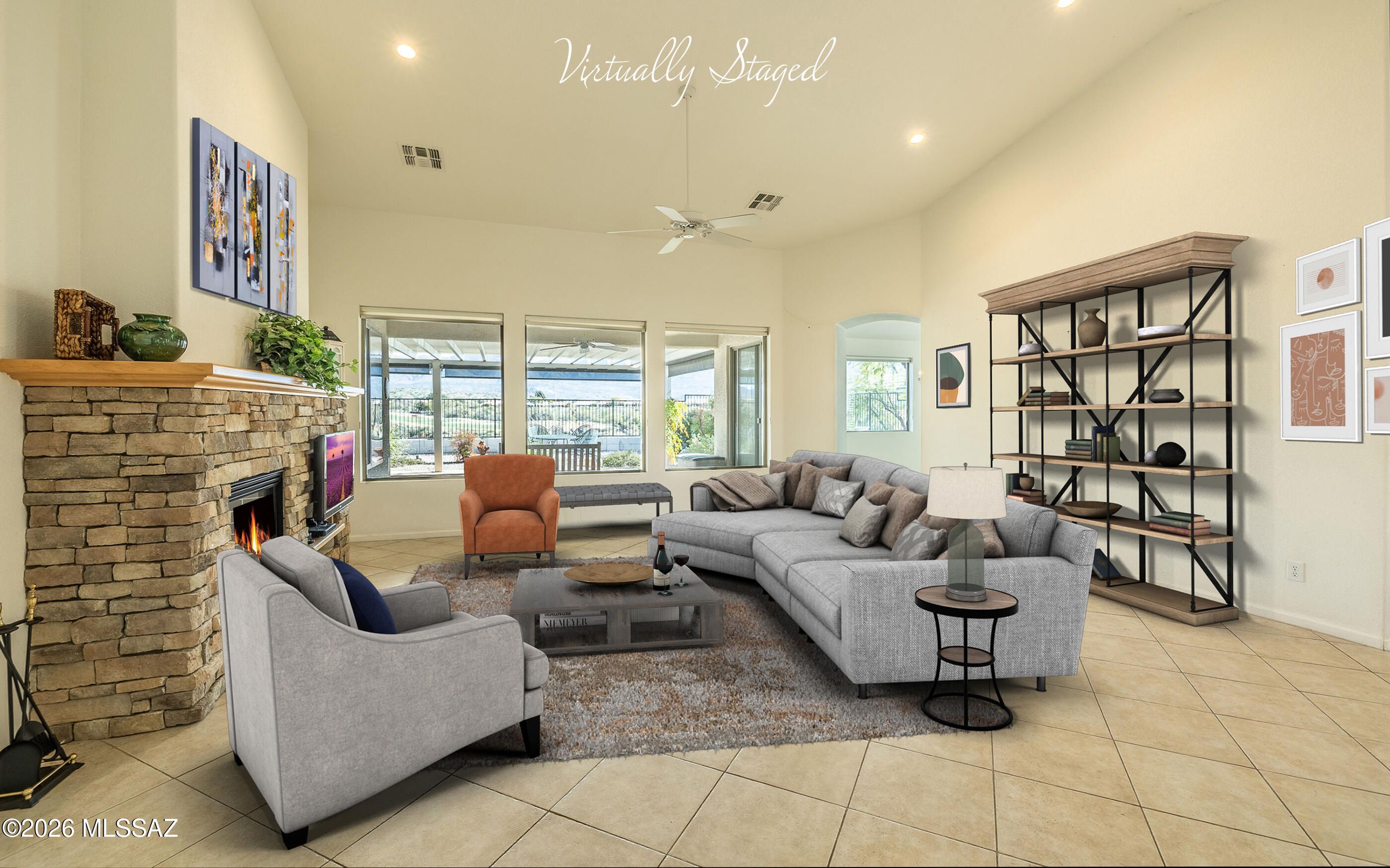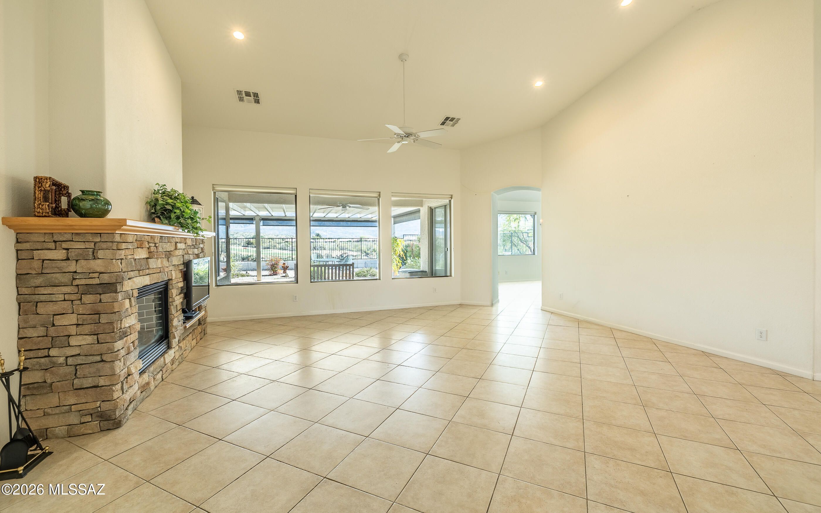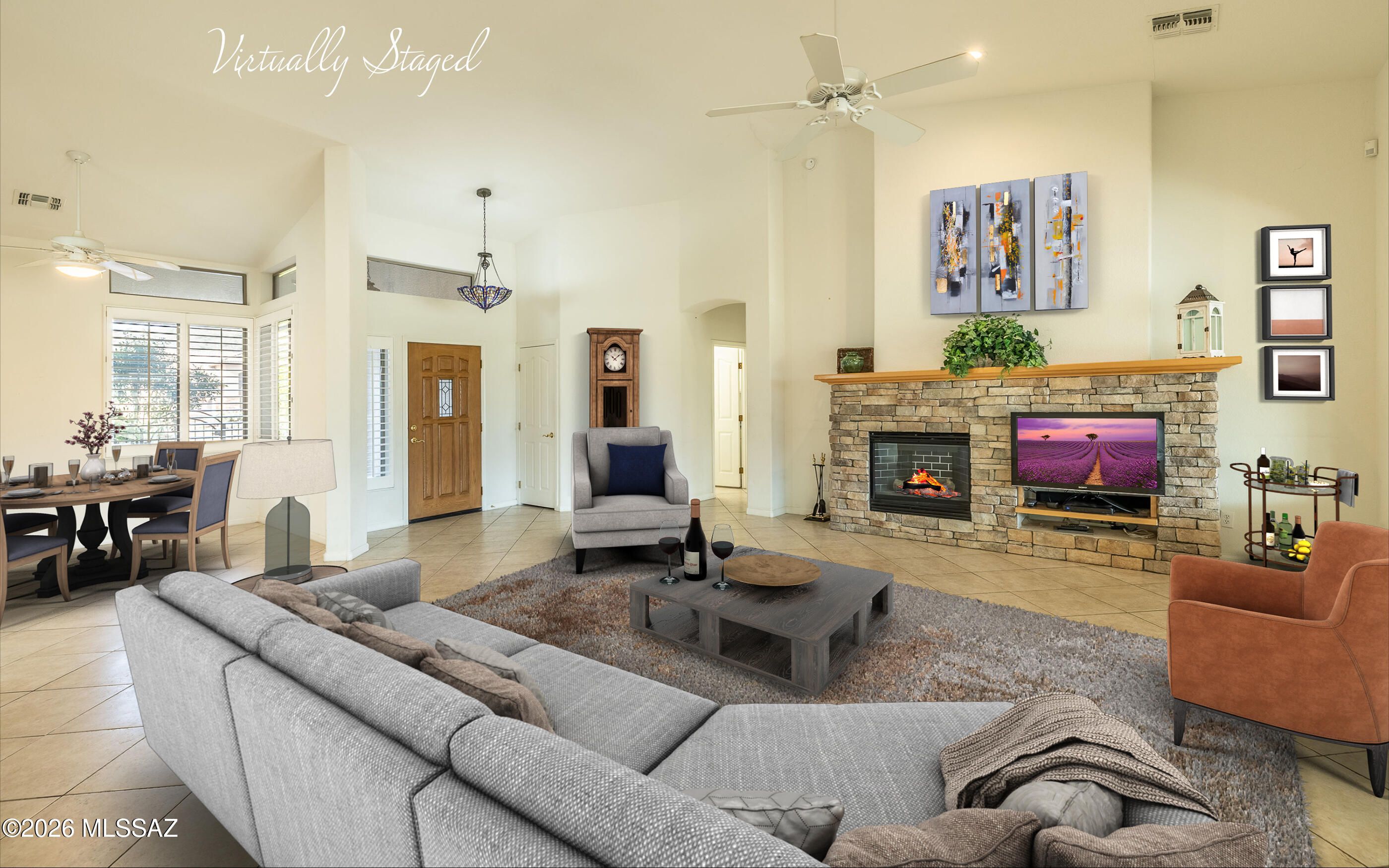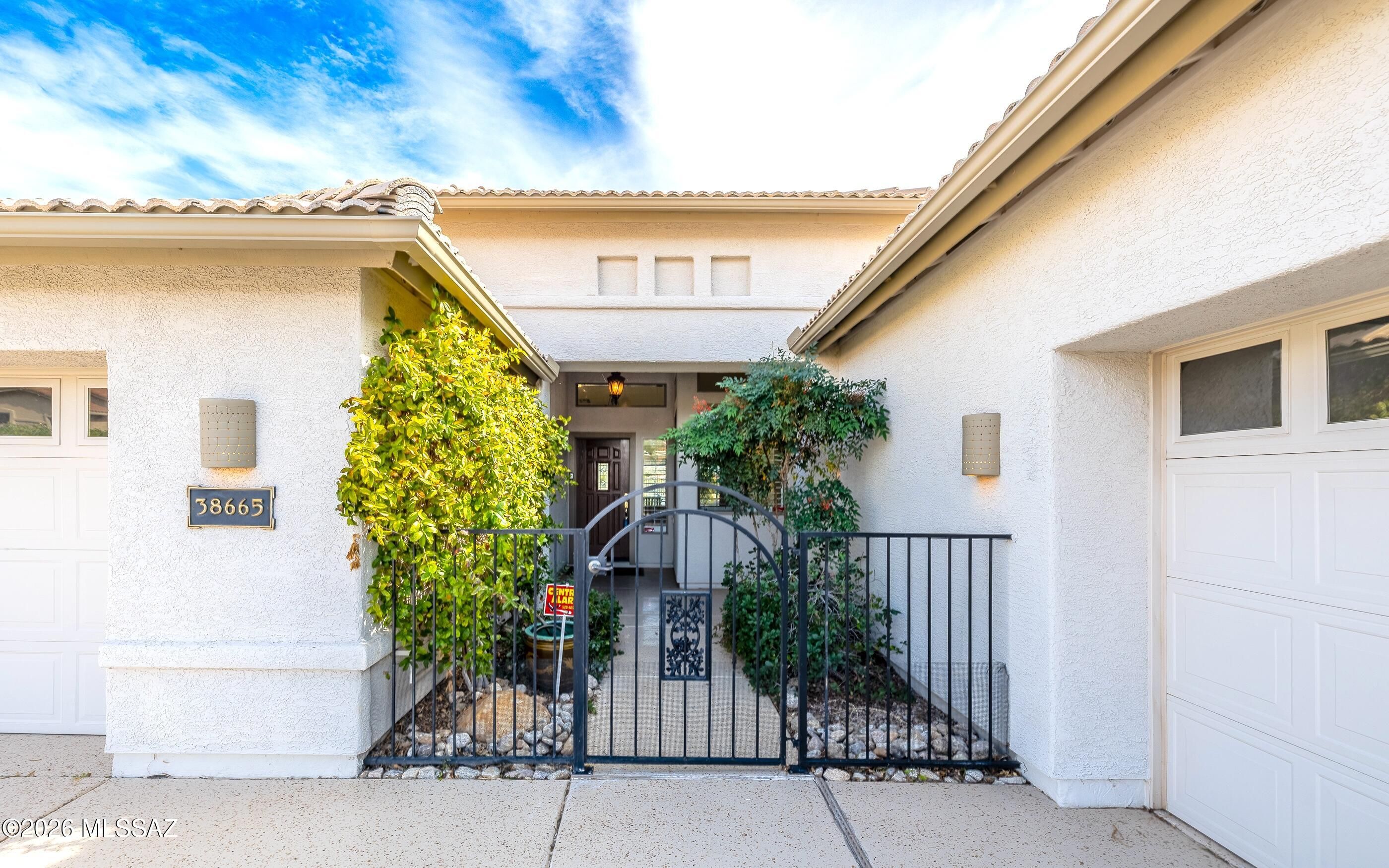 Ideal location and orientation - lovely Catalina Mountain, nature and golf cart views. Very private location for this Dakota floor plan- extra privacy on south side. Highly desired full golf cart garage. Very spacious open gourmet kitchen w/granite countertops + all appliances conveying. Cozy and relaxing fireplace in family. room. Gaze into lovely views from a plethora of large scale windows. Enjoy your backyard oasis under the stylish Pergola and ever so peaceful and beautiful Koi pool. Home also hosts beautiful mature citrus trees. Single story living - spacious floor plan - lovely views-gated front courtyard and nice privacy. Abundant tile flooring throughout home along with beautiful planation shutters. Home is ready for quick move-in. Golf cart is available on separate Bill of Sale.