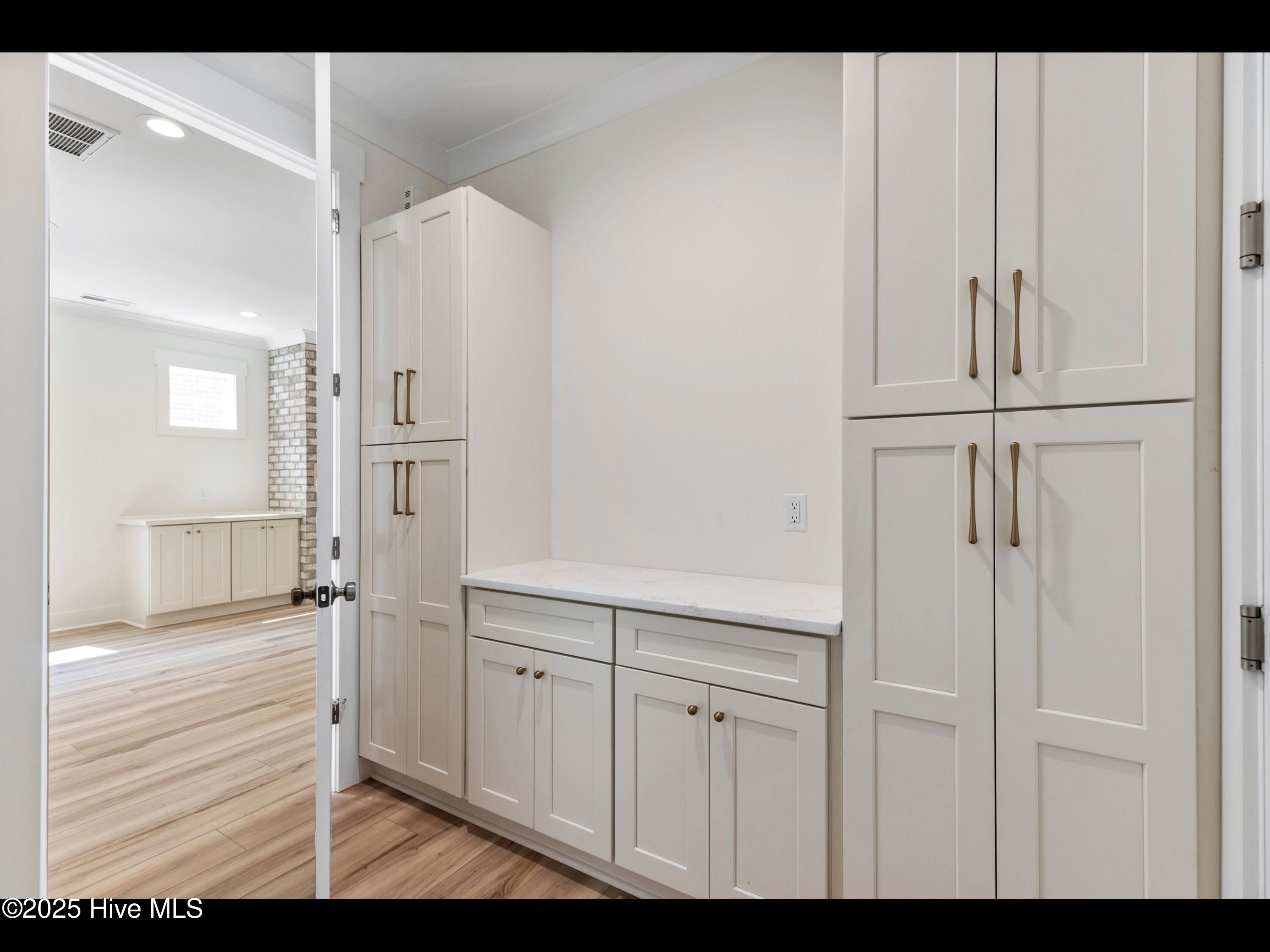 - Master Downstairs, Walk-In Closet(s), High Ceilings, Entrance Foyer, Mud Room, Solid Surface Counters, Ceiling Fan(s), Walk-In Shower, Kitchen/Dining Combo, Eat-in Kitchen