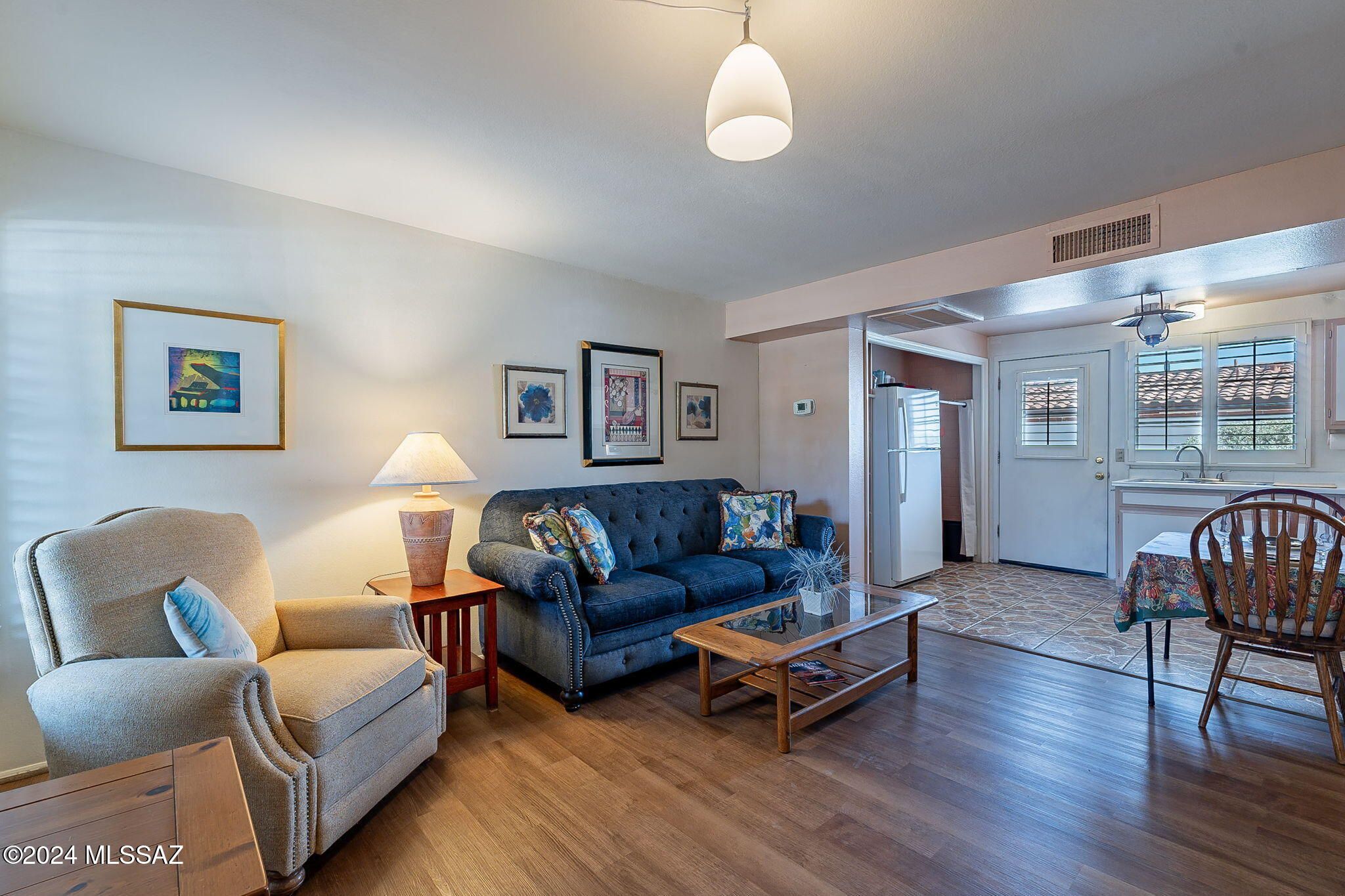 NO GVR at this 1 bedroom 1 bath Villa with rental history of $1,500 per month. Nicely set back from the street with a view of an HOA/COA park like setting beyond the front patio. Fully furnished. New Laminate Wood Look Flooring in 2024. Newer Full sized gas range/oven. Plantation Shutters throughout. Additional patio space in back of Villa. Convenient COA laundry facility just outside the back door of the Villa. Assigned parking space in front of Laundry Facility. Numerous Amenities including a COA Pool nearby. $410.00 Monthly HOA/COA includes water, sewer & trash & covers exterior maintenance inc roof, HVAC, water heater, pest control & common area maintenance, a few of the benefit of Villas West! The Green Valley lifestyle awaits w/Shopping, Farmers Market/s, Restaurants & Golf nearby.