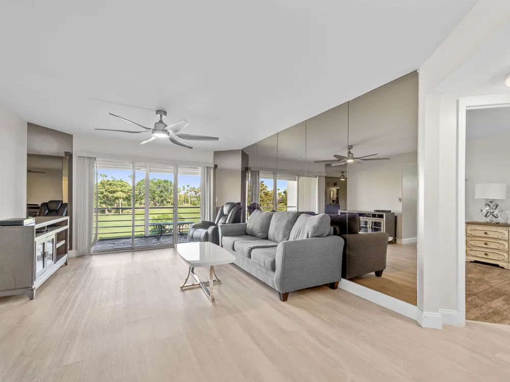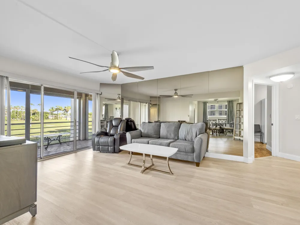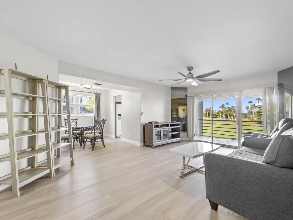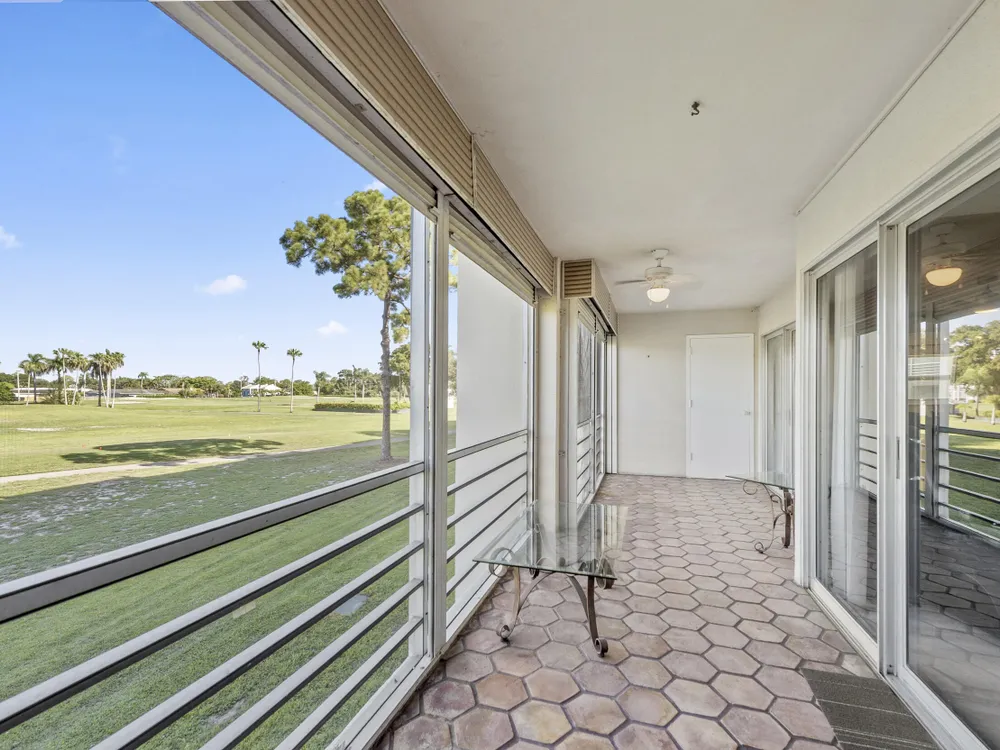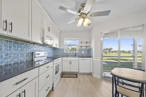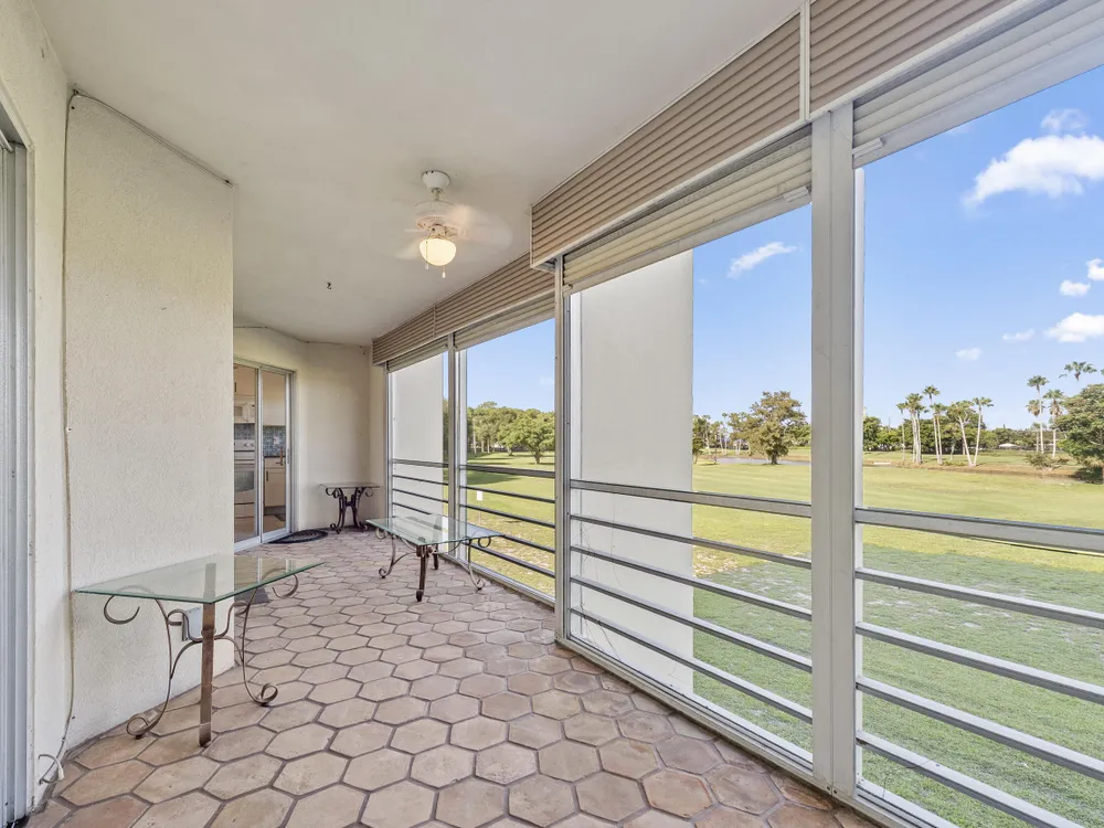 Welcome to this beautifully upgraded true corner unit in the highly sought-after 55+ community of Poinciana Place in Lake Worth! This spacious 2-bedroom, 2-bath condo is filled with natural light from extra windows and offers enhanced privacy with its end-unit location. Enjoy the Florida lifestyle from your oversized screened-in patio, where you'll be treated to expansive, panoramic views of the manicured golf course -- the perfect spot to relax with morning coffee or unwind at sunset. The patio also features roll-down hurricane shutters for added protection and peace of mind. Step inside to a bright, open layout featuring new modern ceiling fans and lighting fixtures throughout, along with tasteful new window treatments that complement the home's clean, updated look.