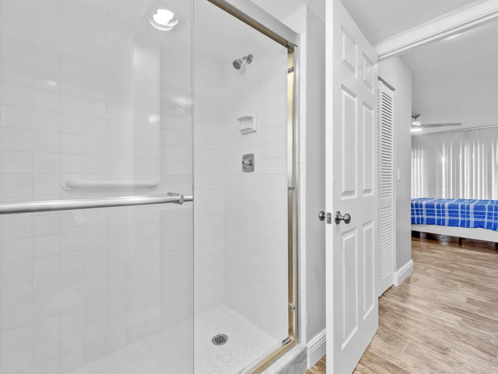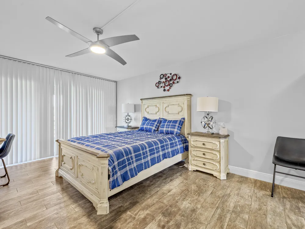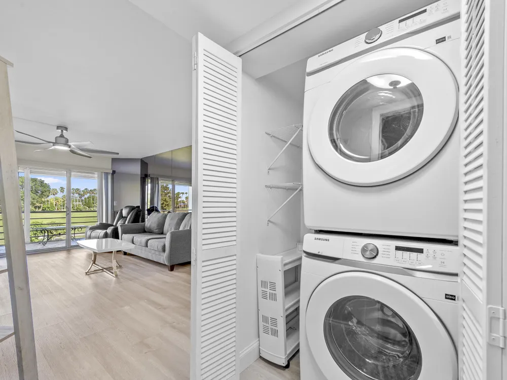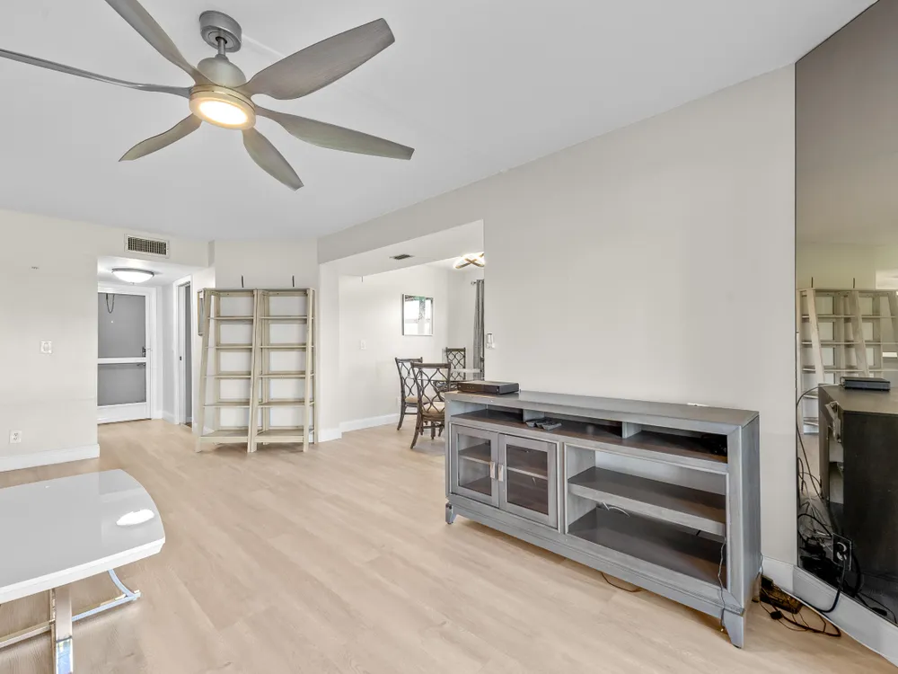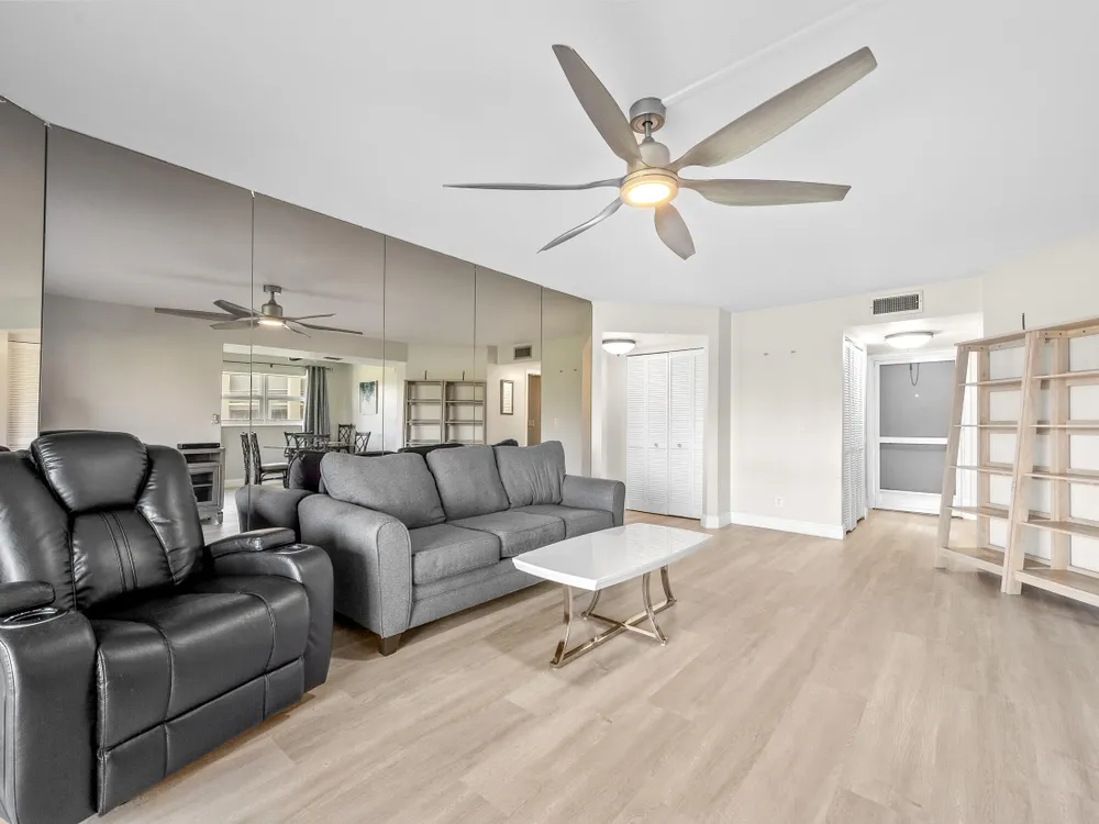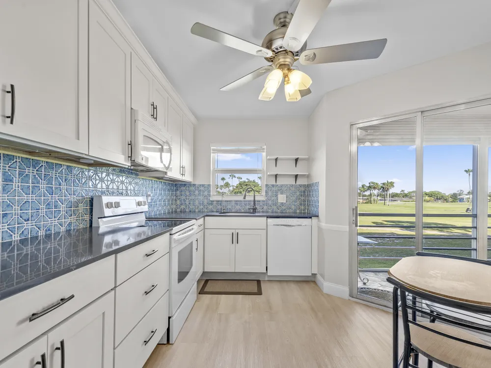 Welcome to this beautifully upgraded true corner unit in the highly sought-after 55+ community of Poinciana Place in Lake Worth! This spacious 2-bedroom, 2-bath condo is filled with natural light from extra windows and offers enhanced privacy with its end-unit location. Enjoy the Florida lifestyle from your oversized screened-in patio, where you'll be treated to expansive, panoramic views of the manicured golf course -- the perfect spot to relax with morning coffee or unwind at sunset. The patio also features roll-down hurricane shutters for added protection and peace of mind. Step inside to a bright, open layout featuring new modern ceiling fans and lighting fixtures throughout, along with tasteful new window treatments that complement the home's clean, updated look.
